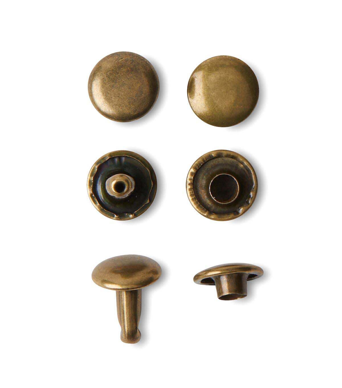 With their antique brass finish, these double cap rivets will give your project a vintage, yet timeless look. Use them as a decorative accent or to reinforce seams and corners. Applying them is easy with double-cap rivet tools, which you can find in our store.