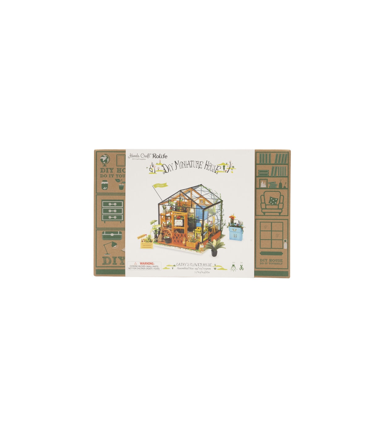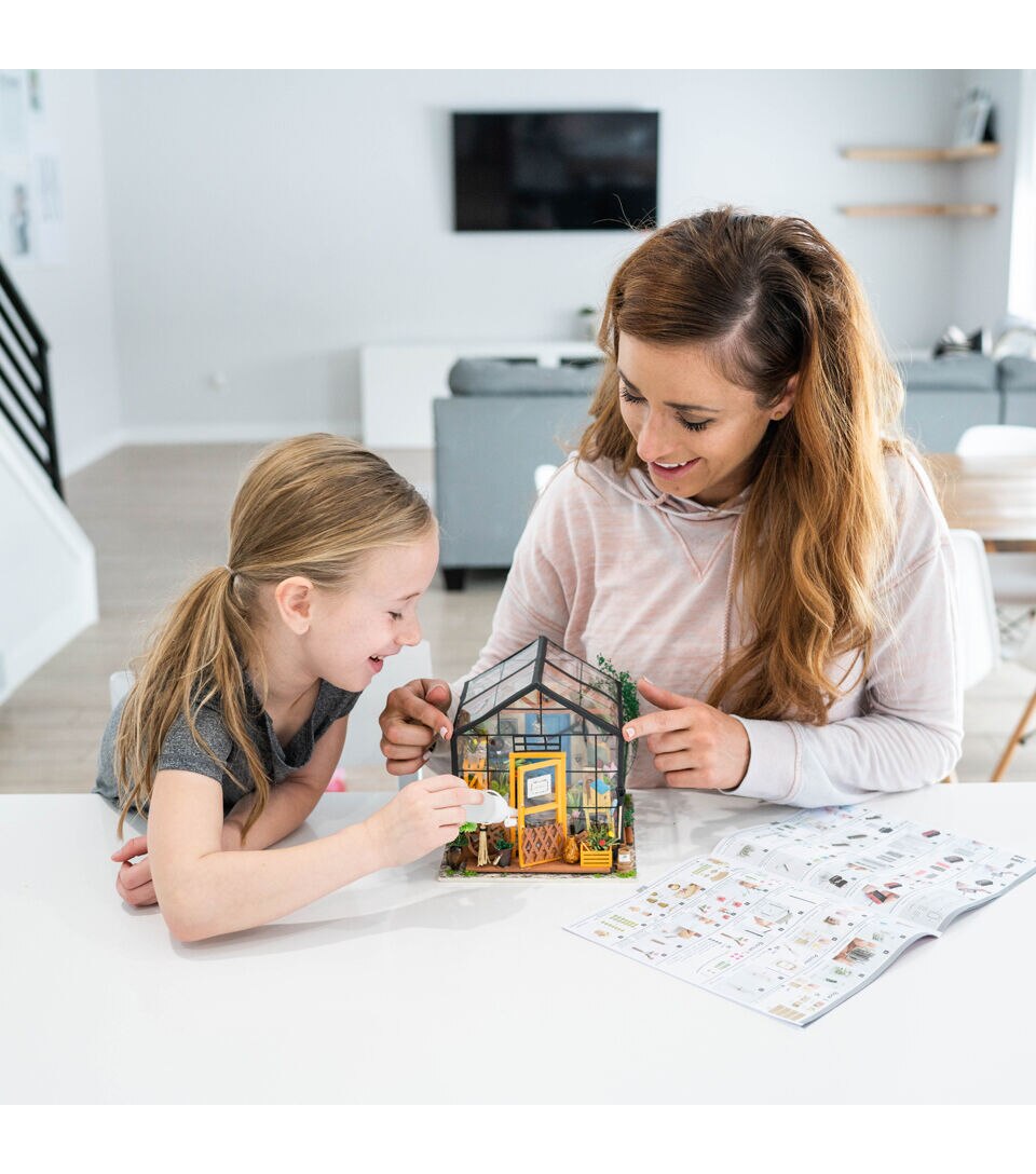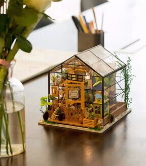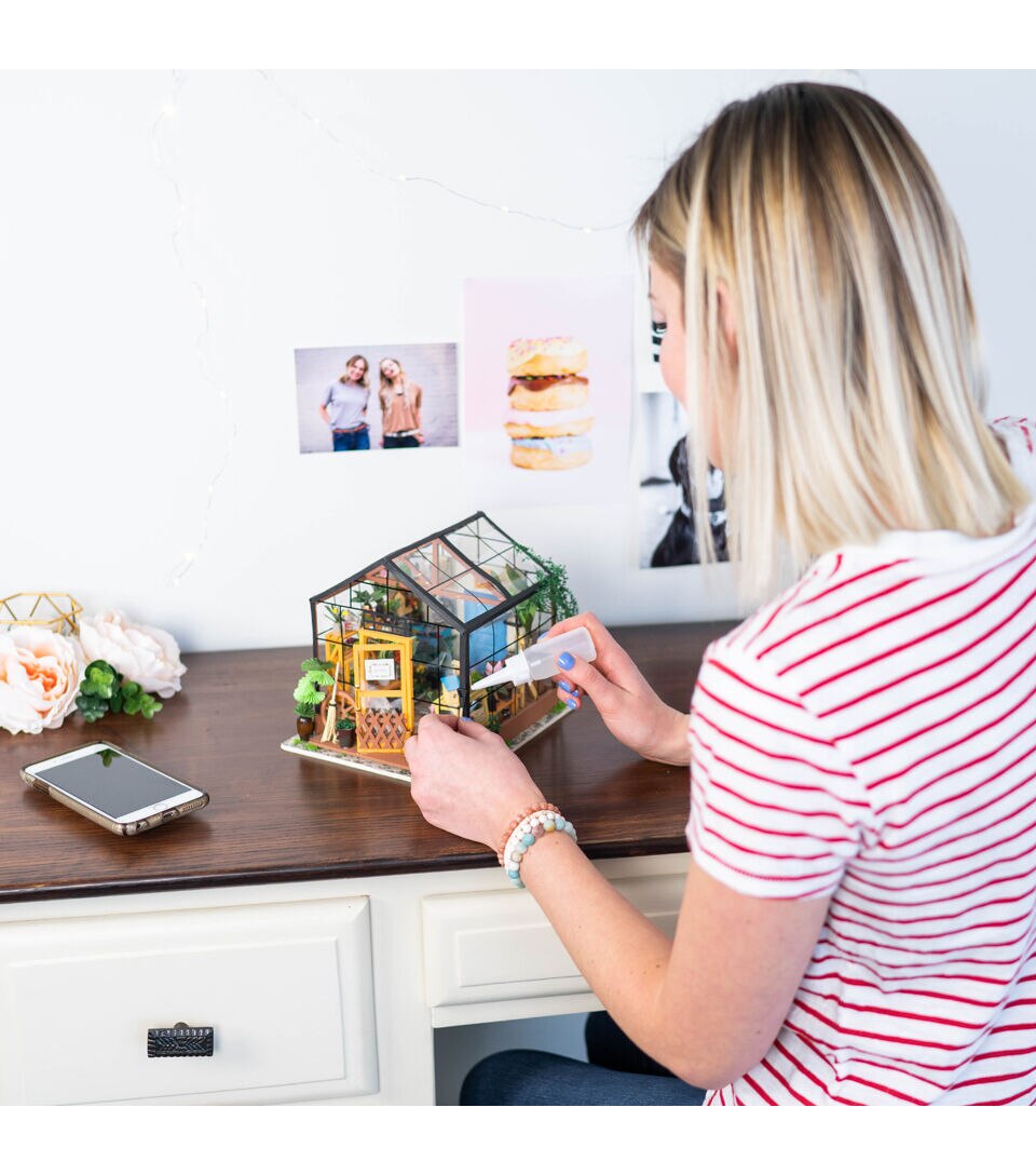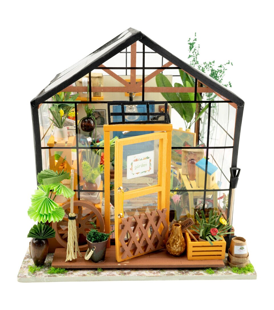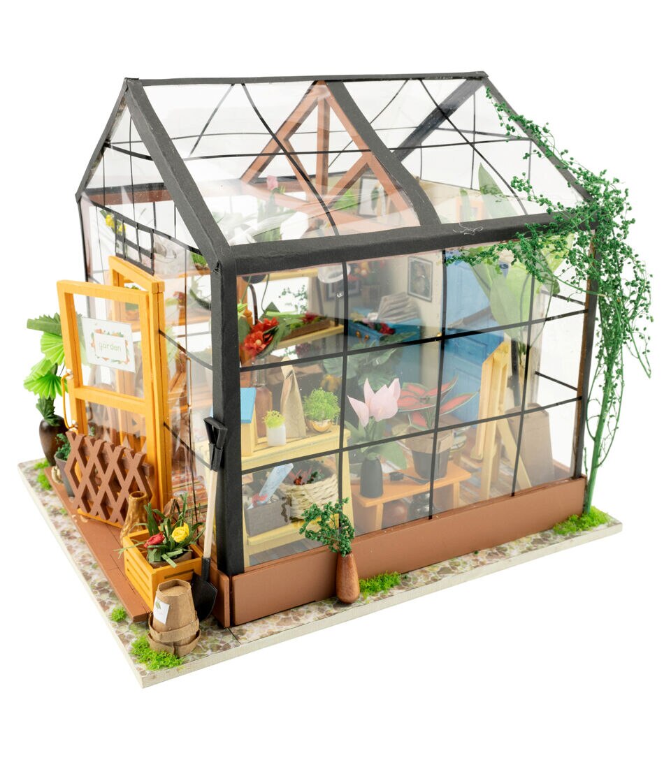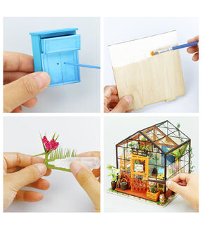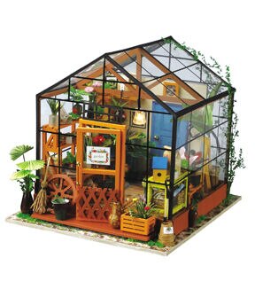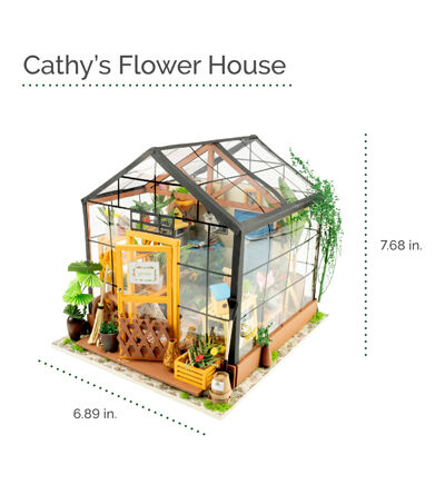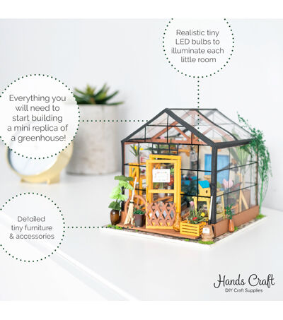 Whether this is your first 3D dollhouse kit or you want to expand your existing miniature collection, Hands Craft's Cathy's Flower House is perfect for you! This little greenhouse will keep you busy as you design and create the perfect little space. Kids and adults alike can enjoy putting together our miniatures. [CATHY'S FLOWER HOUSE] One of our most popular items, this miniature will give you your very own green thumb. Perfectly sized for any space, this little oasis brings the joy of gardening indoors. Bask in the warmth and beauty of your miniature garden, filled with fragrant herbs, vibrant flowers, and thriving succulents! [REAL LED LIGHTS] To make our rooms look as realistic as possible, we included light fixtures with tiny LED bulbs to illuminate each little room. This vibrant and cozy lighting will add the finishing touch to your room, table, shelf, or showcase. This kit includes an instruction book with illustrations to give you an idea of the possibilities and help you make your dreams come alive. [TINY FURNITURE & ACCESSORIES] This model dollhouse room has shelves, potted plants, flowers, 2 doors, vines, pots, gardening tools, and more to give you a detail-oriented and well-furnished feel to your tiny space. You can even add flooring or your own personal twist. With such fantastic decor and details, this modern DIY greenhouse will stand as a reminder of your impressive accomplishment and the feeling of satisfaction! [TOOLS INCLUDED & RECOMMENDED] Includes LED light, electrical wires, batteries, battery case, glue, tweezers, paint, and paintbrush. Extra recommended tools: ruler, scissors, utility knife, needle-nose pliers, pencil, binder clip, screwdriver. There are some paper pieces that need to be cut out and glued together. Recommended for ages 14+