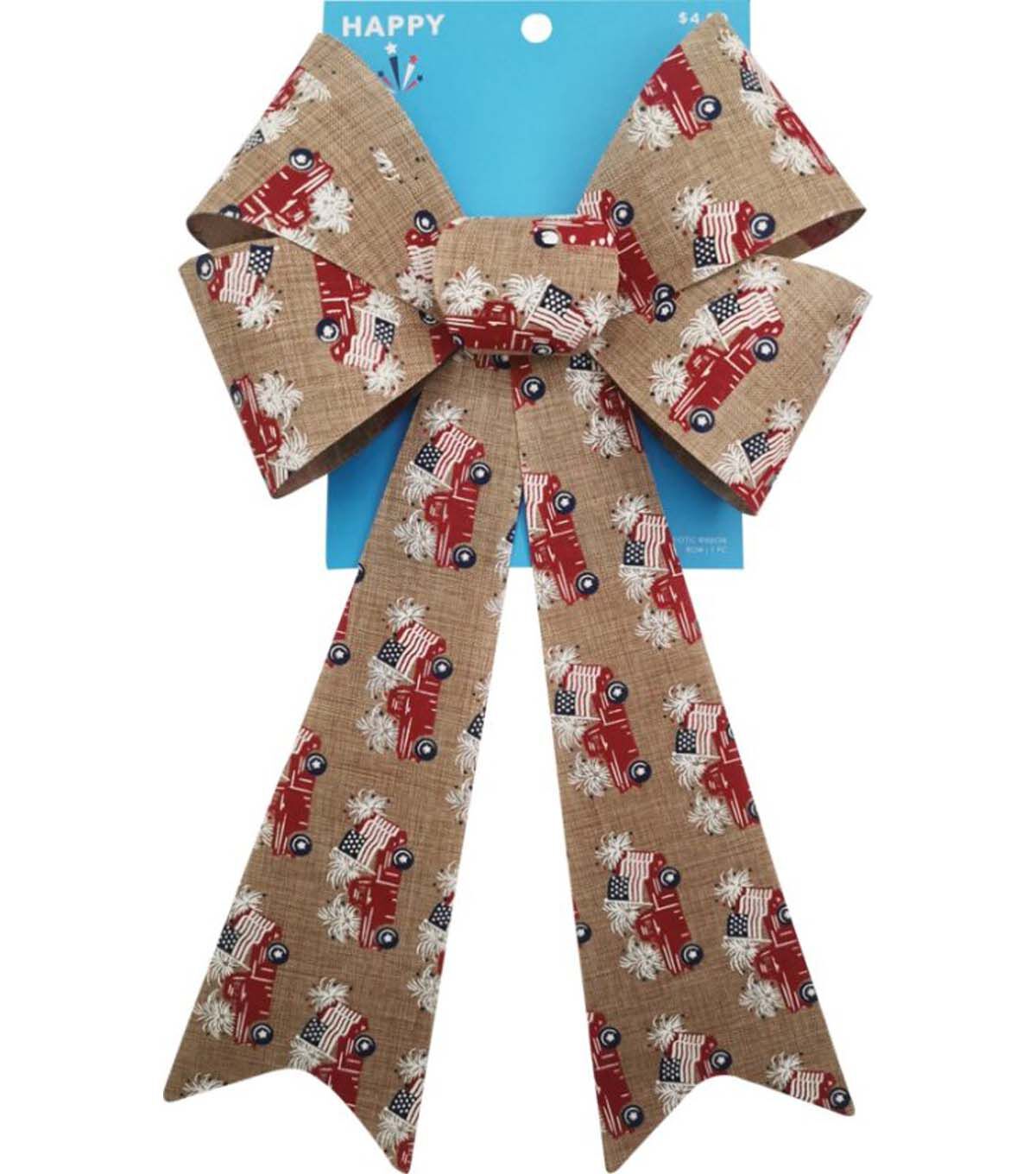 Add a touch of patriotism to your home decor with Happy Patriotic 9" Red Trucks on Natural Burlap Bow. This beautiful bow features a charming red truck design on natural burlap, making it perfect for any occasion. Whether you're celebrating the Fourth of July, Memorial Day, or simply want to show your love for your country, this bow is the perfect addition to your home decor.