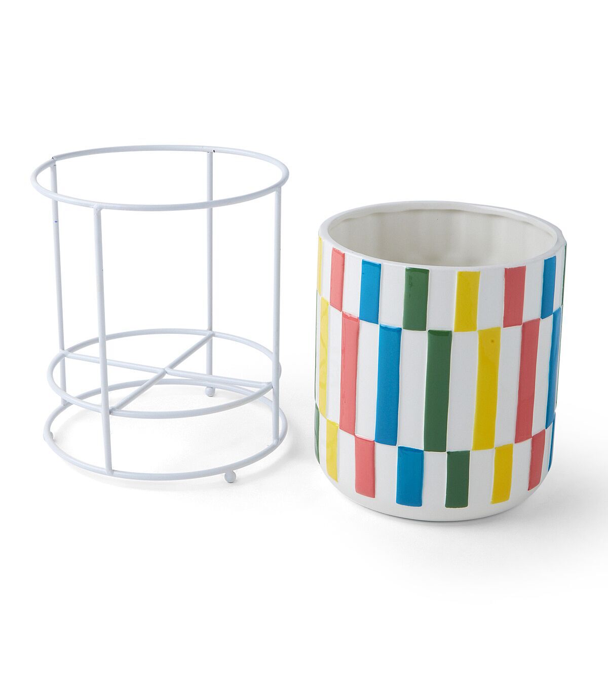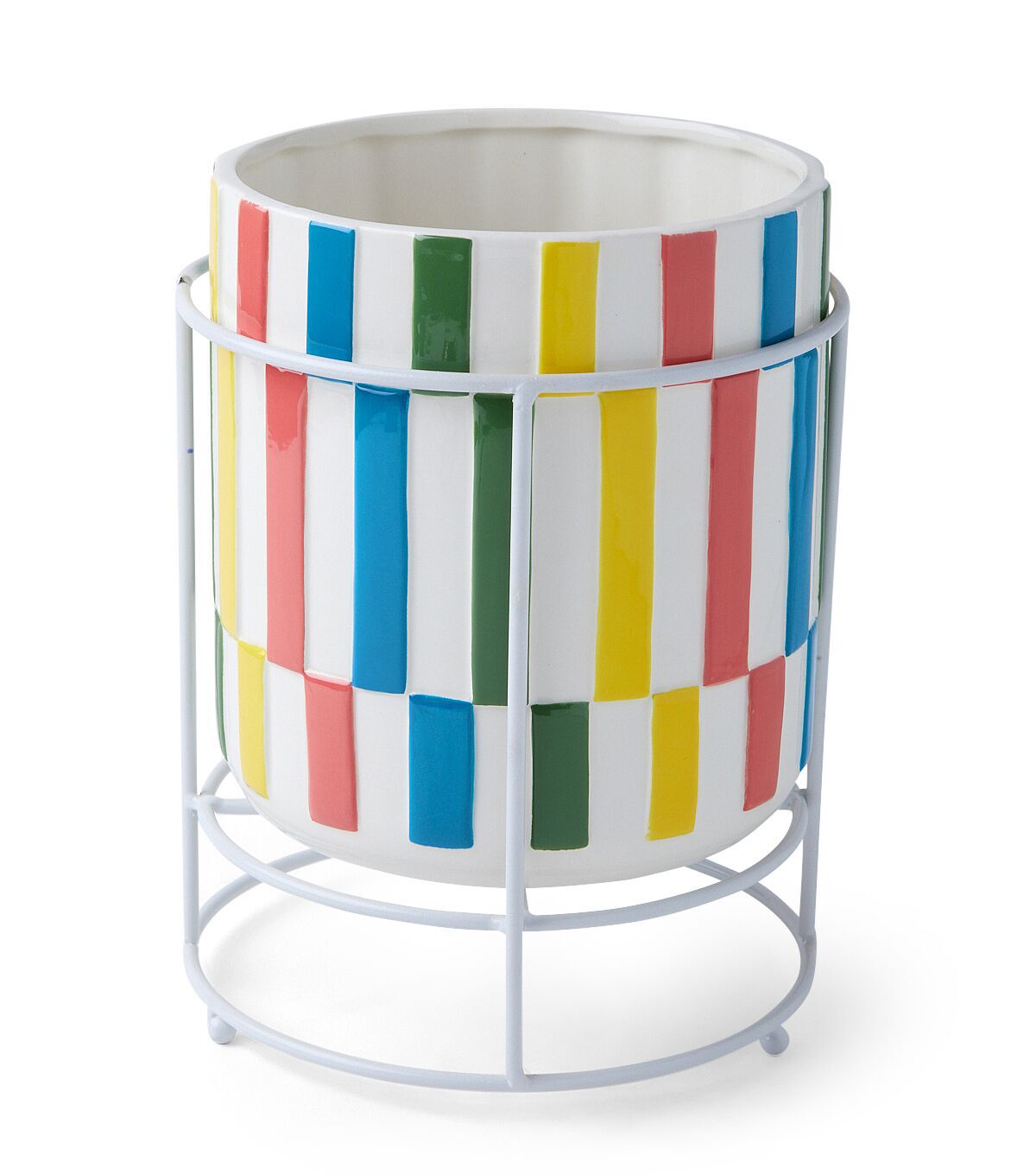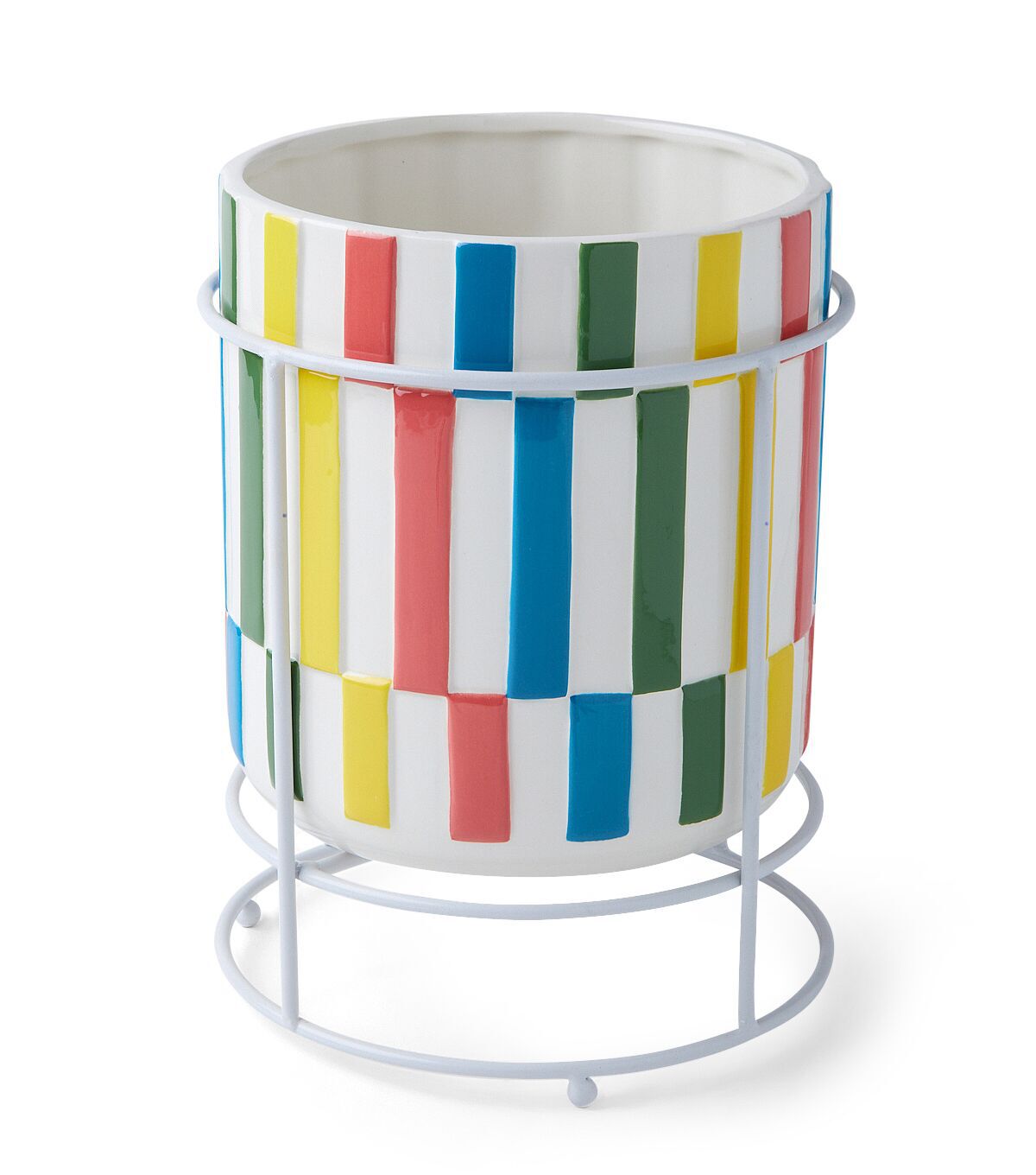 Add a touch of whimsy to your outdoor space with the 9" Summer Multicolor Ceramic Planter with Wire Stand by Place & Time. This vibrant planter is perfect for displaying your favorite summer blooms and adding a pop of color to your garden or patio. The ceramic construction ensures durability and longevity, while the wire stand adds a modern touch to the overall design.