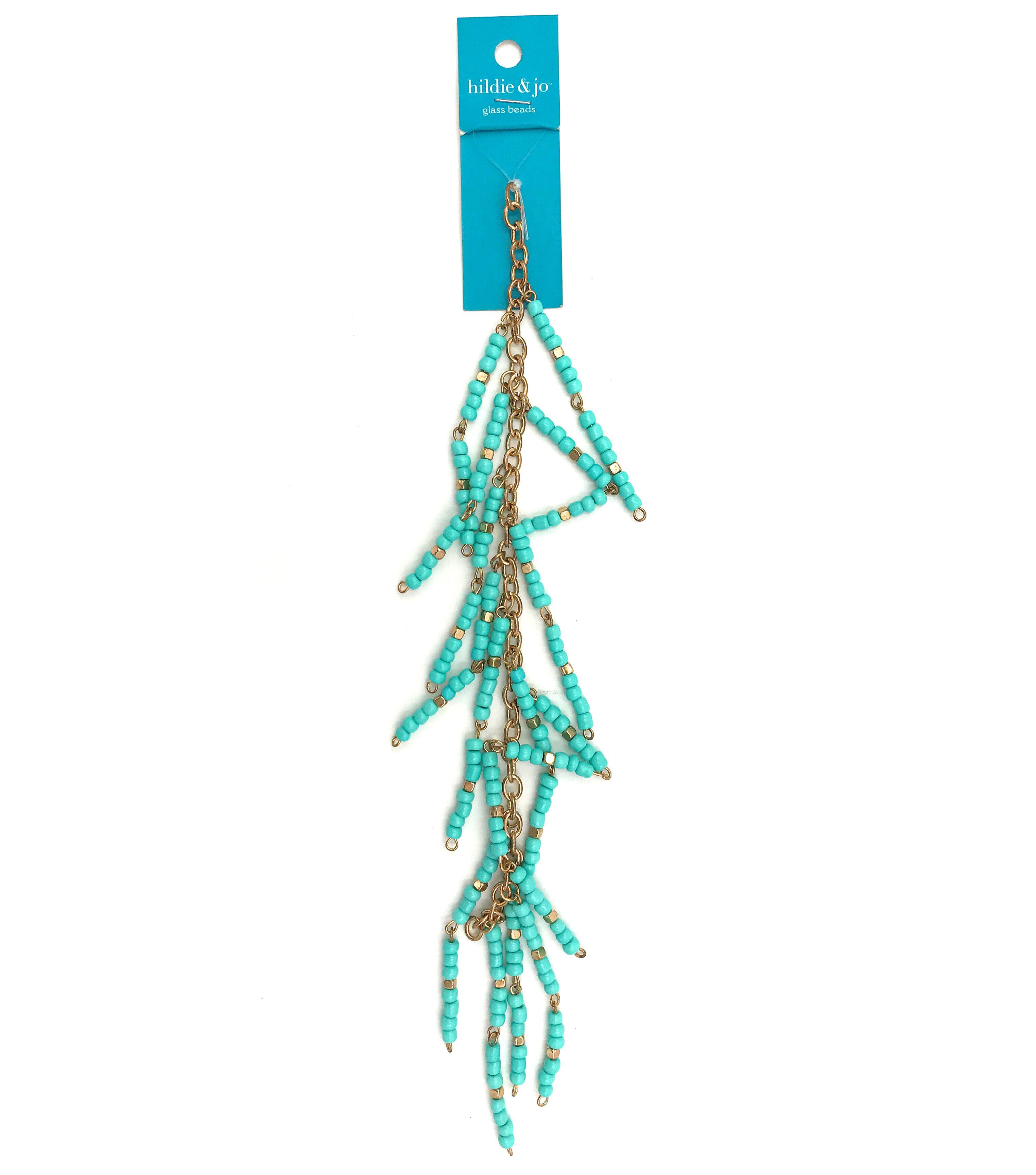 Stylize your handmade jewelry creations with the hildie & jo Glass Tassel Beads - Turquoise & Gold. This pack contains a strand of turquoise tasseled beads. Mix and match them with glass and metal beads to design neckpieces, bracelets, danglers and a lot more.