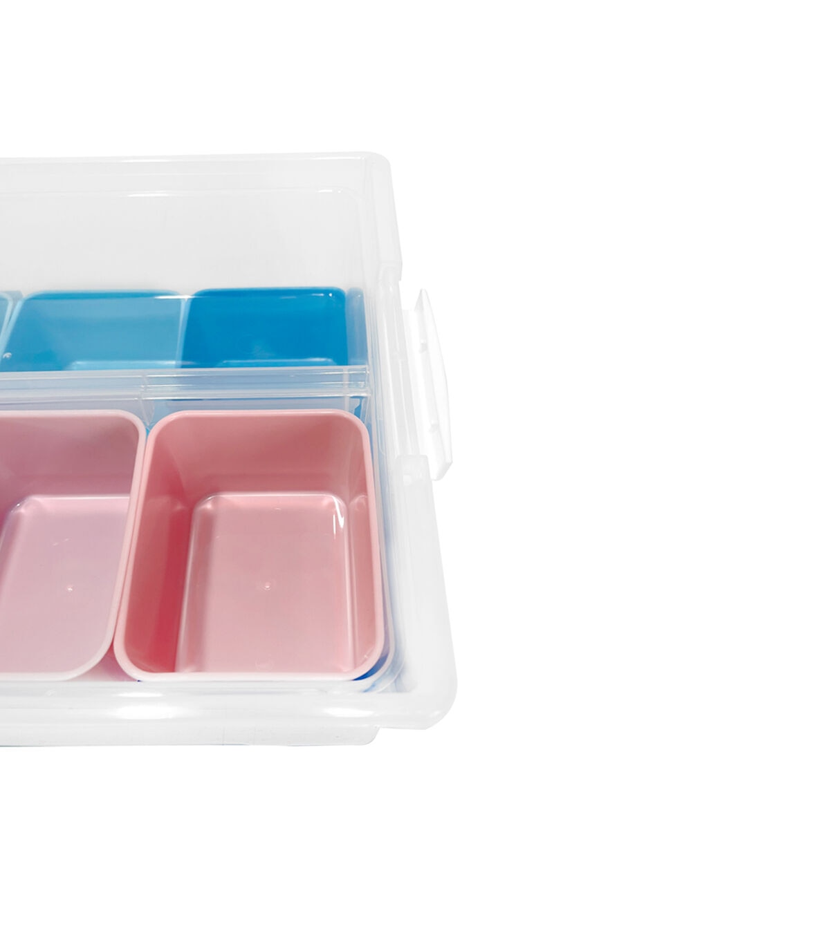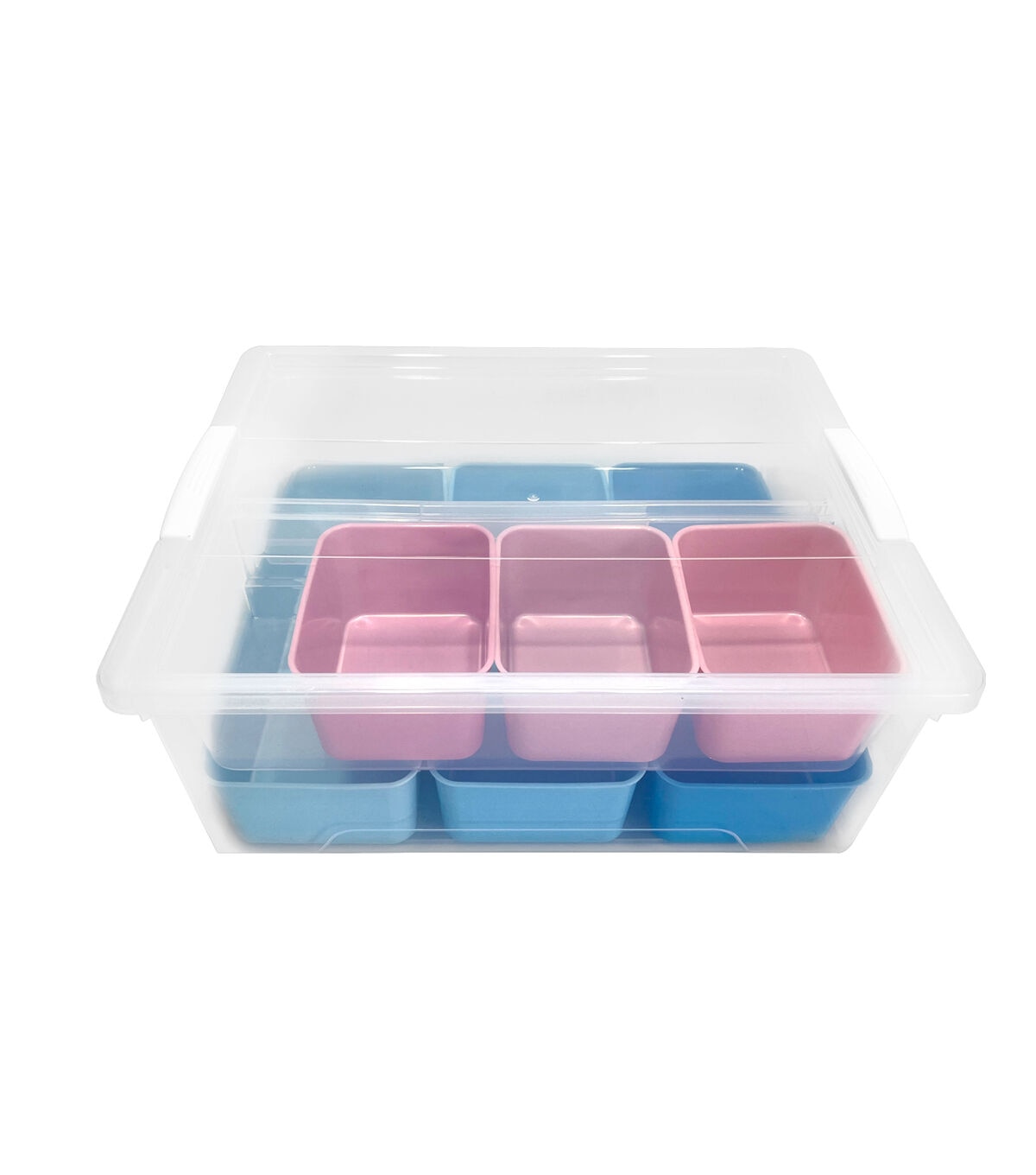 Keep your holiday ornaments, trinkets or craft supplies organized using the Top Notch Storage Box Set with 9 Pieces - Blue & Pink. This clear storage box comes with nine stackable containers sporting a blue or pink shade. You can also use it to store stationery to protect them from damage and dust.