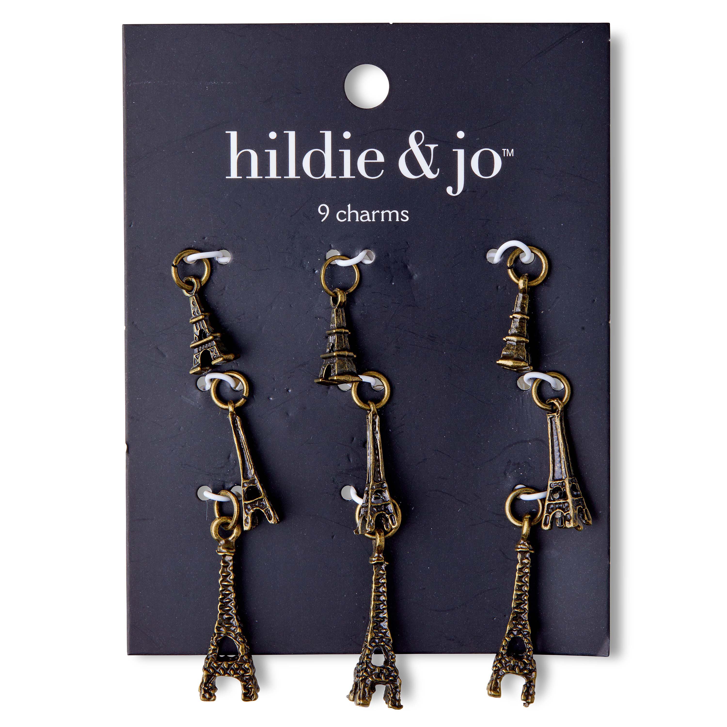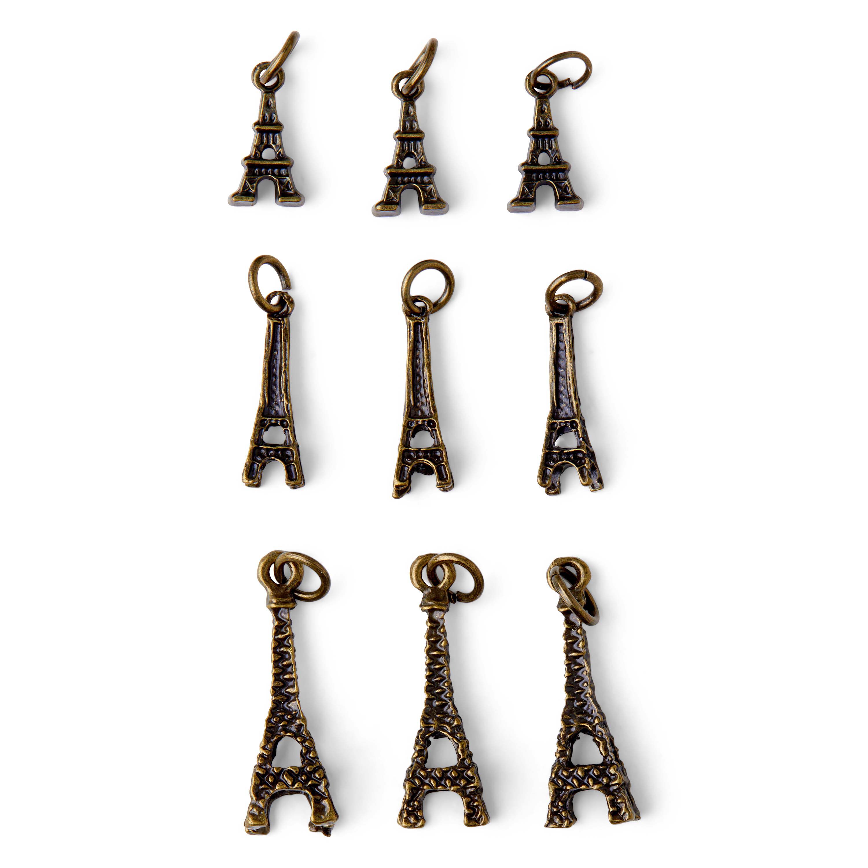 Personalize a DIY jewelry or craft project using these hildie & jo Symbolize Eiffel Tower Charms-Gold. This pack contains three styles of Eiffel Tower charms including small, medium and large with a cutout. Each charm features a dots detailing. Add these to bracelets, necklaces, keychains and more. These nine charms have jump rings for easy attachment.