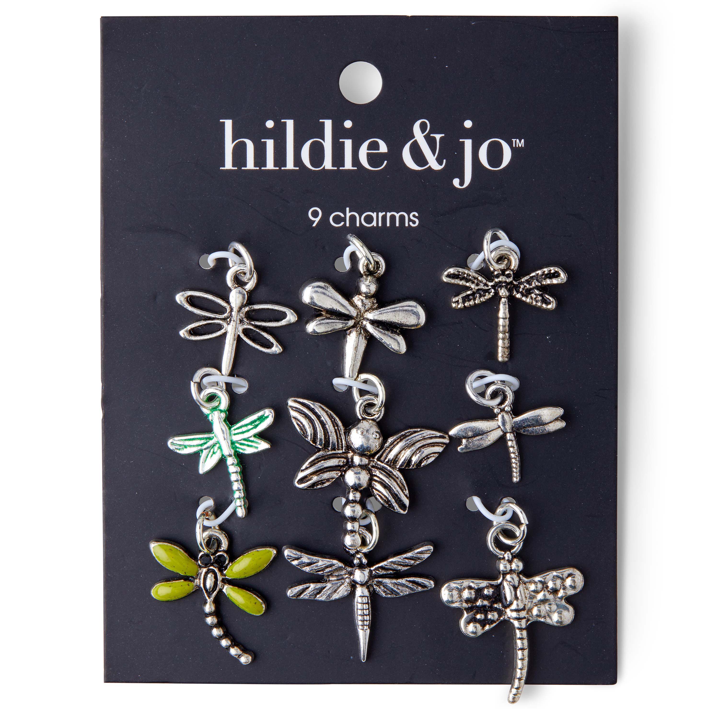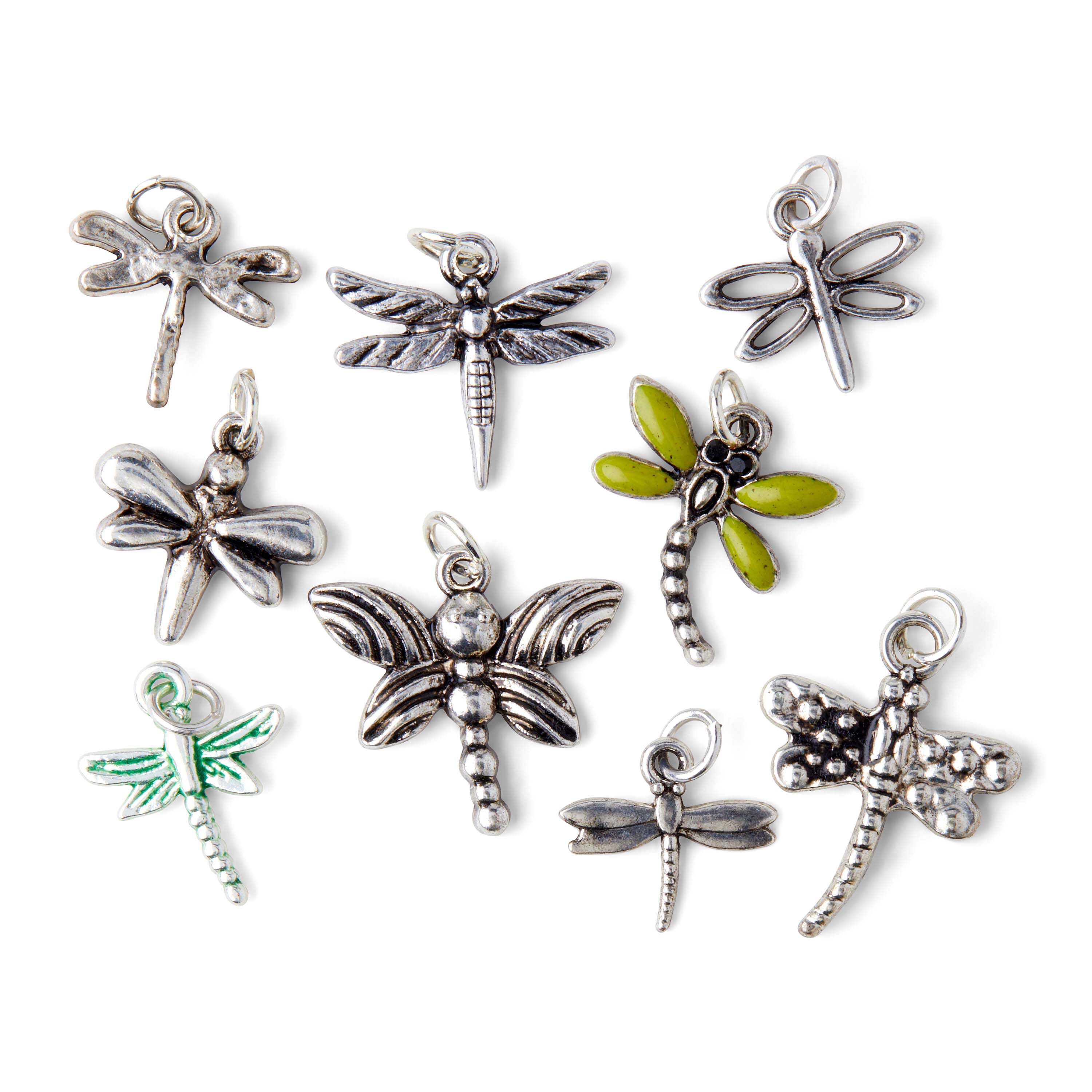 Use these Hildie & jo charms in your next DIY project. Each charm is unique and in the shape of a dragonfly. Each has etchings, some have color and each is in silver. 9 pieces
