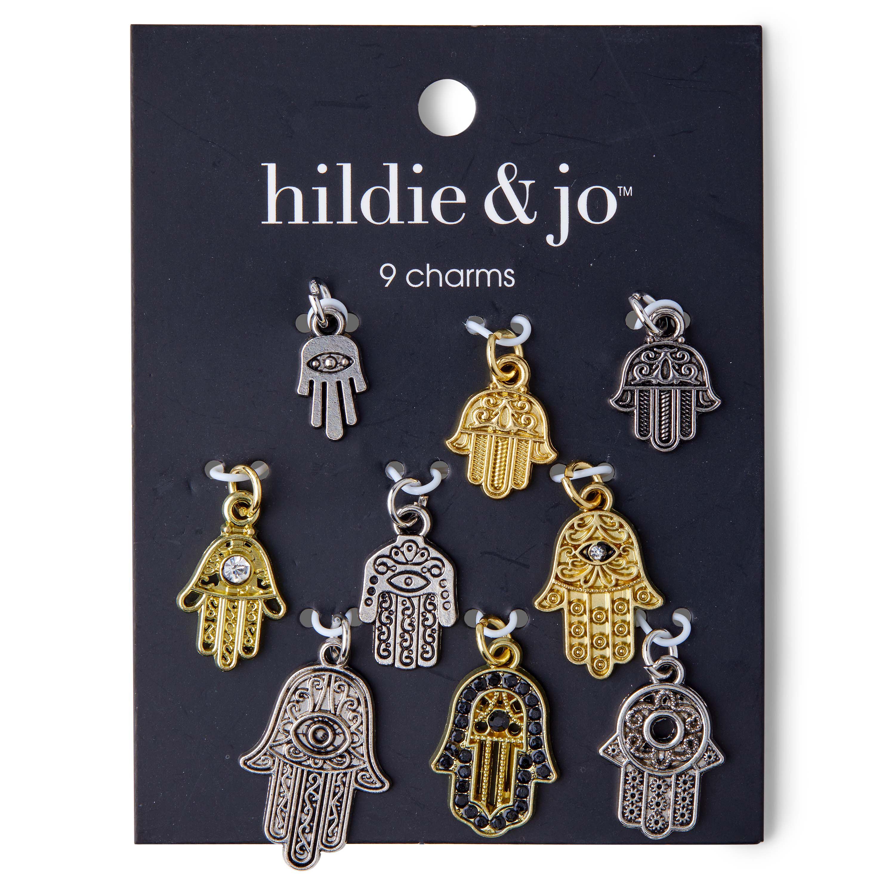 Personalize a DIY craft project using these unique charms. There are nine charms, all in the shape of a Hamsa. Each charm is unique. They are in silver and gold, each having a slightly different shape. Each has different textures and detailing. Colors vary from shiny silver to antique gold. 9 pieces