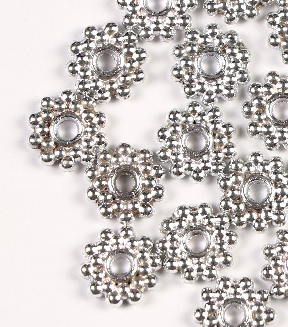 Give your jewelry designs a unique look with the hildie & jo Cast Metal Bubbled Star Spacer Beads - Silver. These cast metal beads are shaped like a star and sport a bubble texture. They are great for craft projects, garment embellishments, hair decorations and so much more. This pack includes 22 pieces.