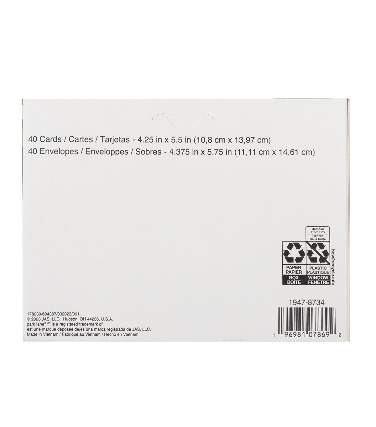 Park Lane offers a brilliant selection of cards and envelopes that deliver your salutations in style. They're perfect for wedding invitations, birthdays and holiday cards, graduation announcements, and so much more. Dress them up for any occasion with your own stickers, washi tape, pens and markers, then send them out to family and friends. Cards and envelopes are available in a wide variety of colors and sizes to choose from to fit your style and message. This package includes 40 colorful cards and 40 envelopes measuring 4.25 x 5.5 inches (A2 size).