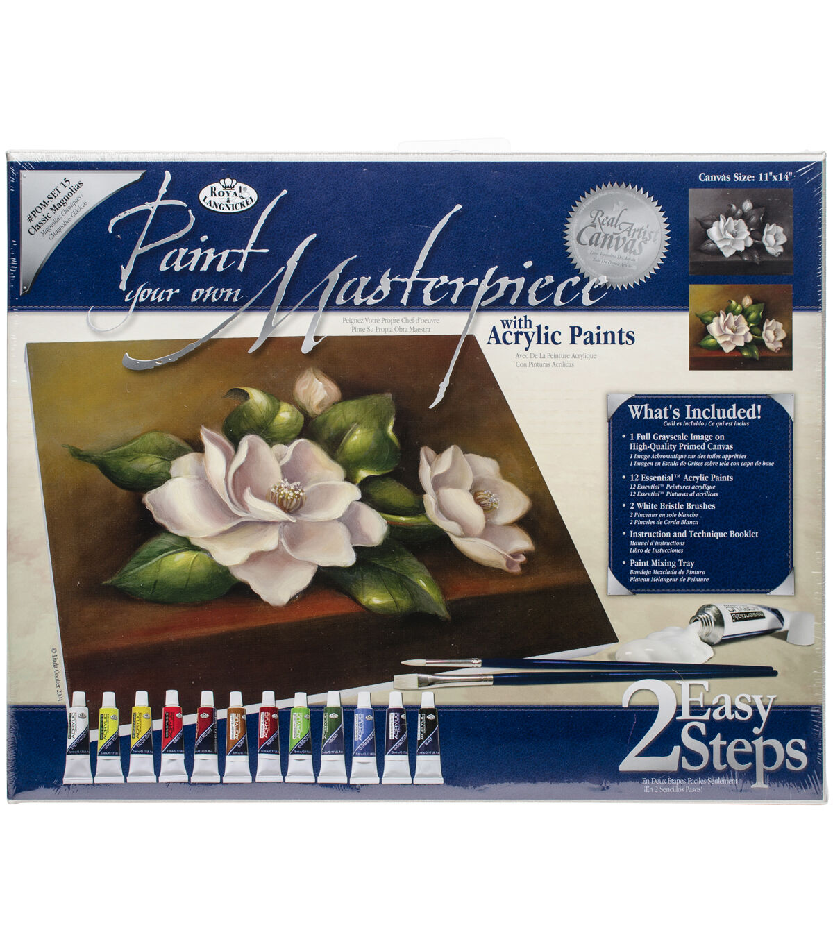 Royal Brush-Acrylic Paint Your Own Masterpiece Kit: Magnolia's. This kit has everything you need to create your own beautiful work of art! This package contains one 11x14 inch grayscale pre-printed artist board, twelve 5ml tubes of acrylic paints, two white bristle brushes, one paint mixing tray and one instruction and technique booklet. Conforms to ASTM D 4236. Imported.