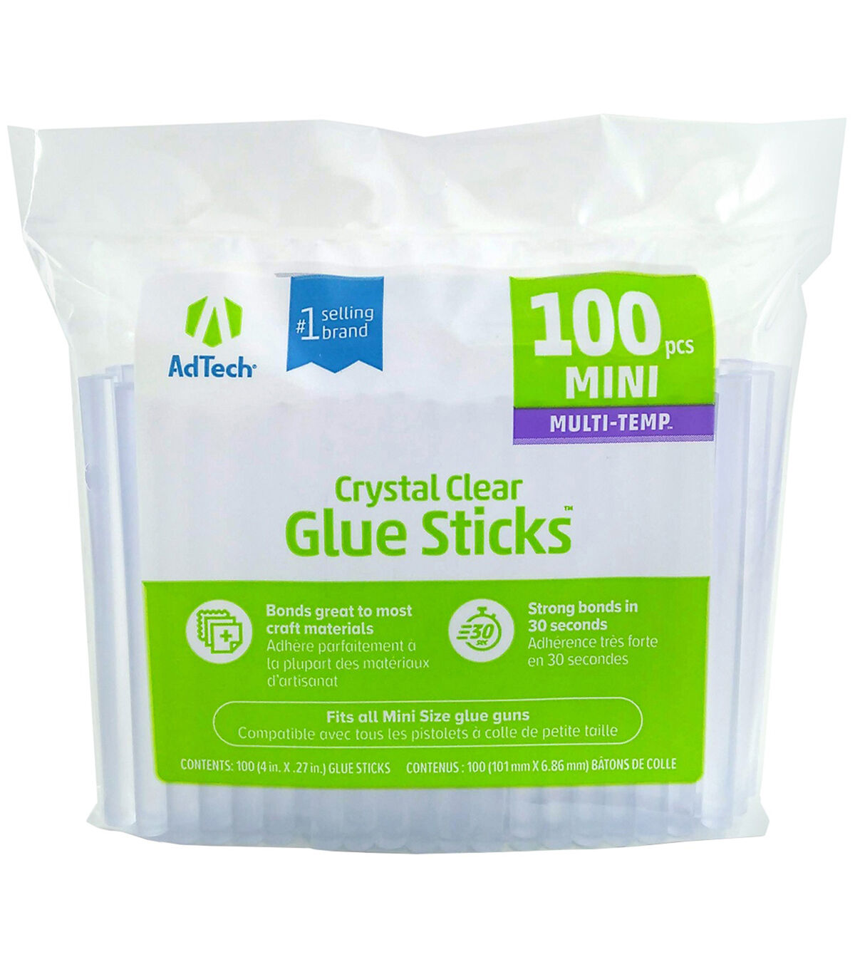 These glue sticks bond wood, glass, metal, floral, fabric and foam in 20 seconds. Works in both low- and high-temp guns. Use in low- temp guns for fabric, foam, floral and other delicate materials. Use in high-temp guns for non-porous materials such as wood, glass and metals. This package contains 100 .28x4 inch mini glue sticks. Non-toxic. Conforms to ASTM D 4236. Imported.