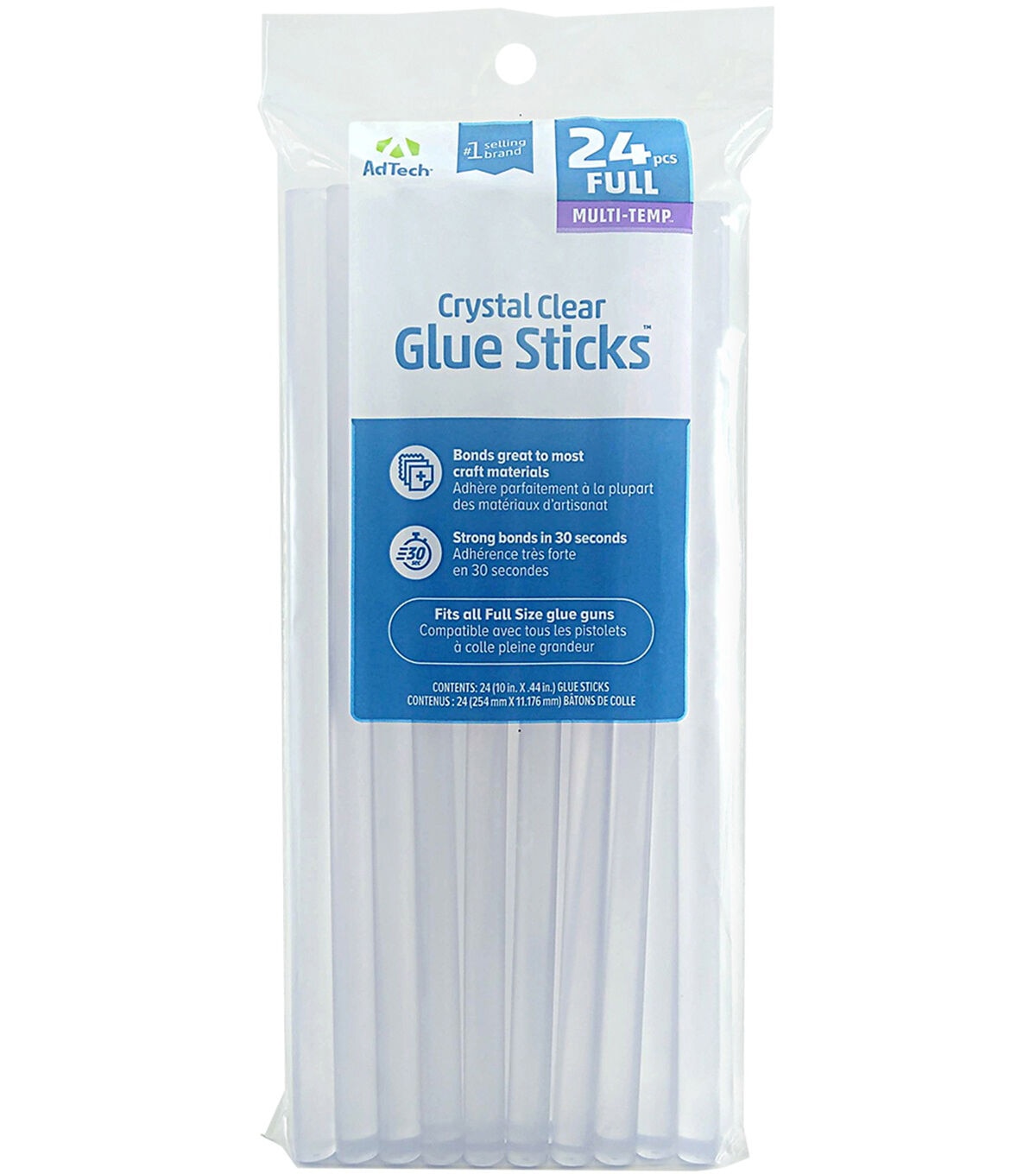 AD-TECH: Multi-Temp Glue Sticks. These work in both high and low temp glue guns, and can bond a variety of materials including: foam, floral, wood, glass and metal. This package contains twenty-four 7/16x10 inch glue sticks. Conforms to ASTM D 4236. Imported.