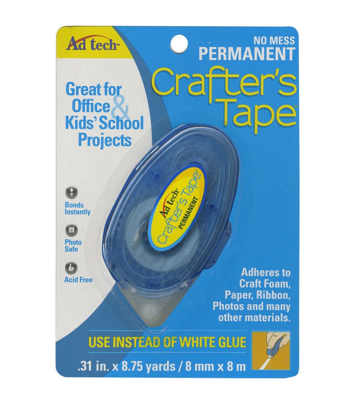 Be it at home, in office or for craft projects in school, the Ad-Tech Crafter's Tape Permanent Glue Runner 8.75Yds is sure to come handy. It is portable and creates no mess and can be used to bond items like paper, craft foam, wood, photographs, ribbons and more. The acid-free and non-toxic glue runner can be easily refilled for continued use in your myriad paper craft projects. This package includes one dispenser with 8.75 yards of permanent glue runner.