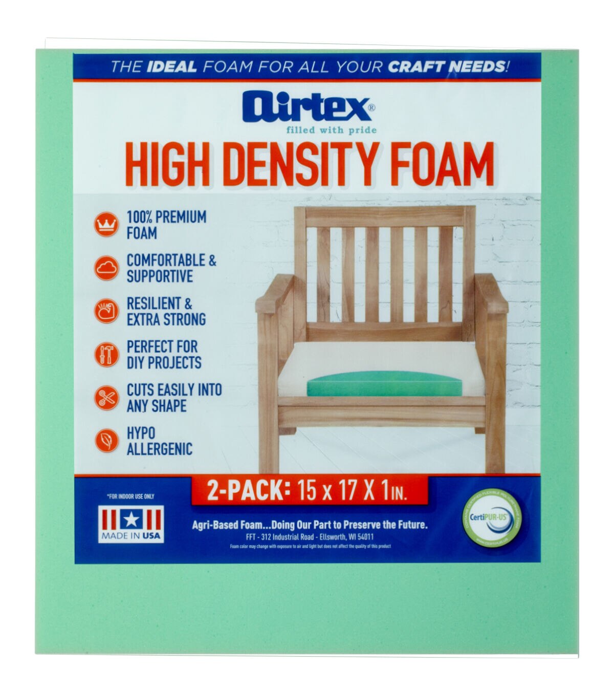 Enjoy the comfort and softness of sleeping or camping pads when you use the Airtex High Density Foam 1'' x 15'' x 17'' 2 pack as filler for such chair pads. The durable chair pad foam is non-allergenic and highly resilient, so you can easily use it for your outdoor or indoor projects. You can use such High Density foam chair pads to make boat seats, chair cushions, sofas, bar stools, RV seats, upholstery and craft projects. They provide maximum support as well as retain their shape. You can easily cut high density foam with an electric knife or straight blades.