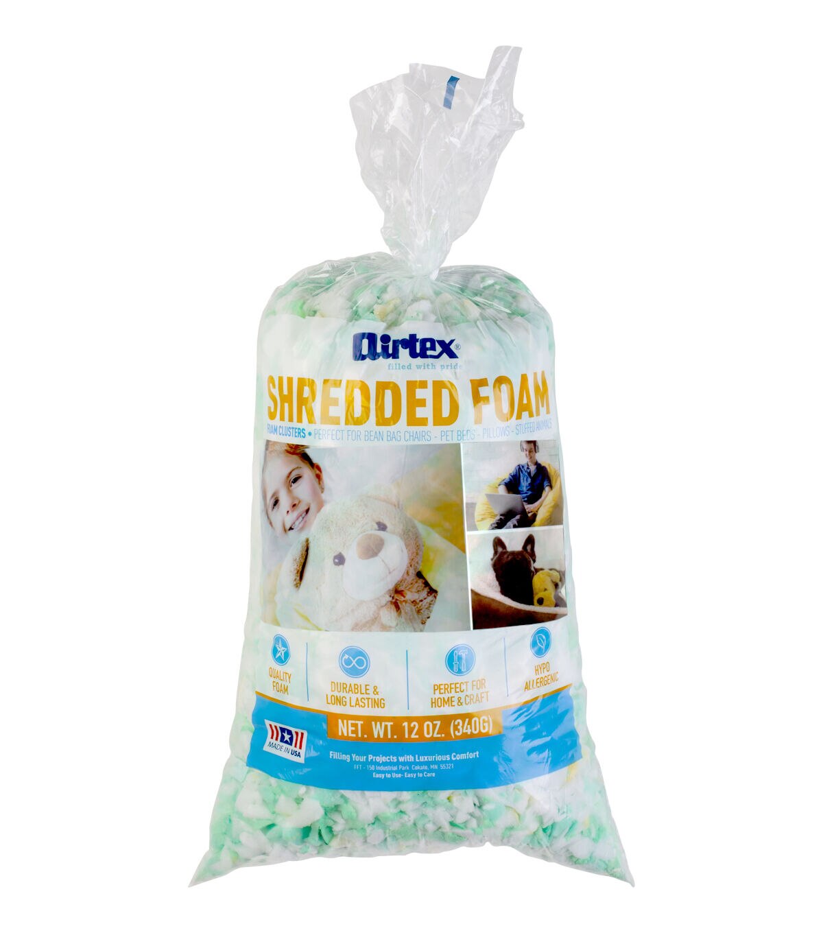 Fill everything from cushions, floor and throw pillows, patio furniture, pet beds, toys and more with the Airtex Shredded Foam 12oz. This lightweight shredded foam is a blend of regular and high density white and mint green foam. It is easy to work with and does not form a crust, so your cushions and pillows are smooth and comfortable without any bumps.