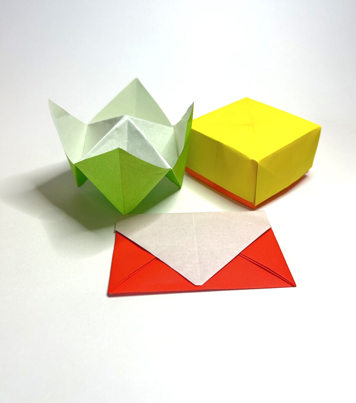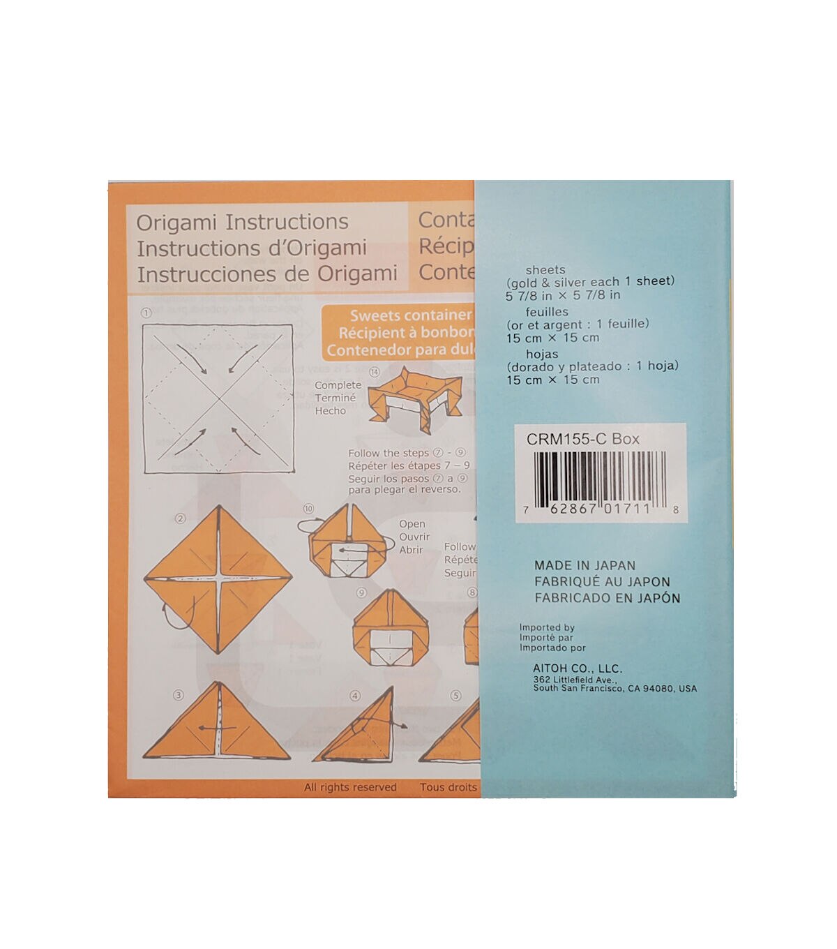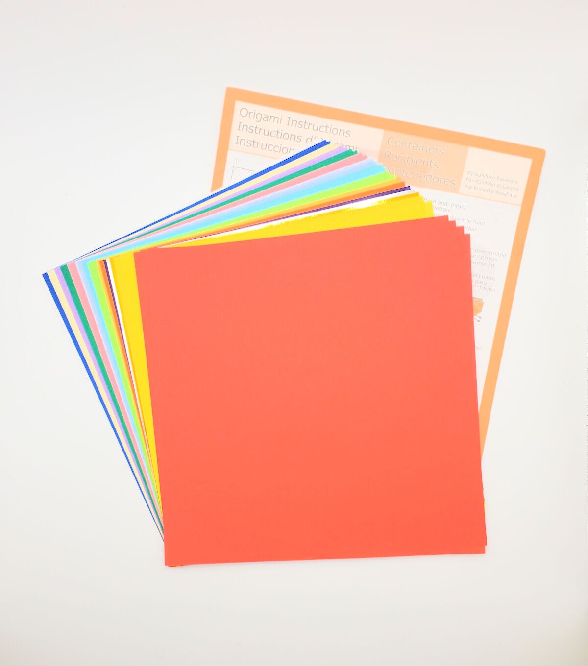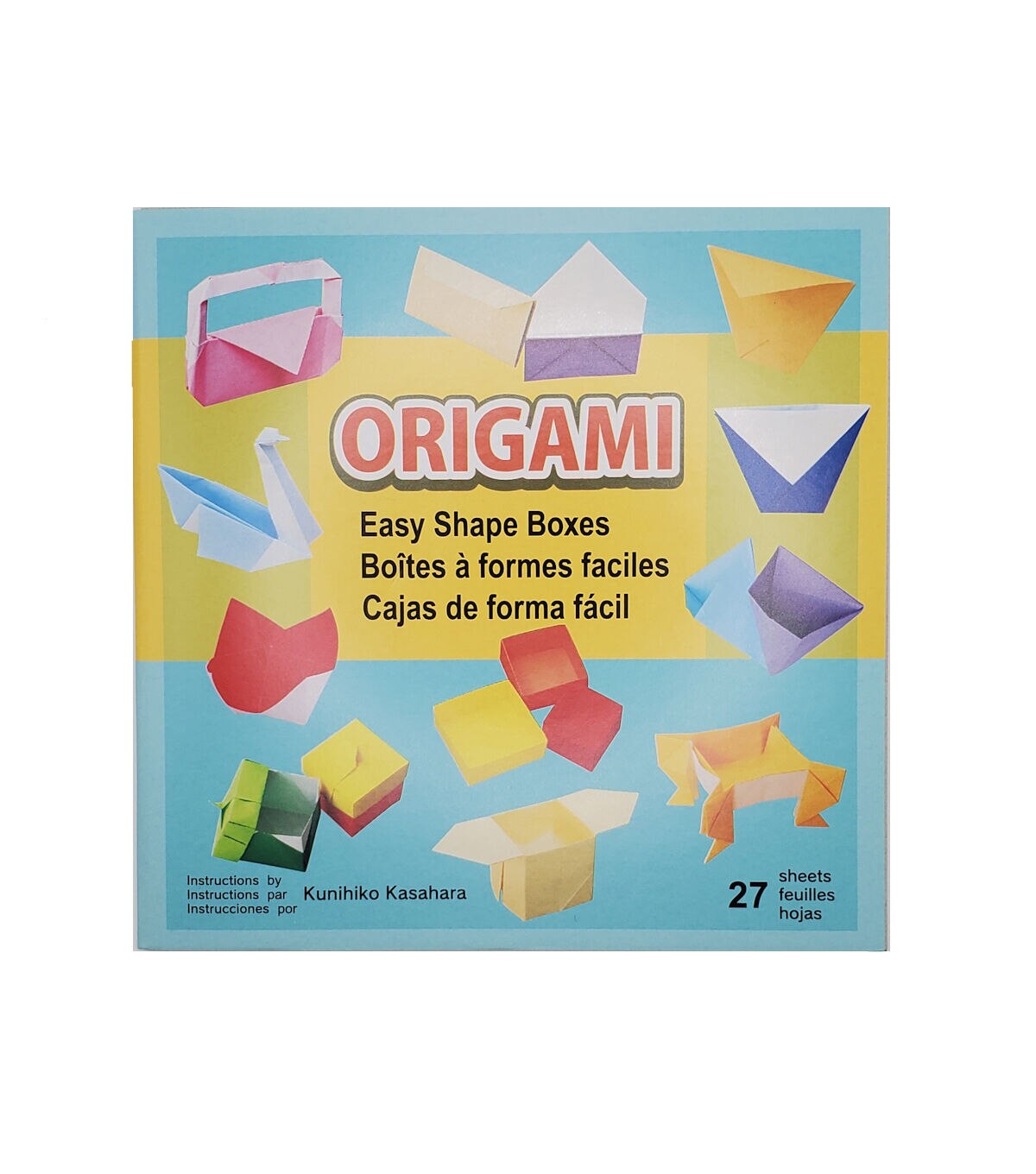 Instructions to make 12 different boxes and envelopes. Assorted colors of single sided Origami paper, 27 sheets total