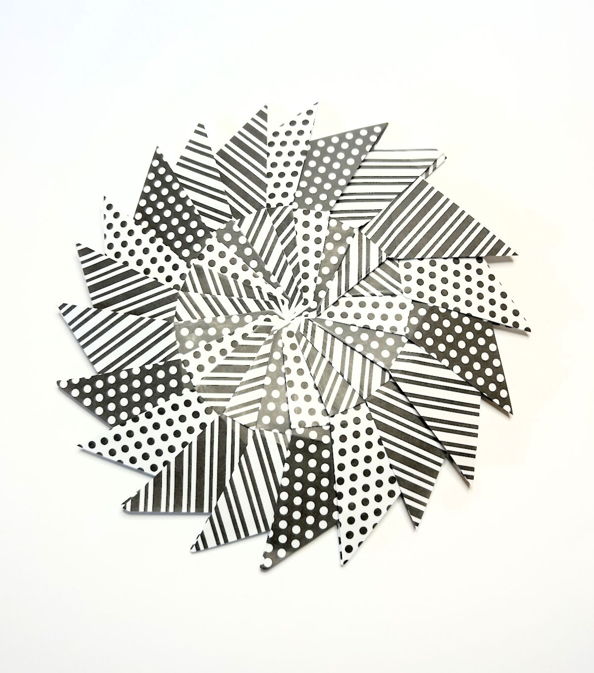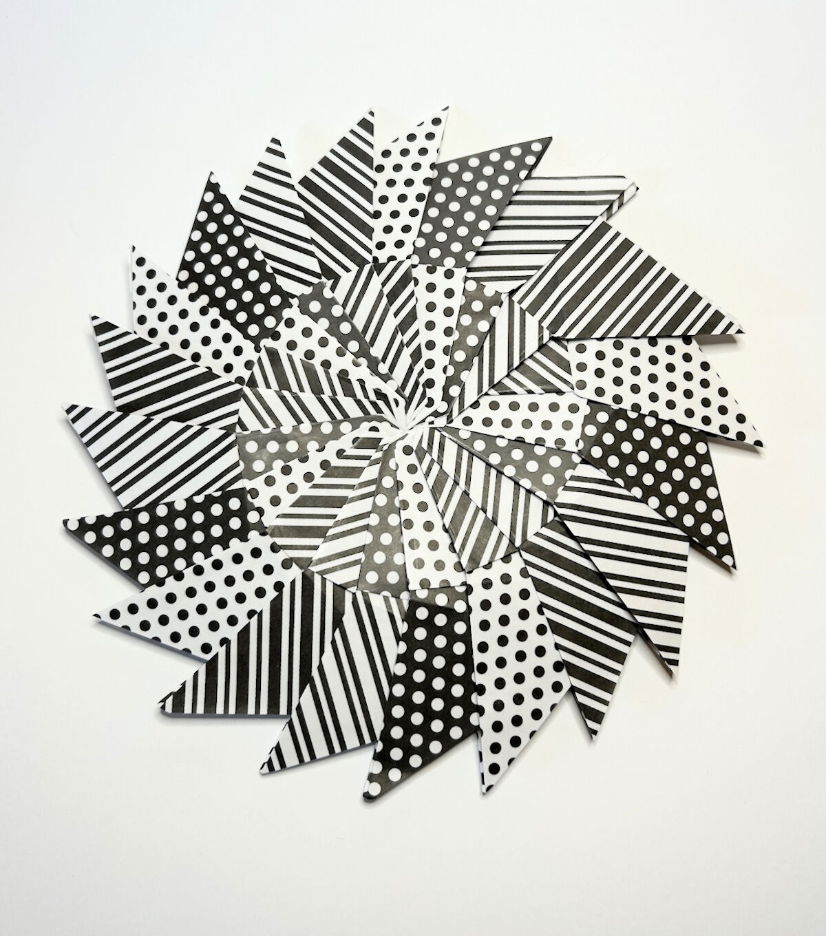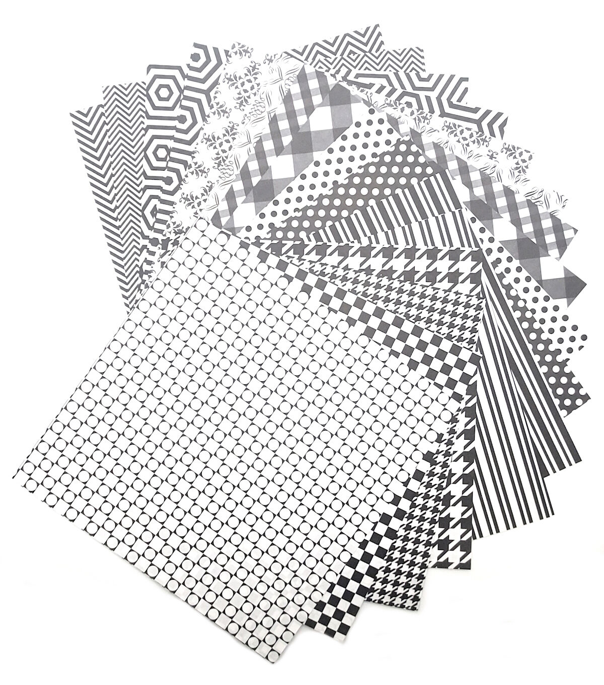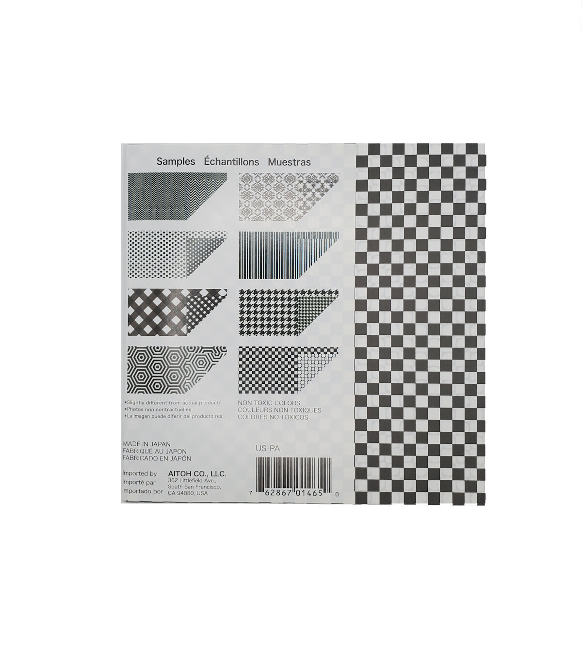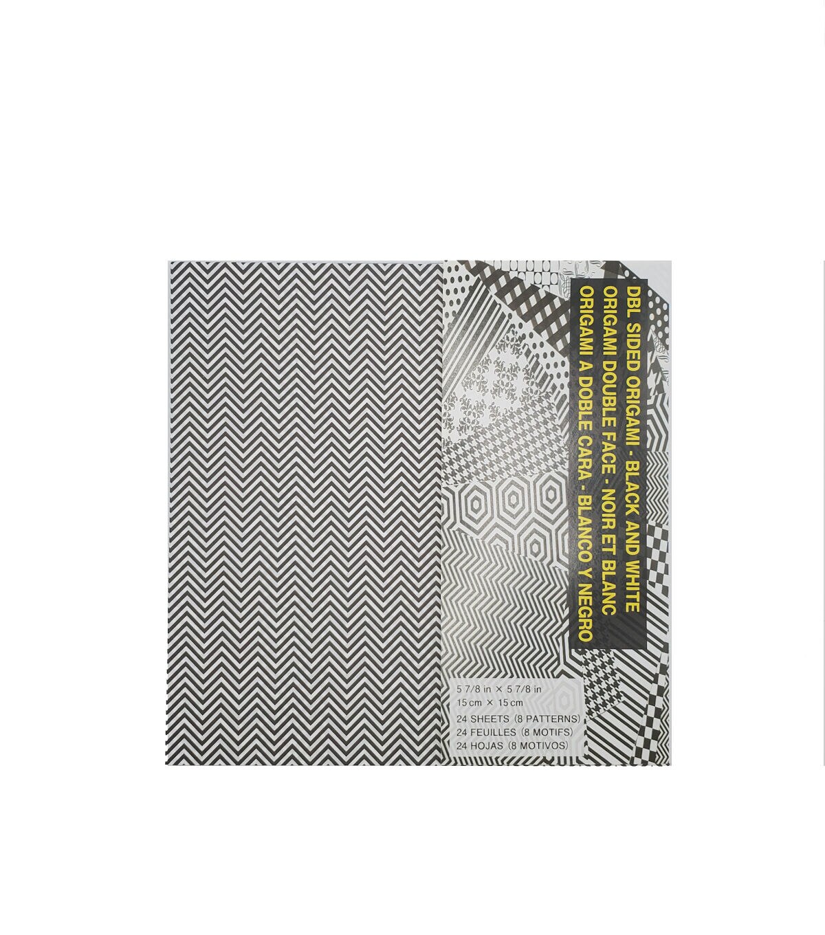 8 patterns of double sided black and white geometric patterns, 5 7/8" square. Origami paper with 24 total sheets included.