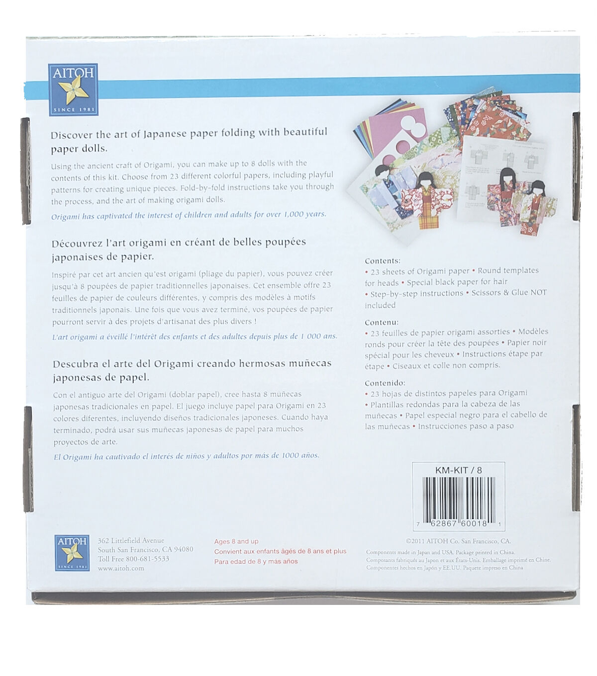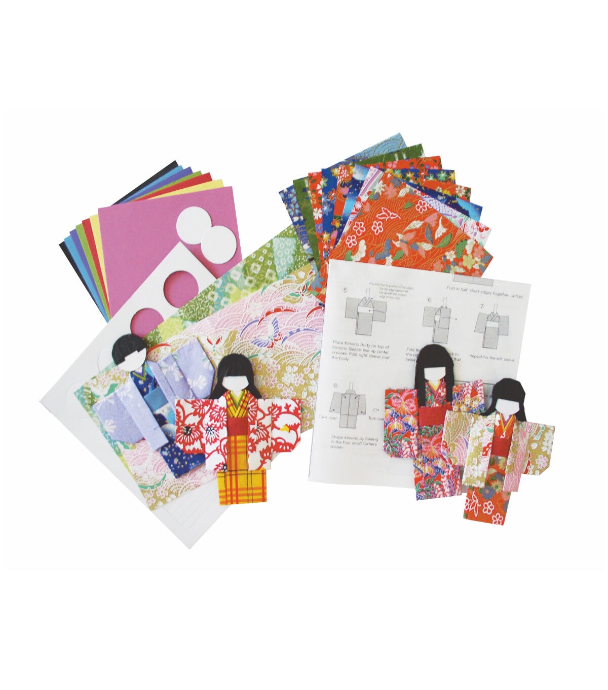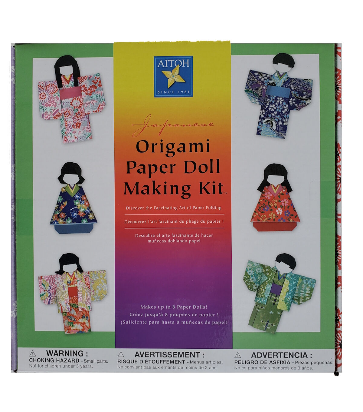 AITOH-Kimono Doll Kit. Amazingly simple and incredibly beautiful. Make up to eight paper dolls! This package contains twenty-three sheets of origami paper; round templates for heads; special black paper for hair and step-by-step instructions. Recommended for ages 8 and up. WARNING: Choking Hazard-small parts. Not for children under 3 years. Imported.
