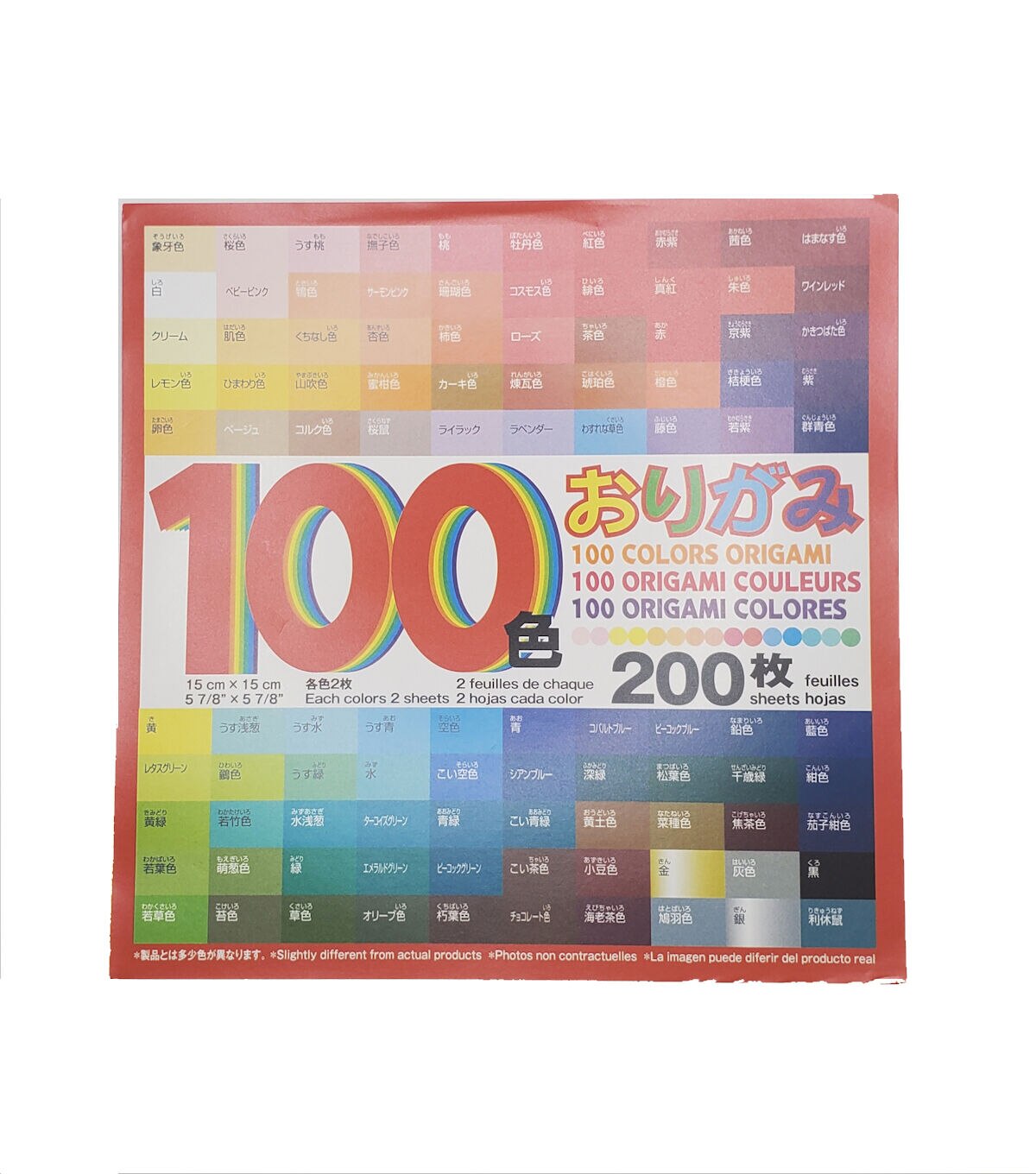 200 sheets with 100 unique colors of single sided Origami paper with 2 foil colors included. 5 7/8" square sheets