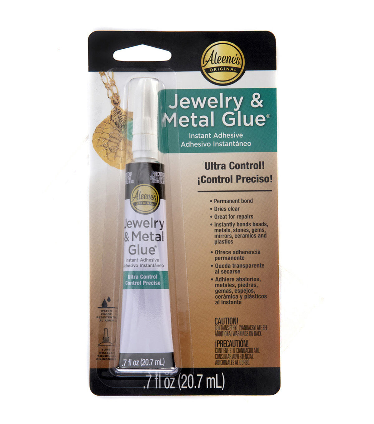 ALEENE'S-Jewelry metal glue-an instant adhesive. Contains 0.7 ounces. Works on metals, stones, glass, and beads. Bonds porous and semiporous materials in seconds. Makes repairs super easy! Will not run, dries clear, strong, and permanent. Conforms to ASTM D4236. Caution: Bonds skin instantly. Eye irritant. Keep out of reach of children.