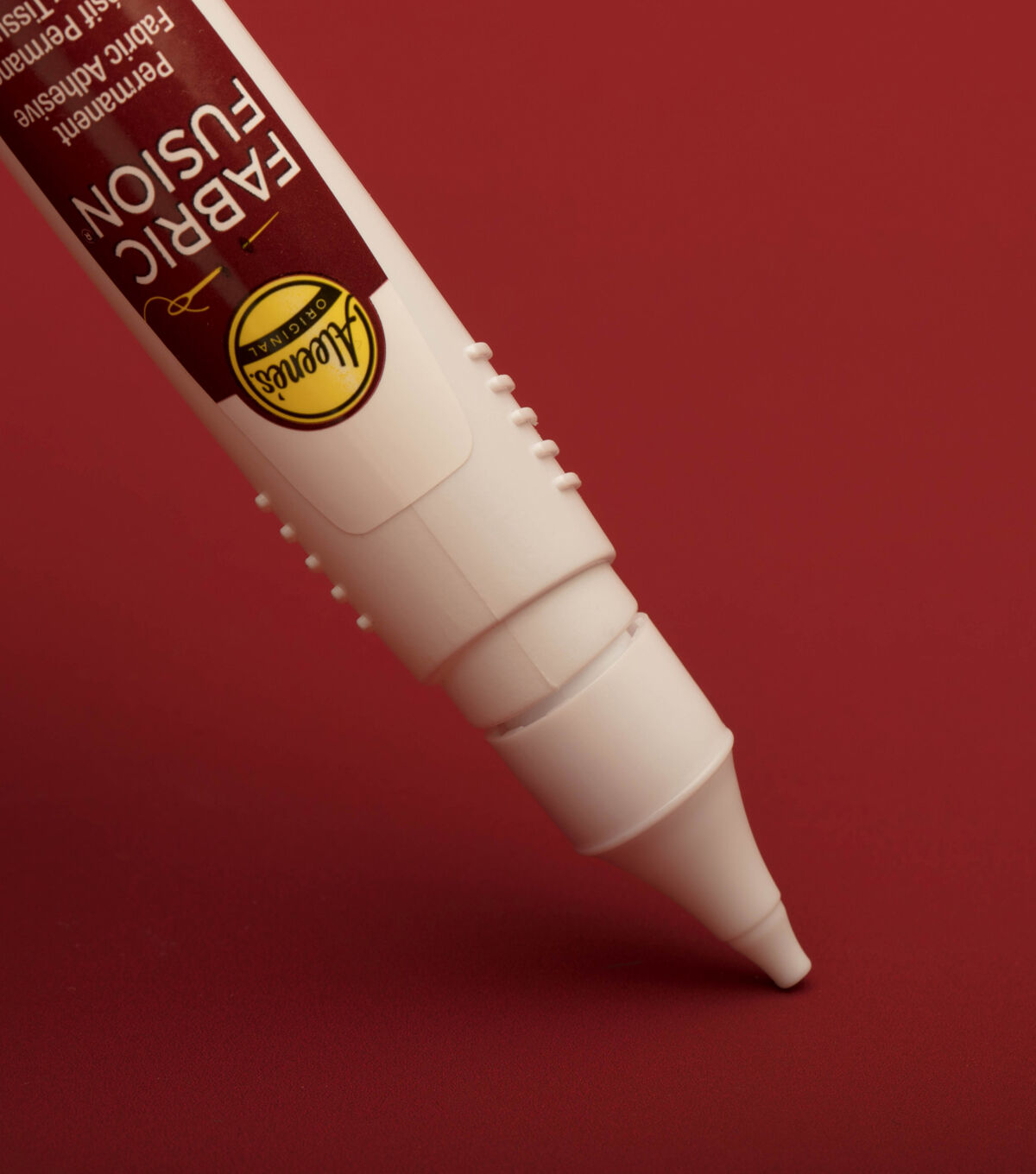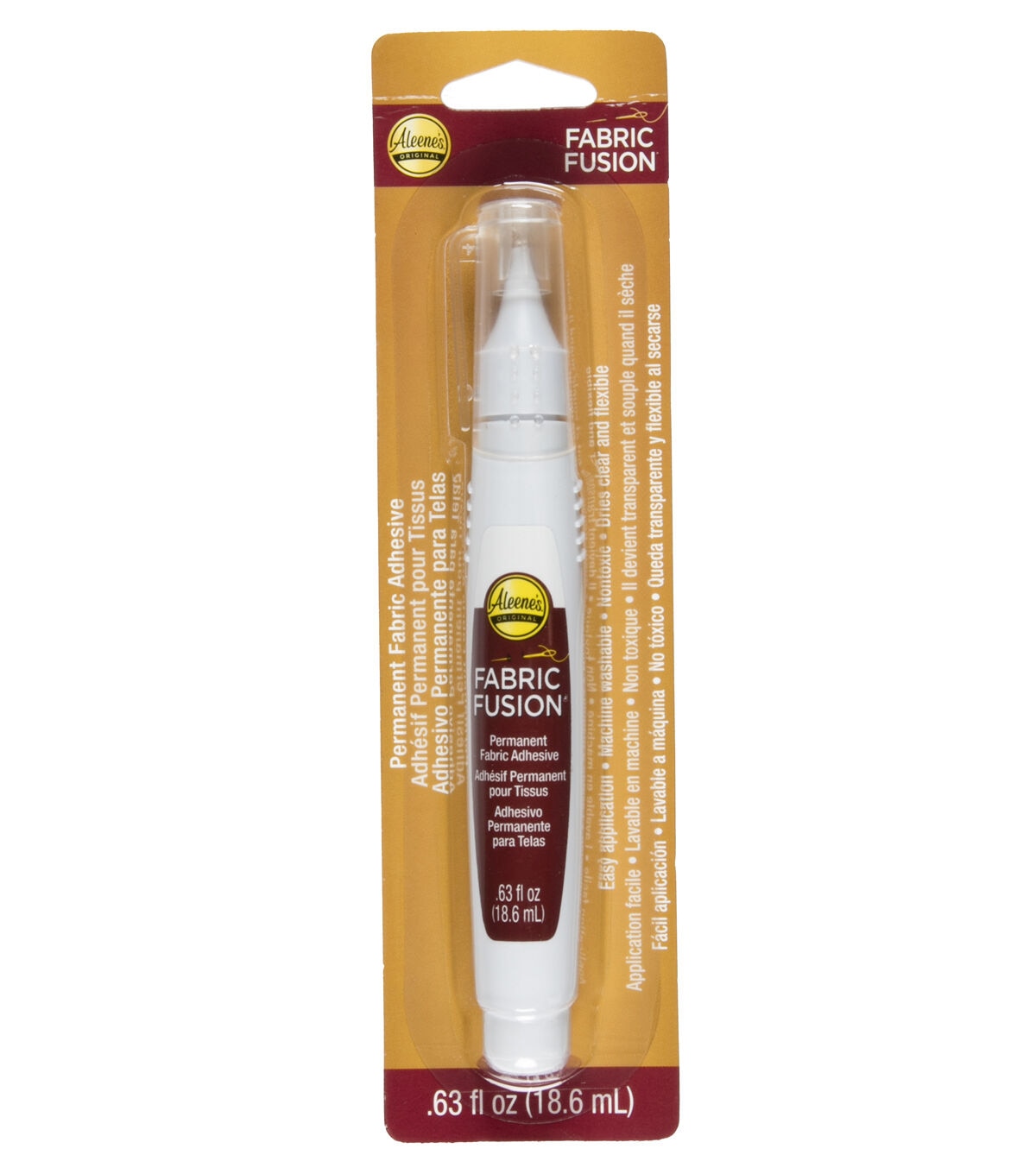 Aleene's Fabric Fusion Pen offers a unique clear, water-based, nontoxic urethane adhesive that provides a permanent fabric bond with an easy-to-use pen. This new package design makes application a snap. The fine tip provides precise placement everytime.Aleene's Fabric Fusion is drycleanable and does not string while applying to fabric. Aleene's Fabric Fusion is formulated for adhesion with fabric to a variety of surfaces and embellishments, including: nearly every type of fabric, glass and acrylic rhinestones, sequins, beads and trims. Available in a single pack or 2 pack, each pen contains .63 FL OZ.