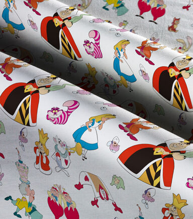 This Alice In Wonderland fabric is packed with all of your favorite characters such as Alice, Queen of Hearts, Hatter, cheshire cat and more! This 100% cotton fabric has a white background with the Alice in Wonderland characters packed in. This fabric would be perfect for a throw blanket or any other craft!