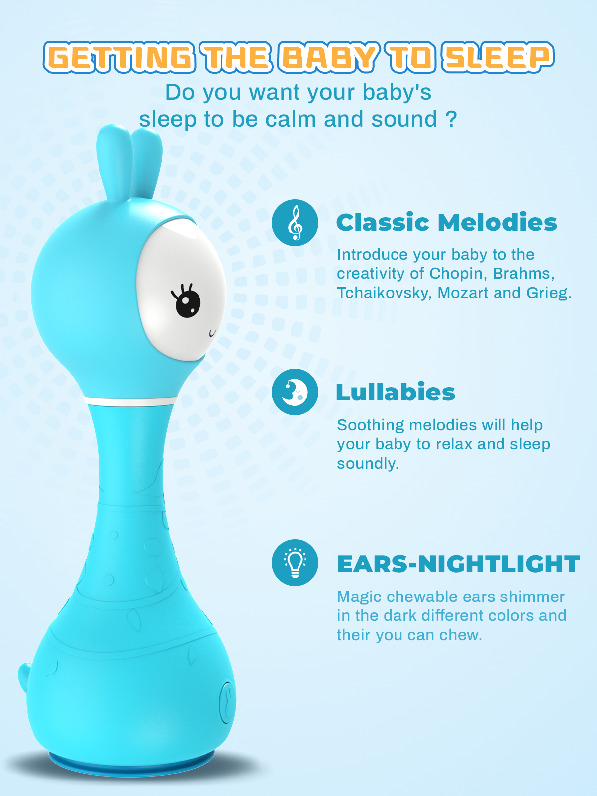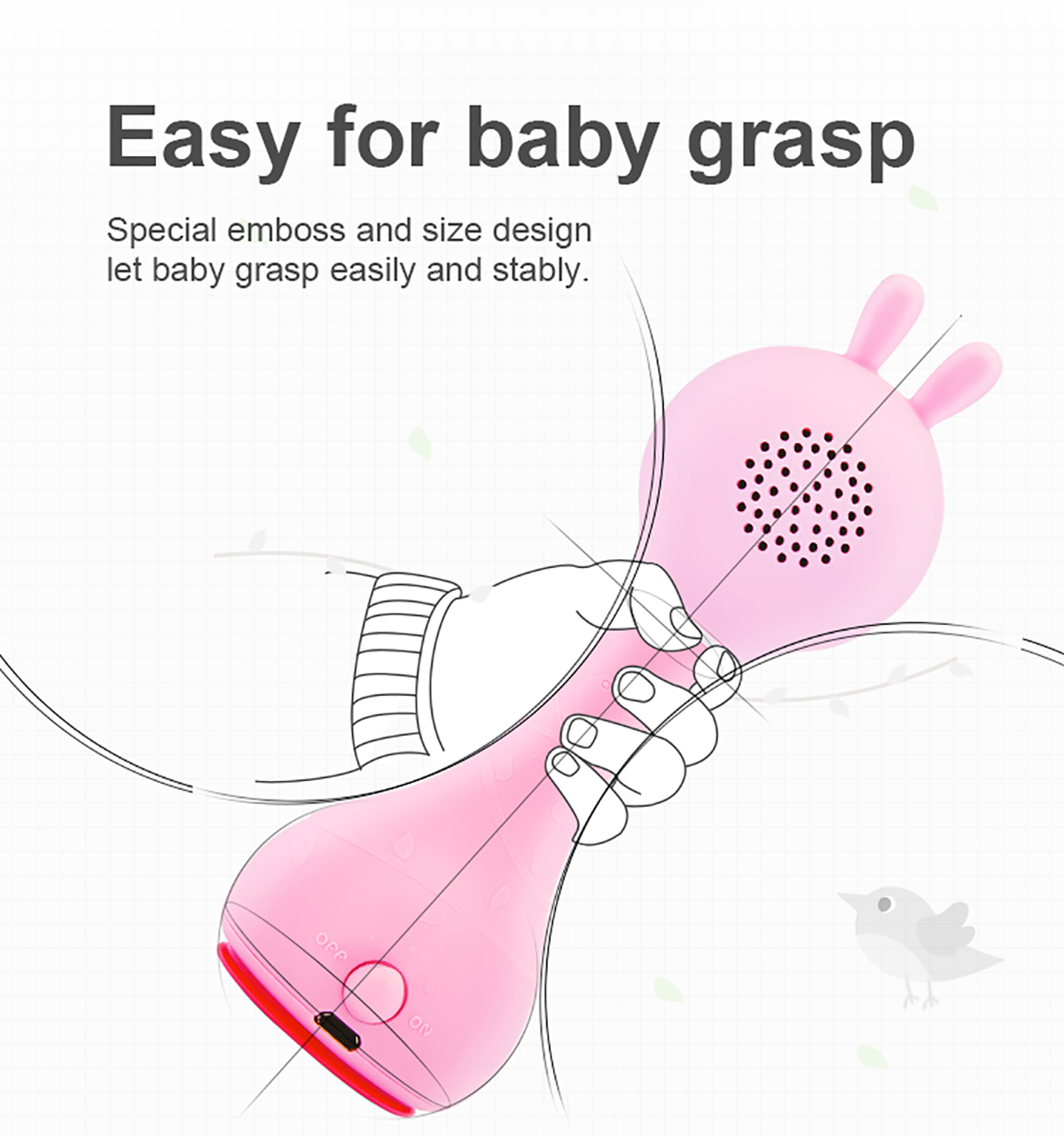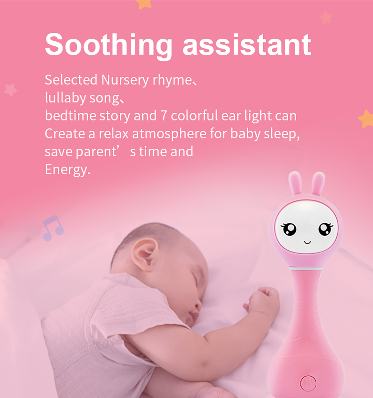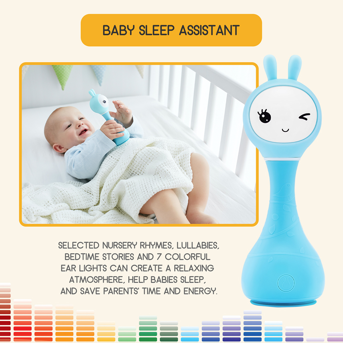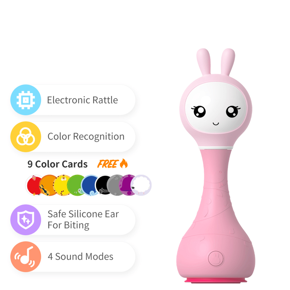 The appearance of this bunny rattle and its easy-to-use buttons are designed and adjusted just for young children's fingers. Smart bunny rattle can tell fairy tales and play music. Bunny rattle is also a fun rattle that has 66 ringtones. You just need to shake the toy to change the ringtone. The rabbit hand crank is made of durable shatterproof material-ABS plastic. The toy is safe because it has no sharp edges. The bunny rattle is also a great choice for a nursery night light as its long silicone ears can shine.