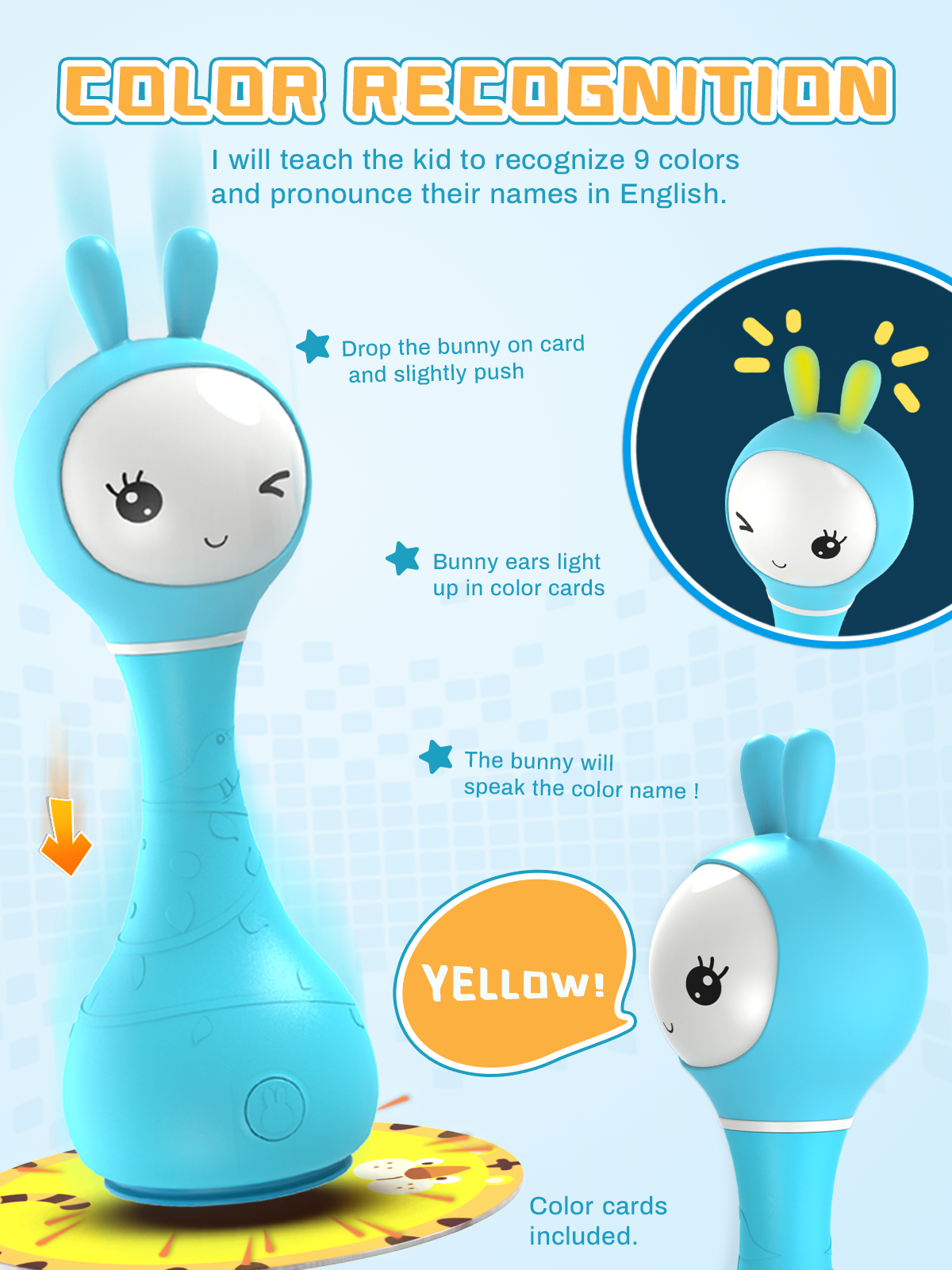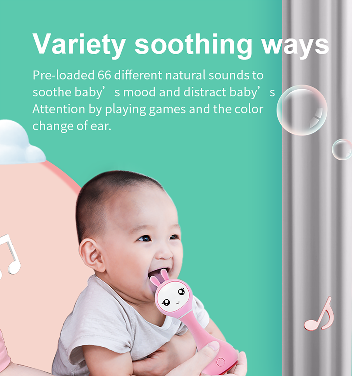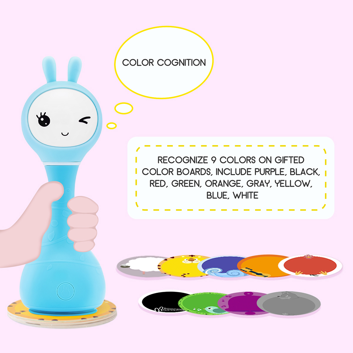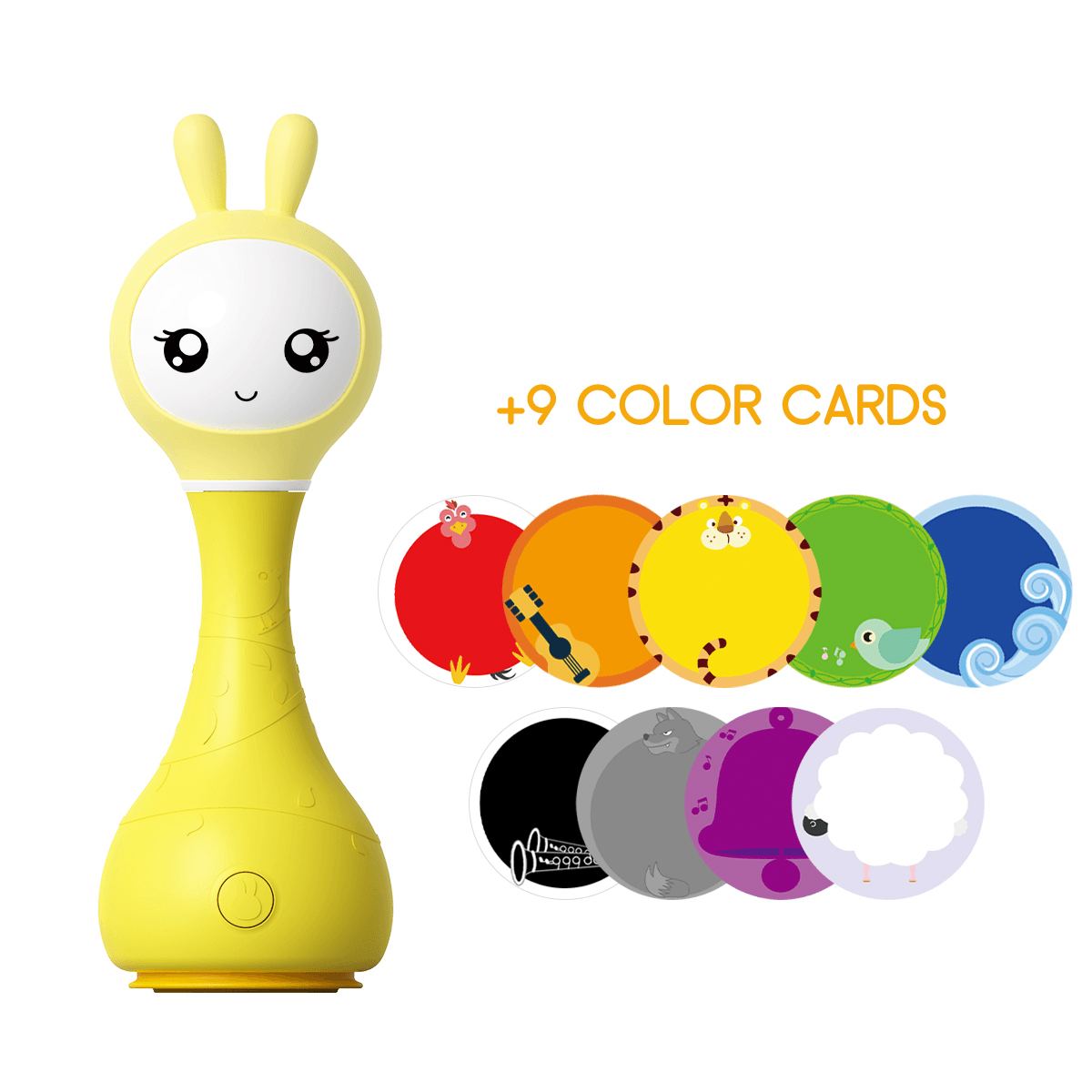 The appearance of this bunny rattle and its easy-to-use buttons are designed and adjusted just for young children's fingers. Smart bunny rattle can tell fairy tales and play music. Bunny rattle is also a fun rattle that has 66 ringtones. You just need to shake the toy to change the ringtone. The rabbit hand crank is made of durable shatterproof material-ABS plastic. The toy is safe because it has no sharp edges. The bunny rattle is also a great choice for a nursery night light as its long silicone ears can shine.