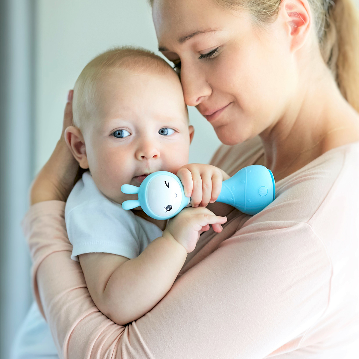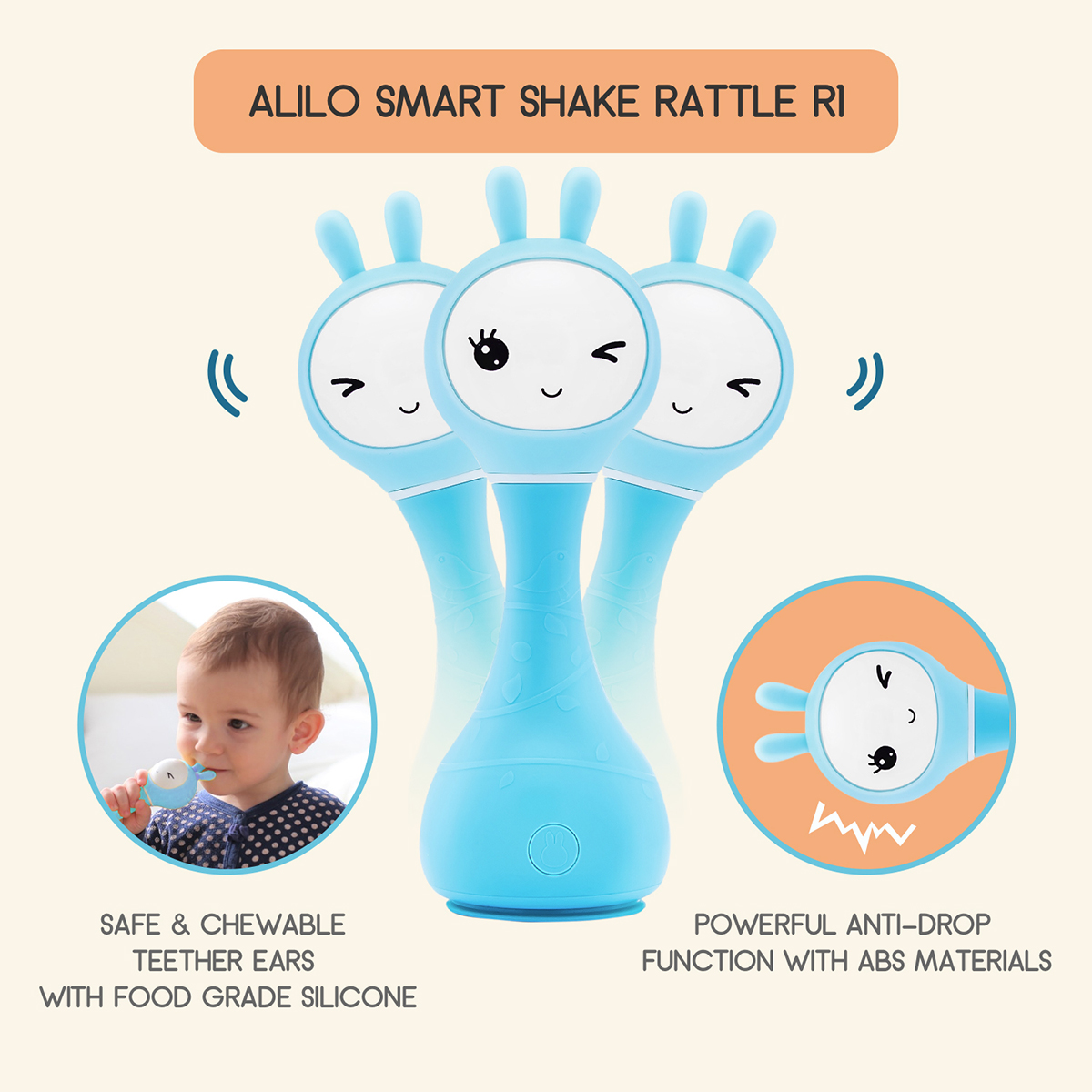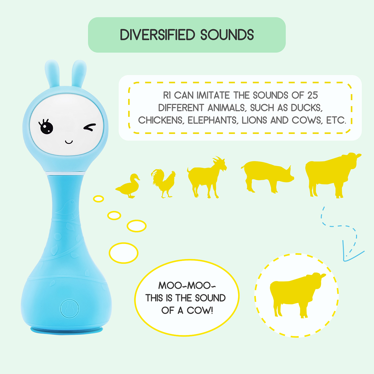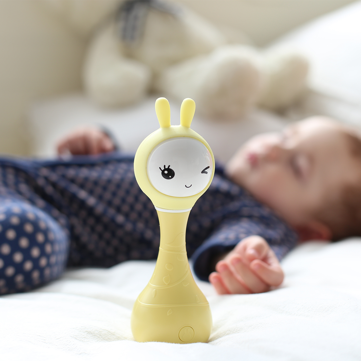The appearance of this bunny rattle and its easy-to-use buttons are designed and adjusted just for young children's fingers. Smart bunny rattle can tell fairy tales and play music. Bunny rattle is also a fun rattle that has 66 ringtones. You just need to shake the toy to change the ringtone. The rabbit hand crank is made of durable shatterproof material-ABS plastic. The toy is safe because it has no sharp edges. The bunny rattle is also a great choice for a nursery night light as its long silicone ears can shine.