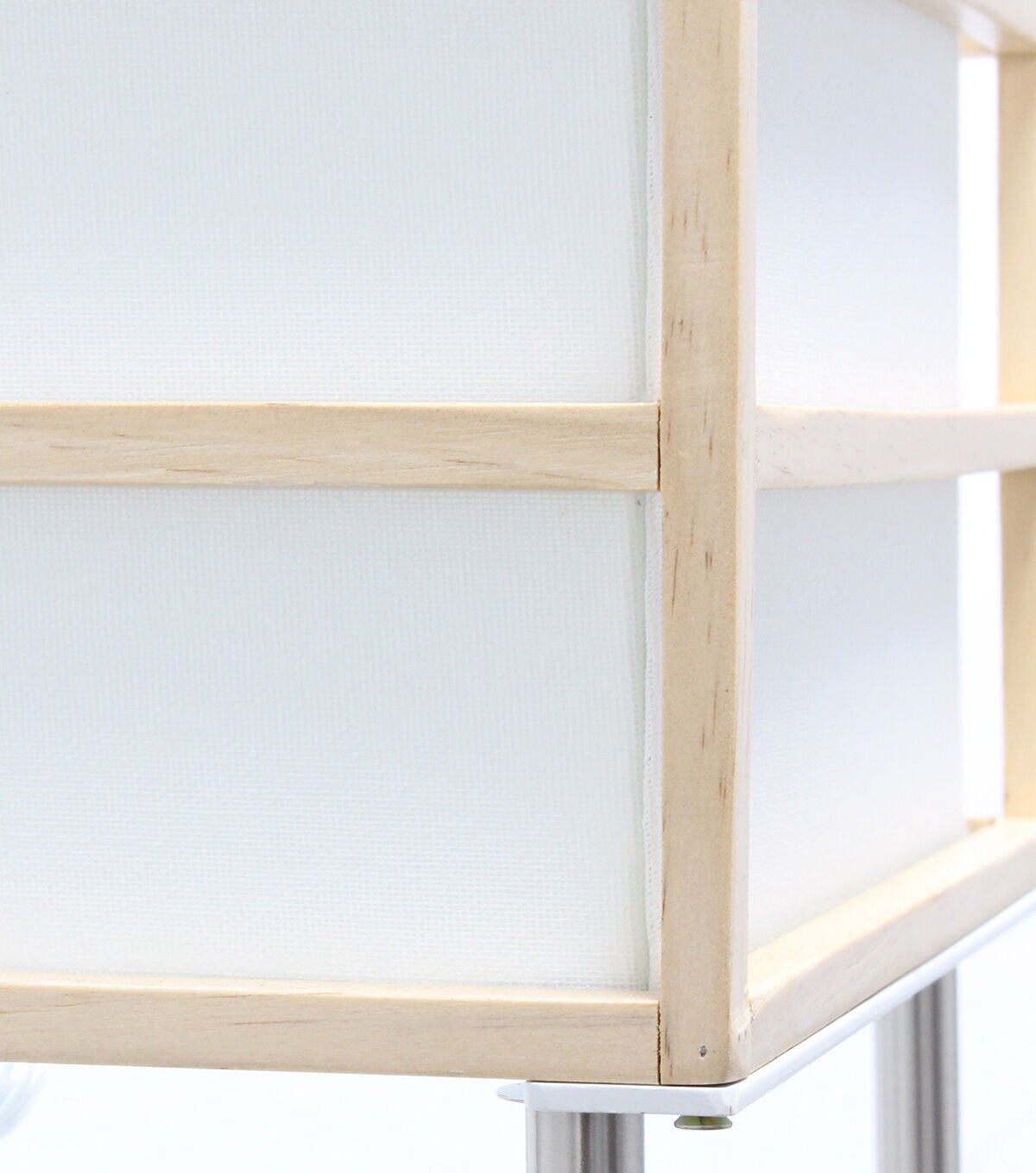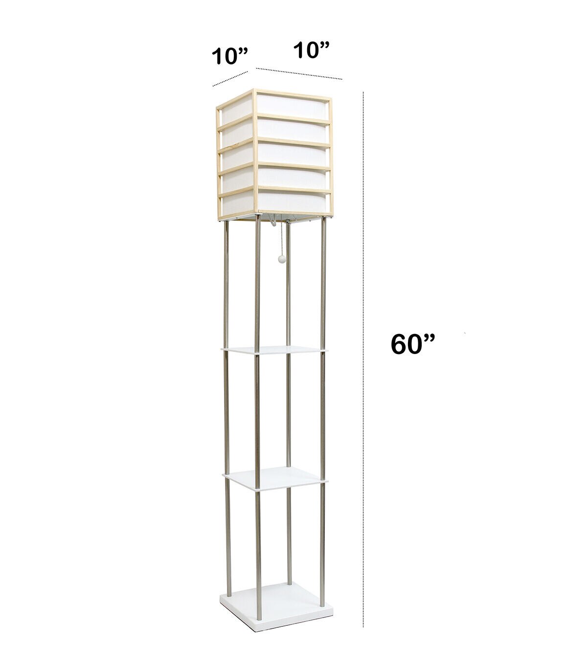 Illuminate your living space in style with our floor shelf lamp with linen shade. This gorgeous piece is accented with brushed nickel and birch wood. The shelves are versatile and can be used to display photographs and other memorabilia while the linen lamp shade casts a soft, warming light throughout your living space. With its' clean and modern lines, this lamp adds sophistication and style to any home's décor.