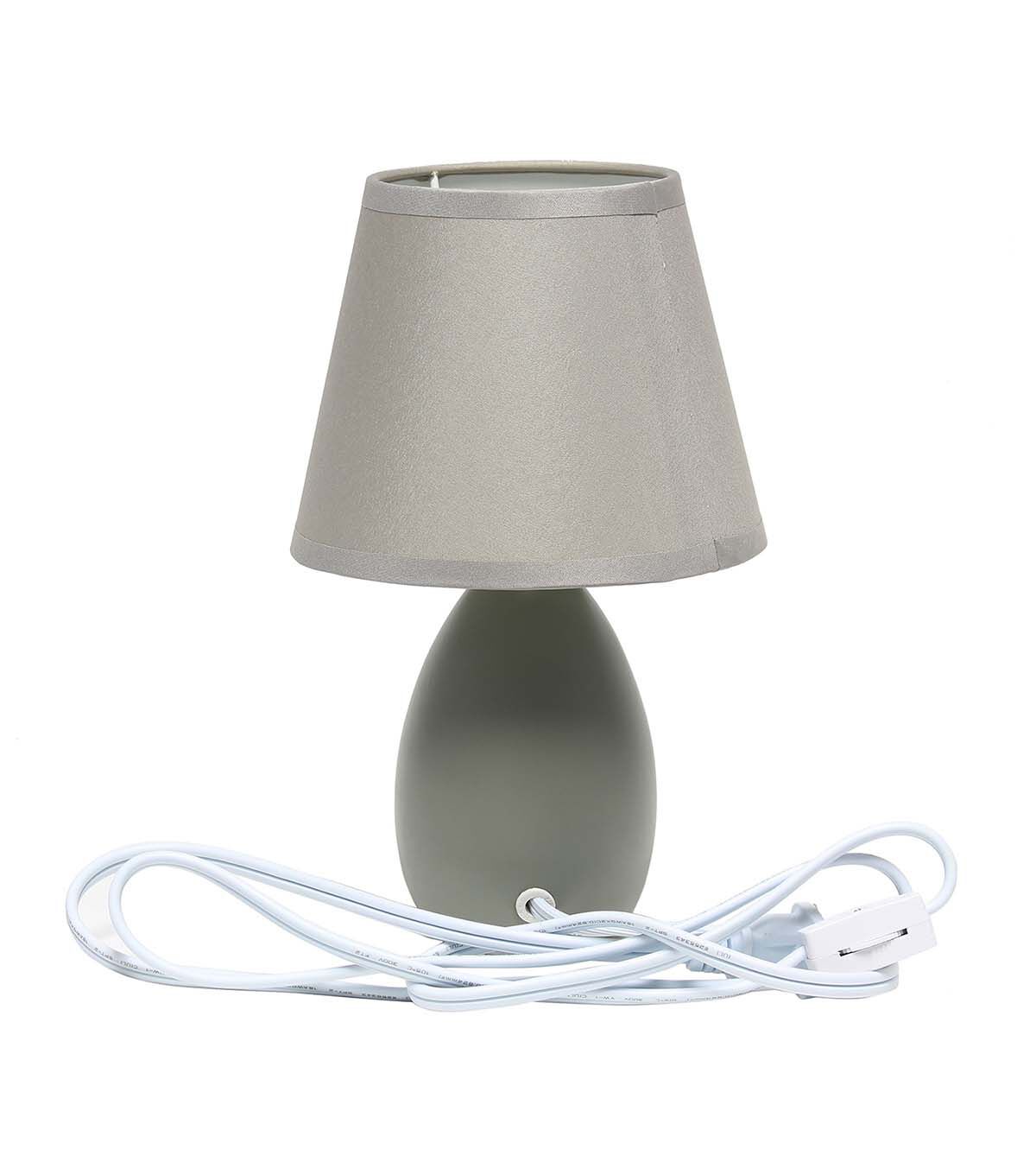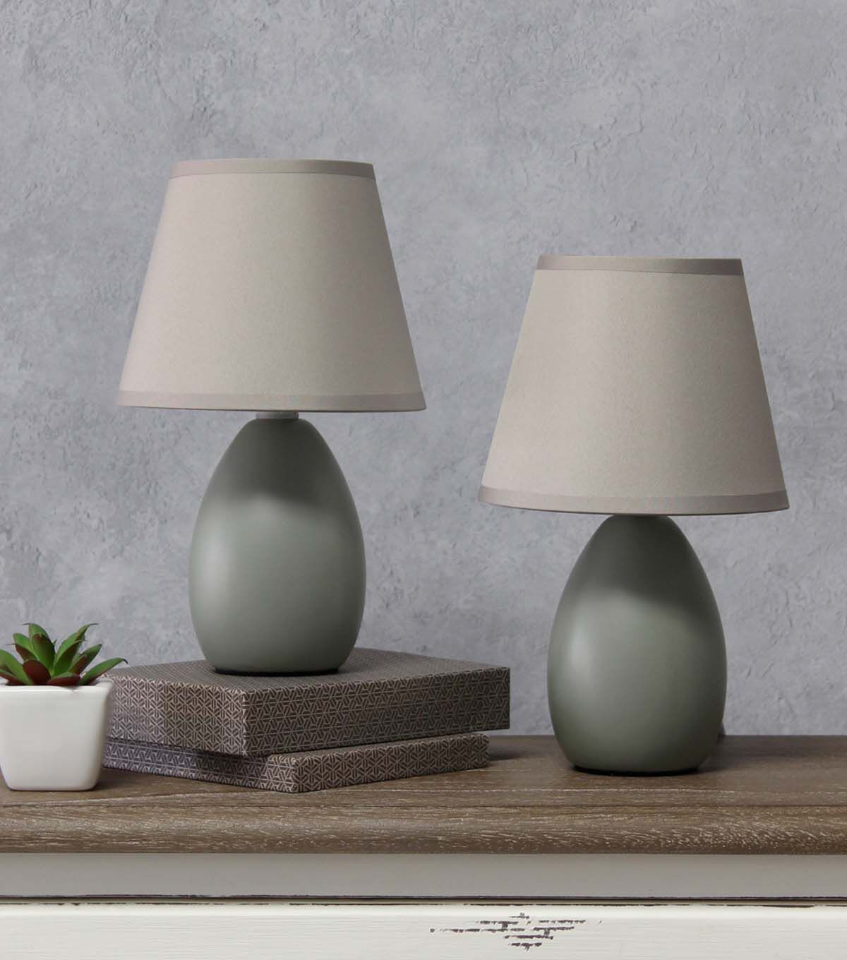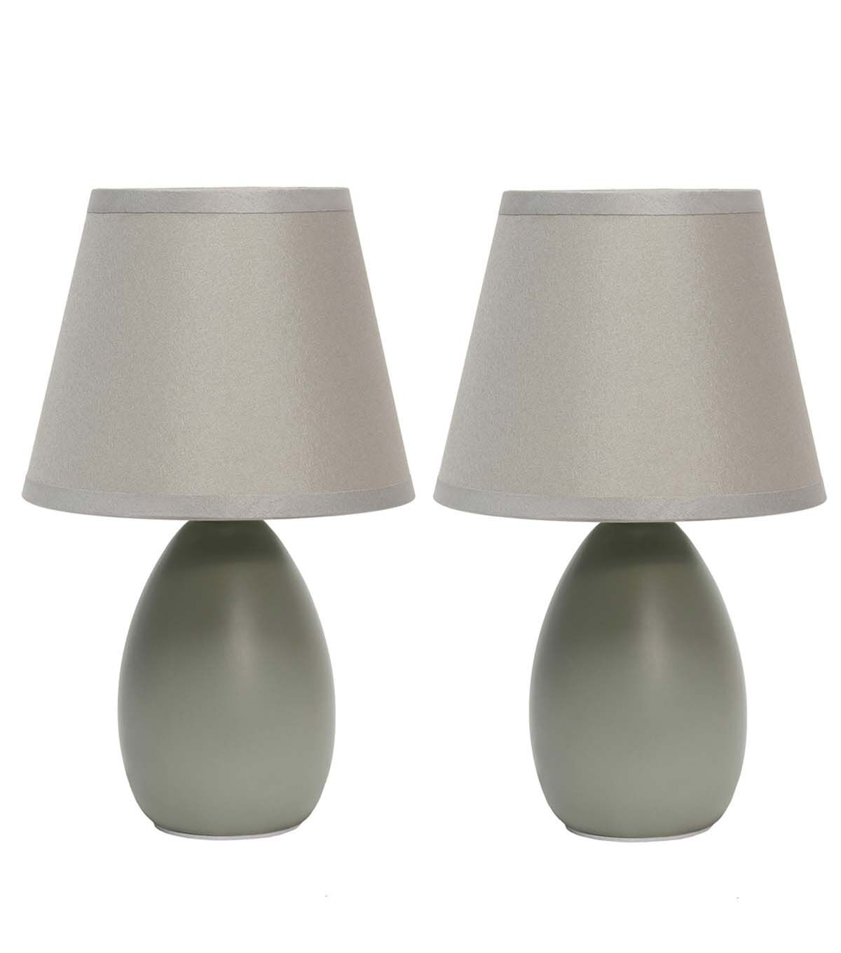 A petite table lamp set, each made primarily of ceramic with its oblong base shape sits beneath a matching colored tapered fabric shade for an overall effortlessly styled lamp suited for both your décor and lighting needs. A number of color options are available in this style, to compliment your decor just right.
