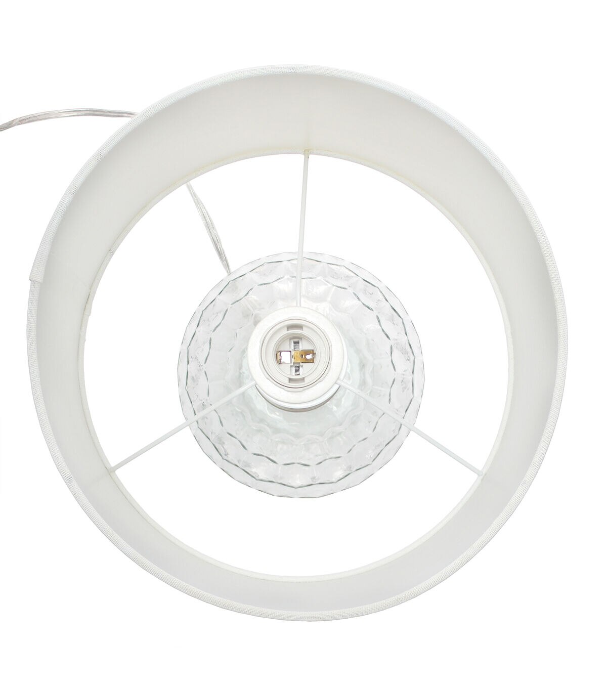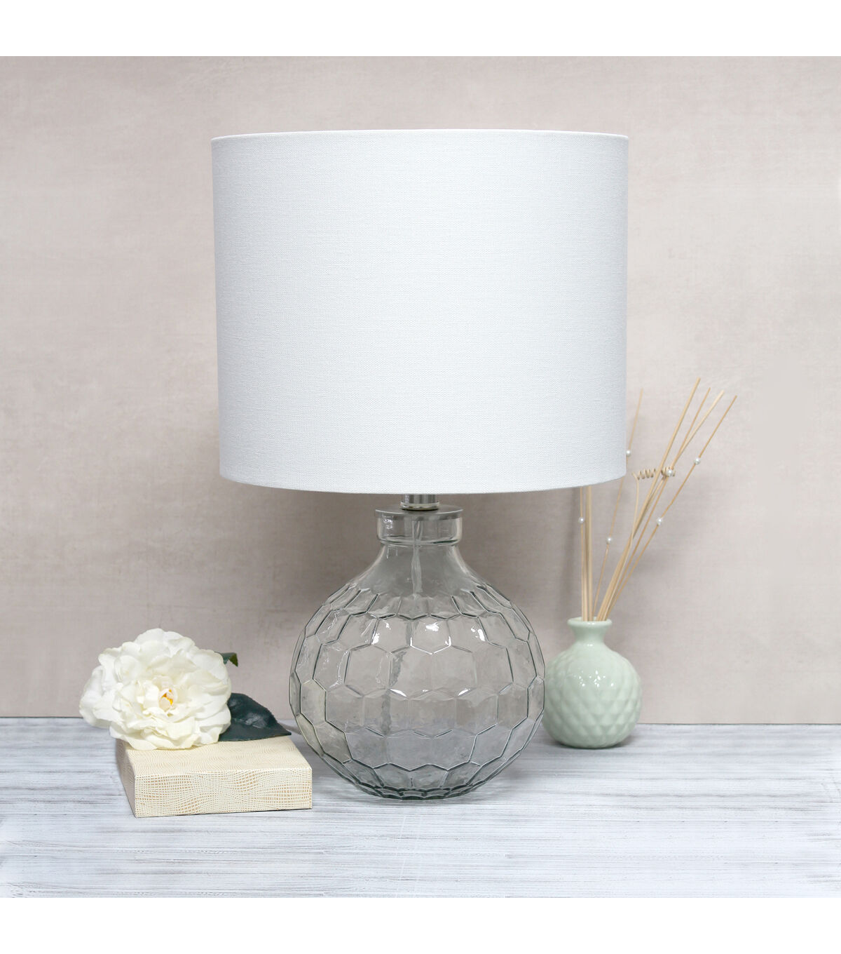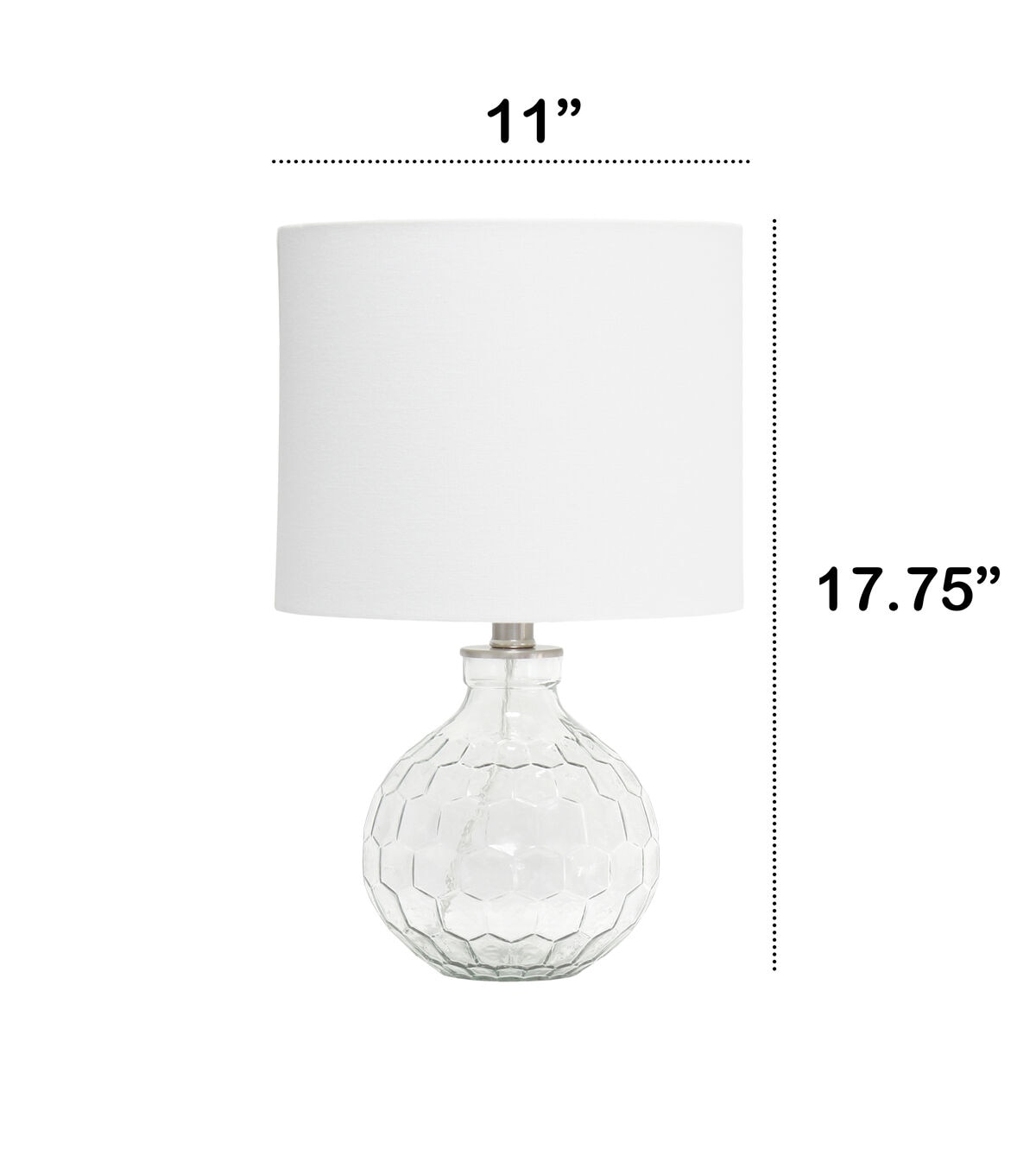 A transparent base etched in a honeycomb pattern throughout, rests beneath a white drum fabric shade making this fixture essential for both your lighting and décor needs. Neutral, yet slightly sophisticated for your space, there's no better combination that this glass/fabric duo perfectly designed to sit along bedside, your living room side table, or entryway to your home!