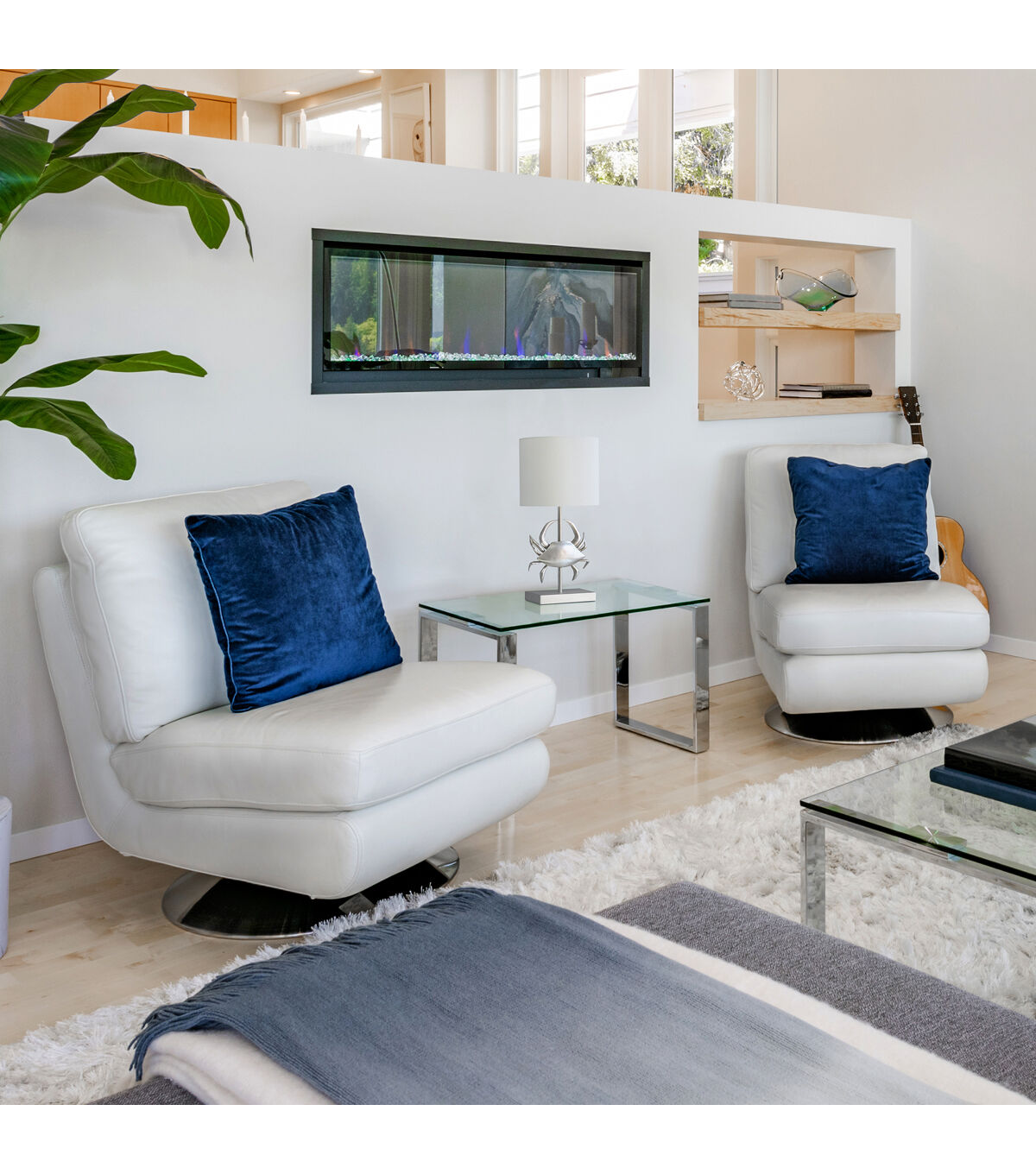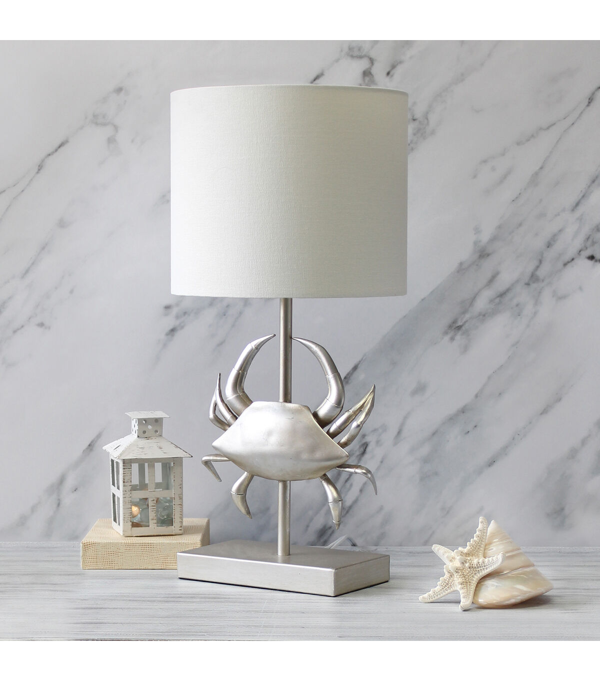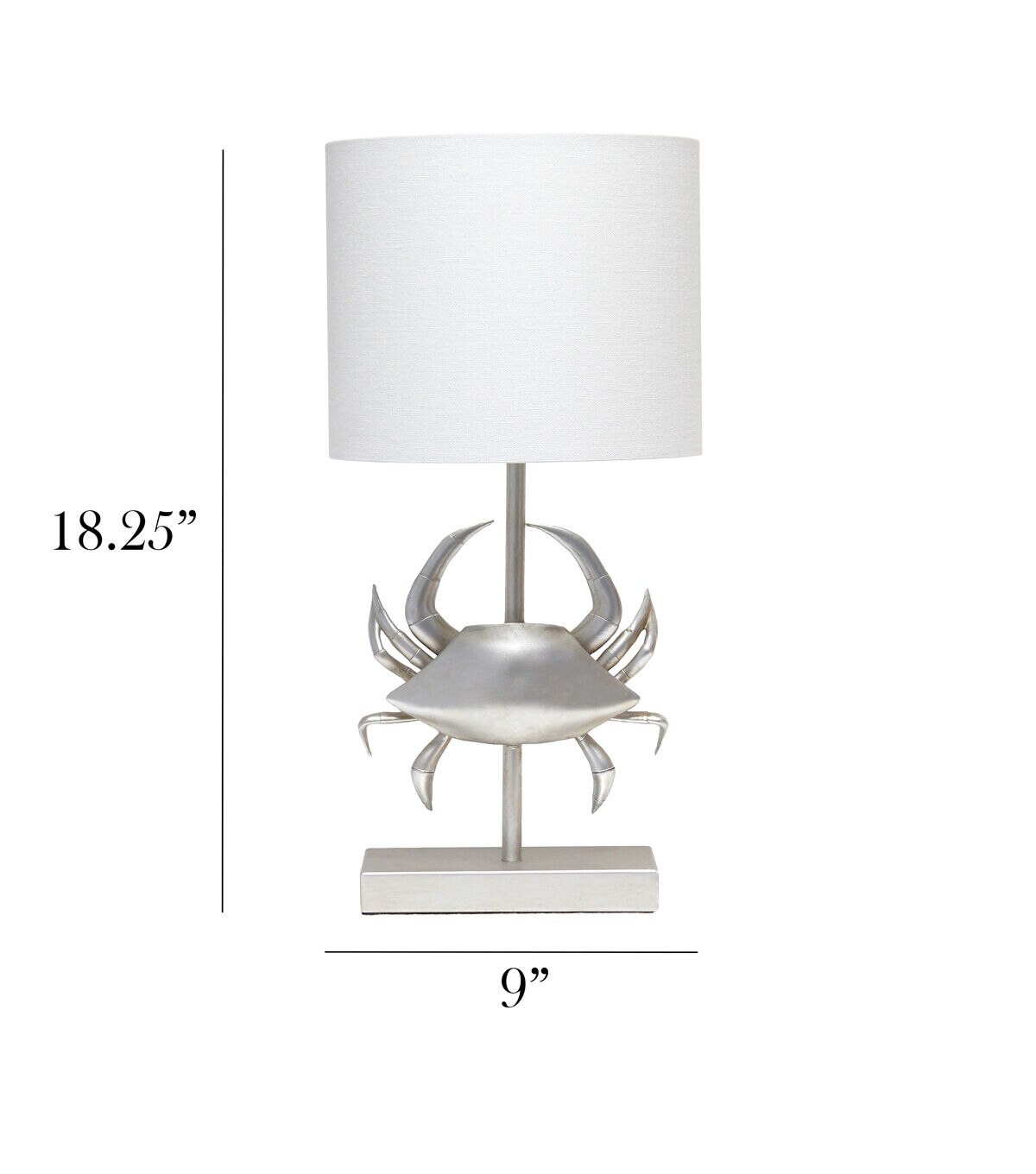 Atop a rectangular shaped base stems a pinching crab made of polyresin and finished in brushed nickel throughout, paired perfectly with a white fabric drum shade. This fun shaped lamp not only serves your lighting needs, but is a perfect piece of accent décor for your space, especially for nautical, coastal, and shoreside environments.