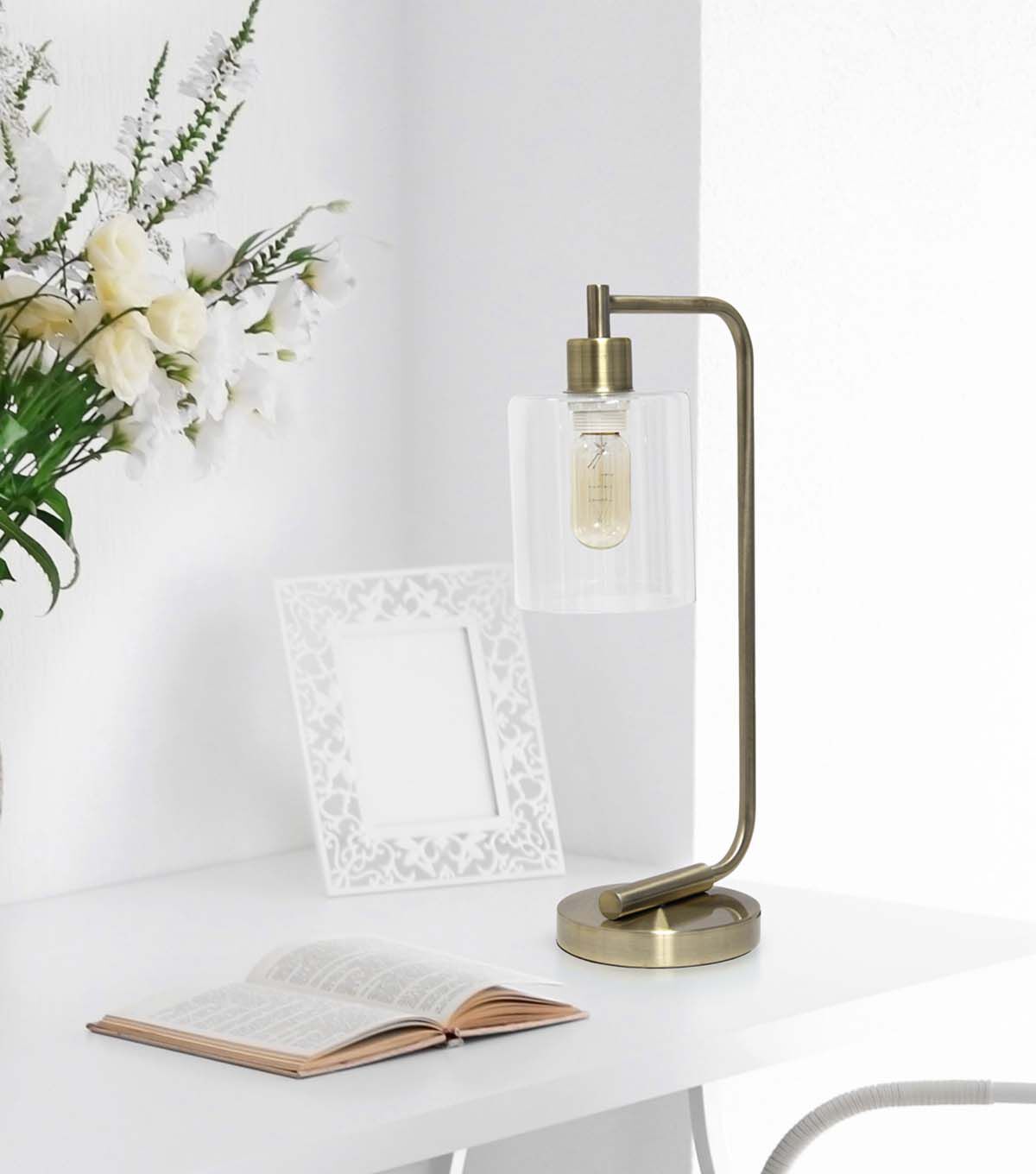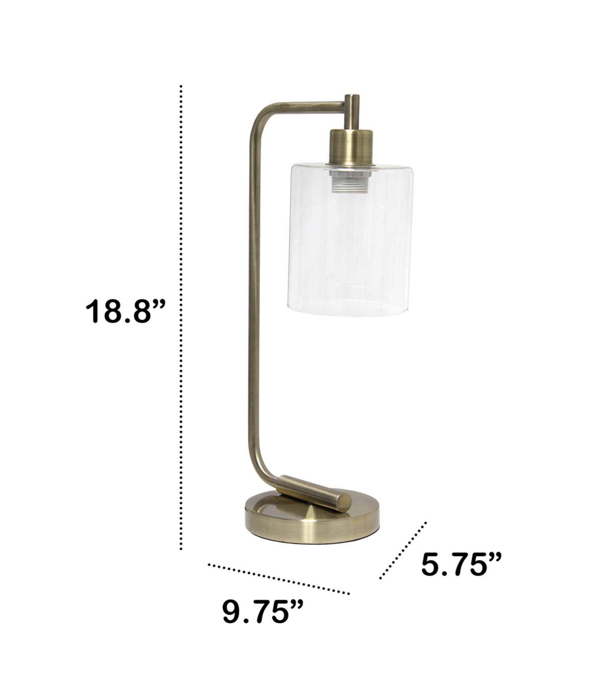 Simple yet modern, this desk lamp is sure to add a touch of style to any room in your home. This beautifully crafted iron desk lamp combines a simple base with a curved arm and a clear cylinder glass shade for a sleek and sophisticated combination. Perfect for your desk, foyer or bedside table for a modest, refined look in trendy lighting. **HELPFUL TIP: To get the complete industrial look, we recommend using a decorative Edison/Vintage bulb (not included). **