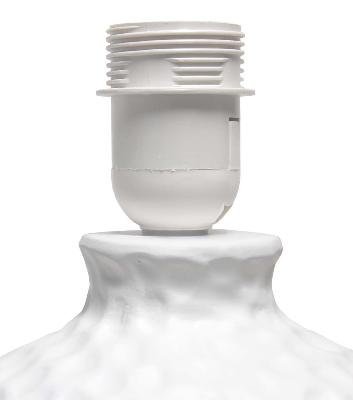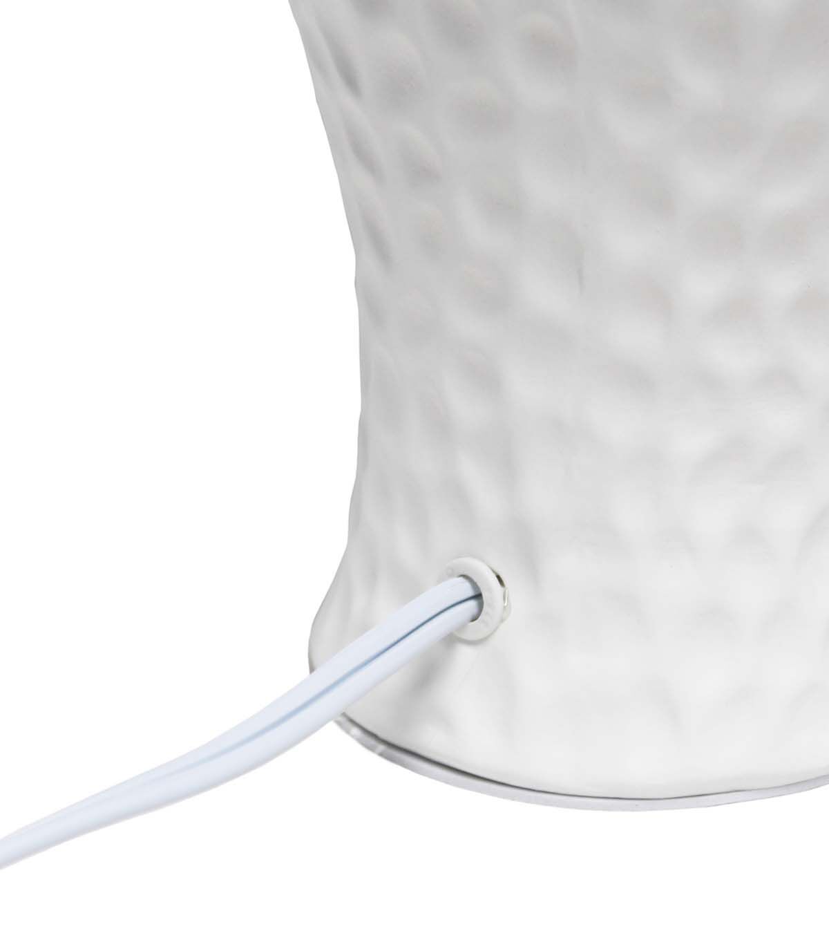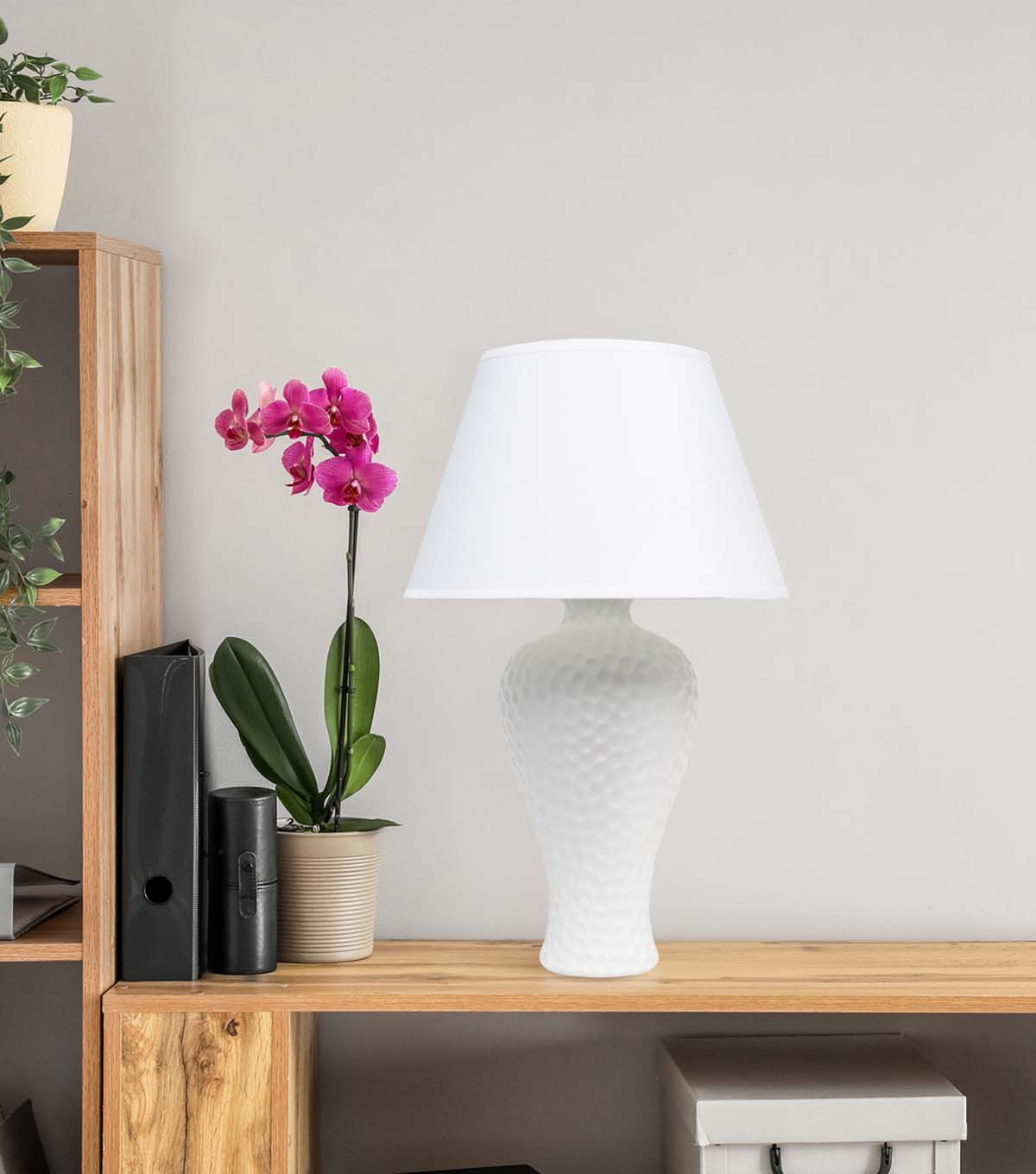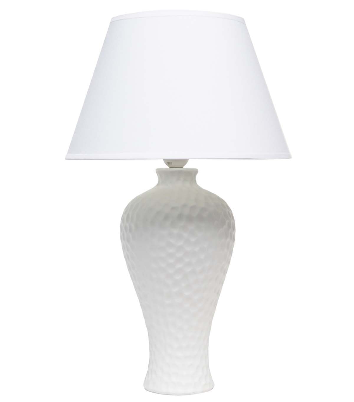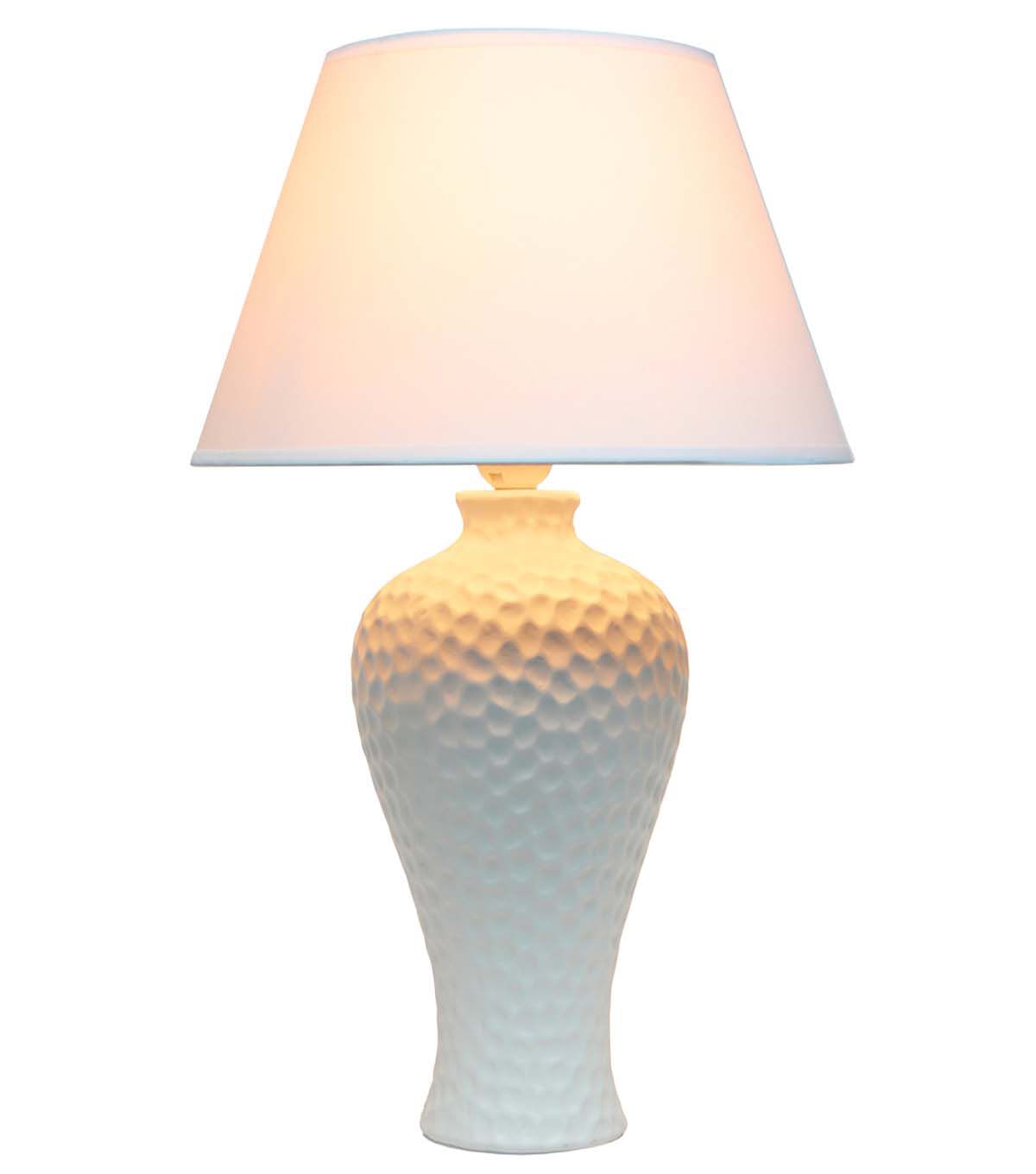This beautifully designed table lamp made primarily of ceramic features a bendy and curvy shape with an imprint style texture throughout its painted base, in the color of your choice. It is then paired with a matching empire fabric shade that compliments its surrounding environment perfectly while illuminating your space just right.