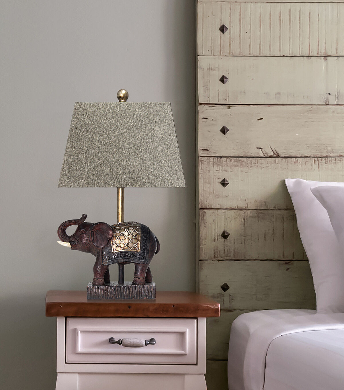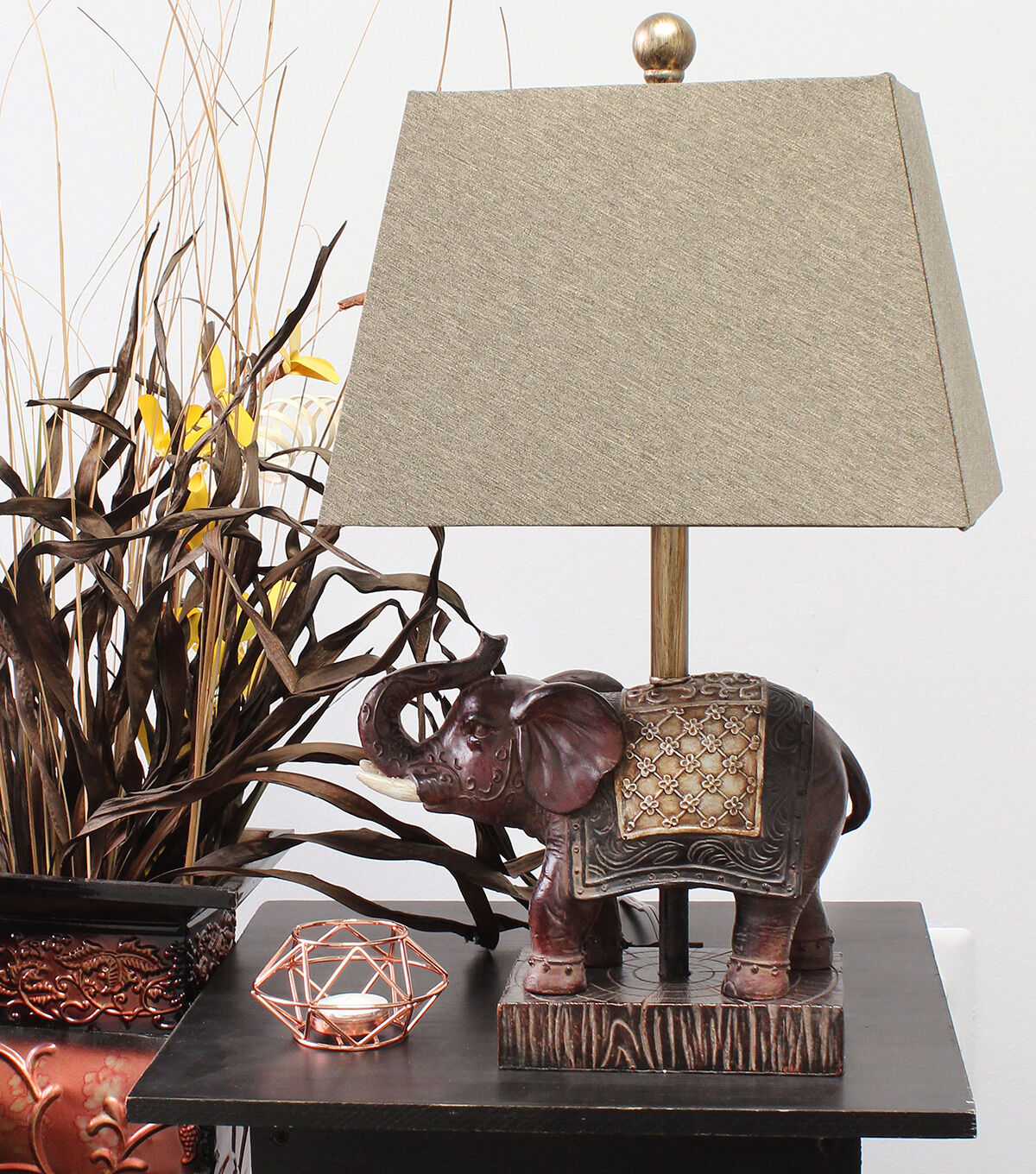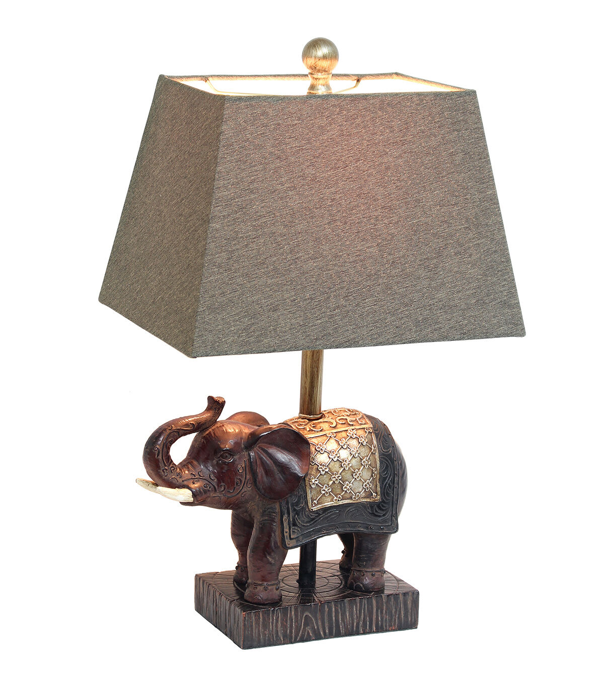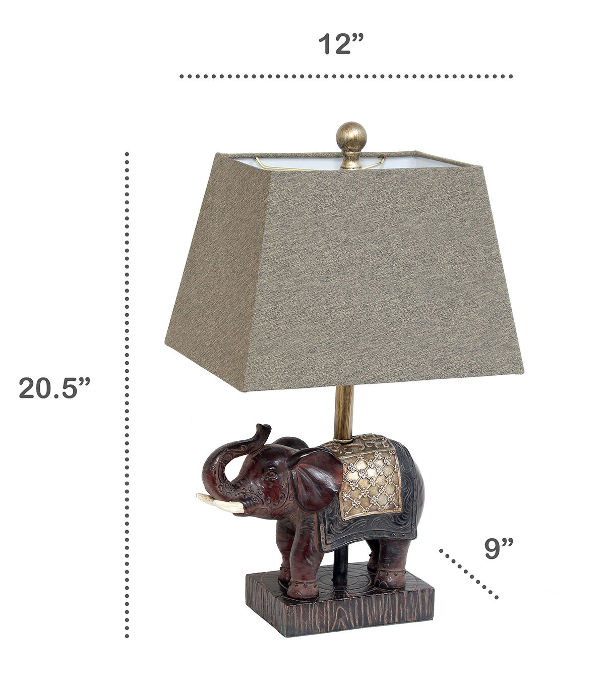 Add a touch fo luxury to any room in your home with this stylish elephant lamp. The brown resin base is detailed with hints of gold and topped off with a tapered brown fabric shade. Perfect for your living room, bedroom, office or kids room!