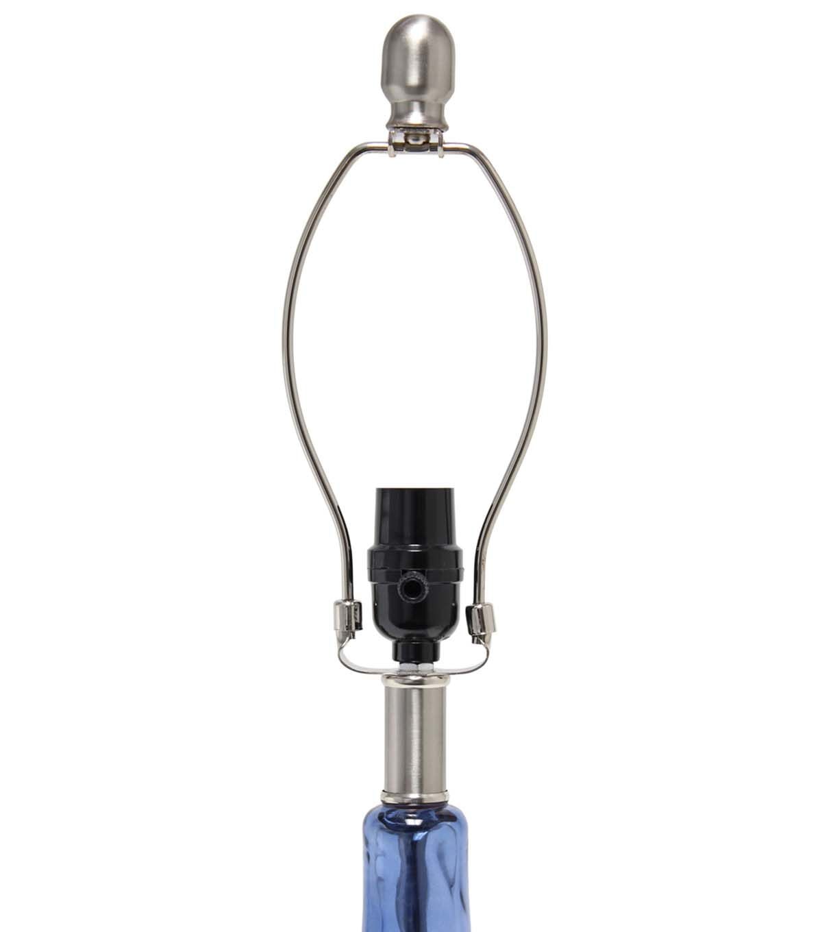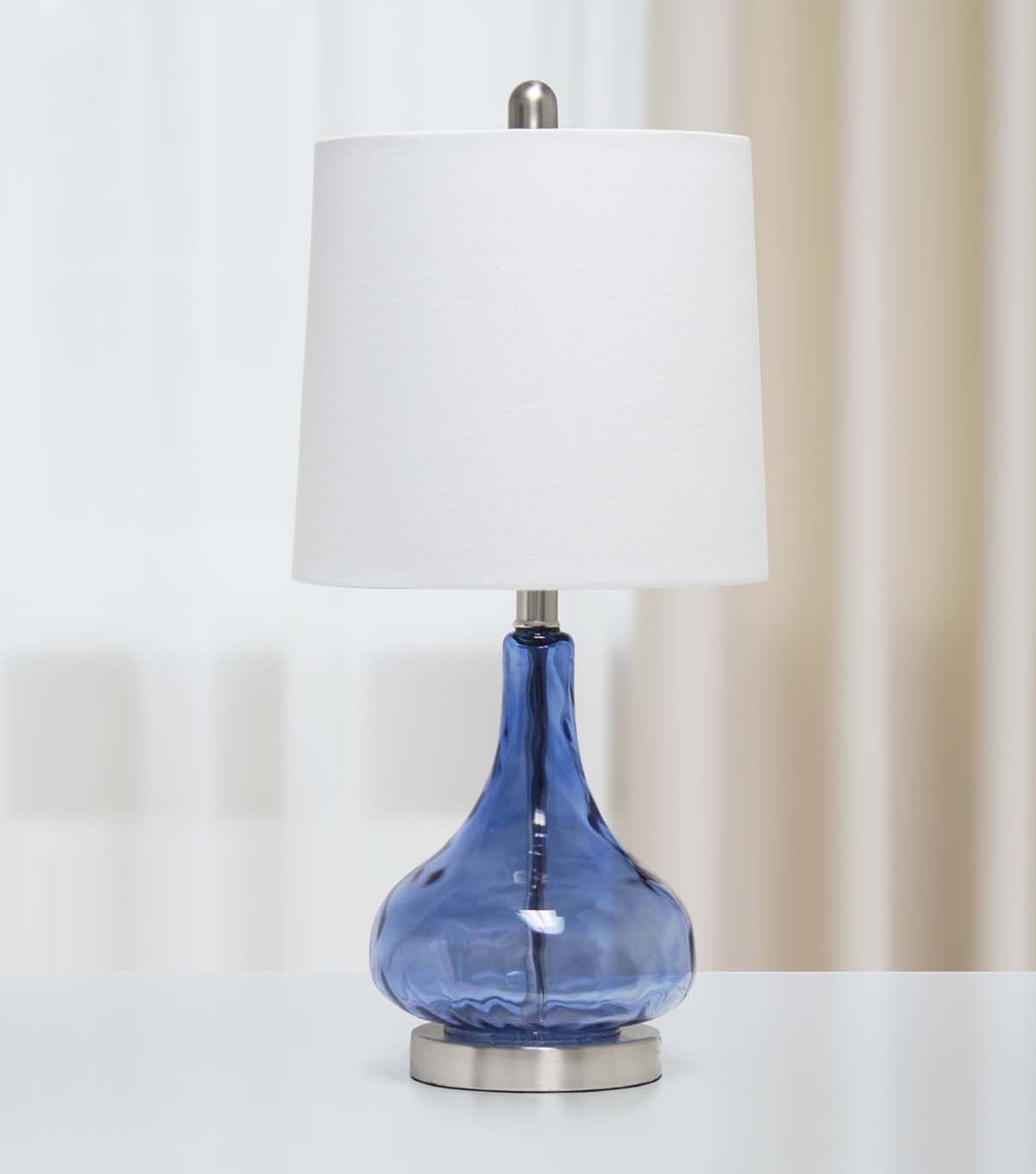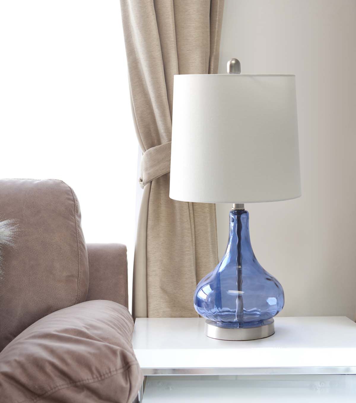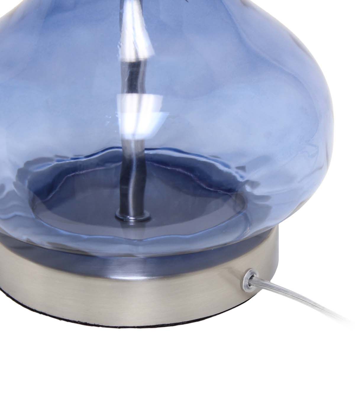 Add some charm to your room as you light up this stylish glass table lamp. The rippling texture across the transparent colored glass base balances perfectly beneath a tapered fabric shade. Soft and delicate for a nursery, yet sophisticated enough to flourish in your living room, bedroom, or foyer!