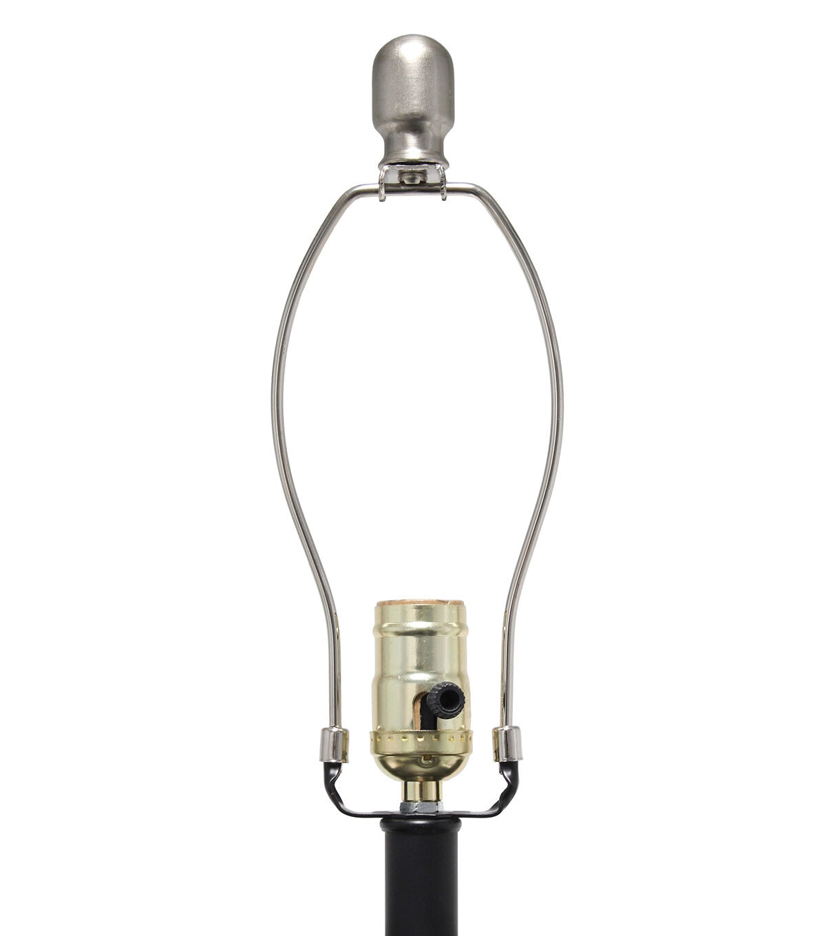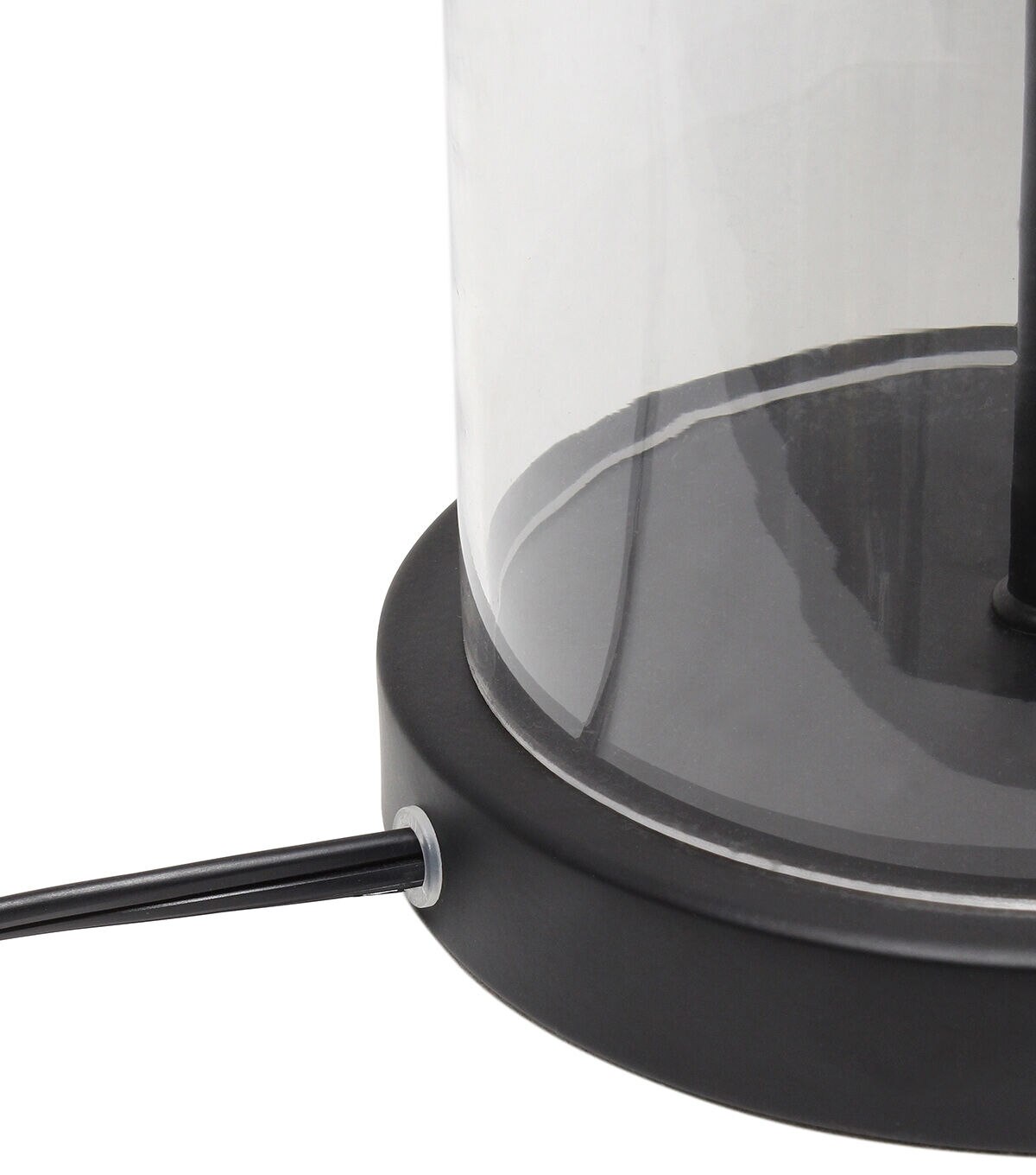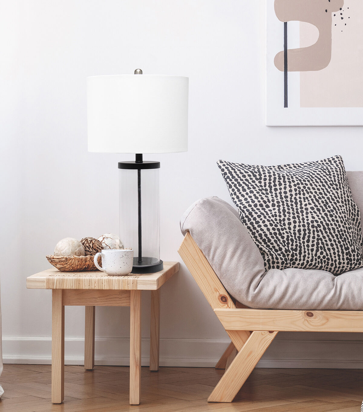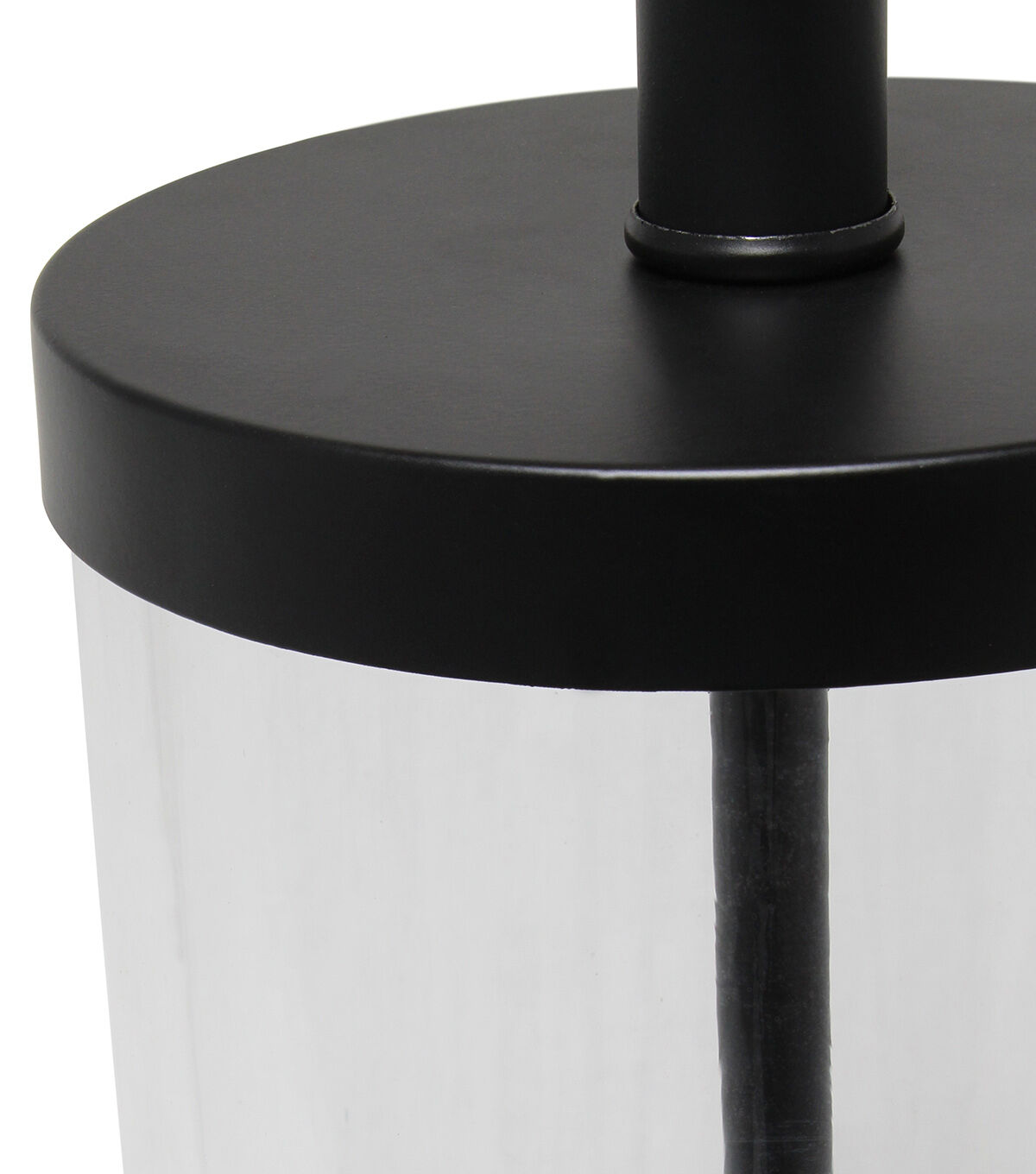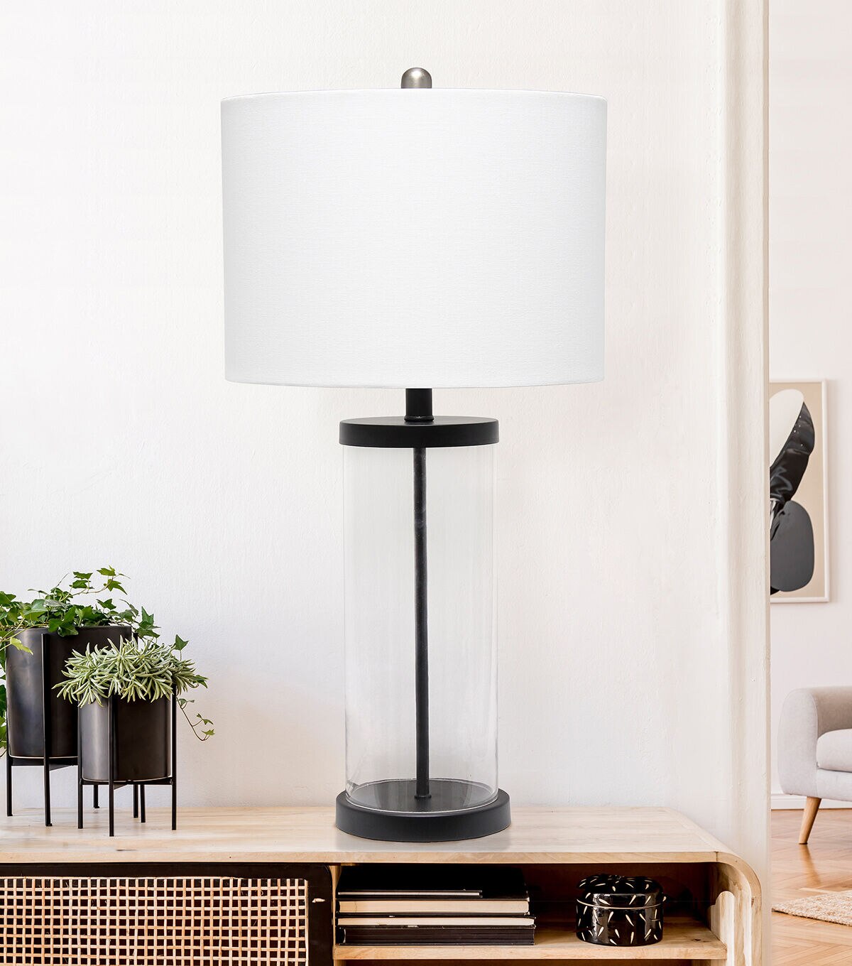 Classic yet contemporary this lamp will light up any room in your home with style! This lamp features a clear glass cylindrical base with black metal on top and bottom for a clean, sophisticated look. Perfect for your living room, bedroom, office, or anywhere you need to add a tasteful update!