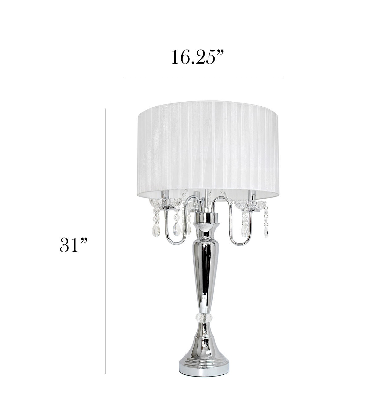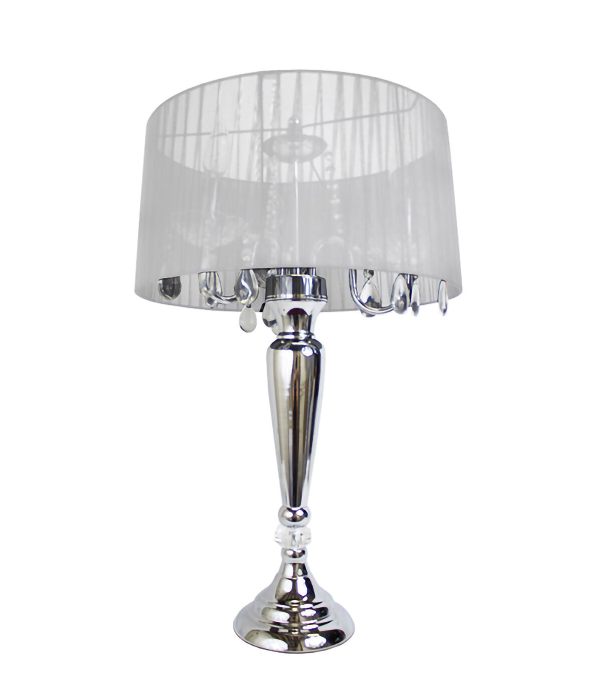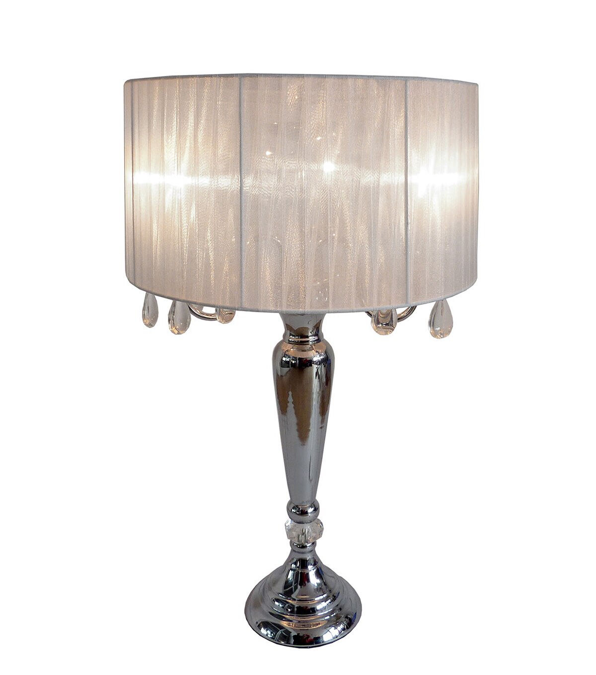 Crystal drop table lamp. A modern twist on a classic table lamp. Features a sheer shade, flawless chrome finish, and beautiful draping crystals. Great fit for any room! Use it in a bedroom to create a romantic atmosphere or in a living room or office to add some fresh decorative flair. We believe that lighting is like jewelry for your home. Our products will help to enhance your room with elegance and sophistication.