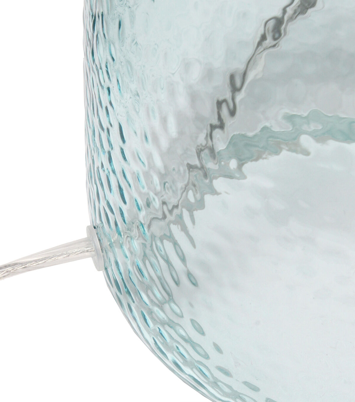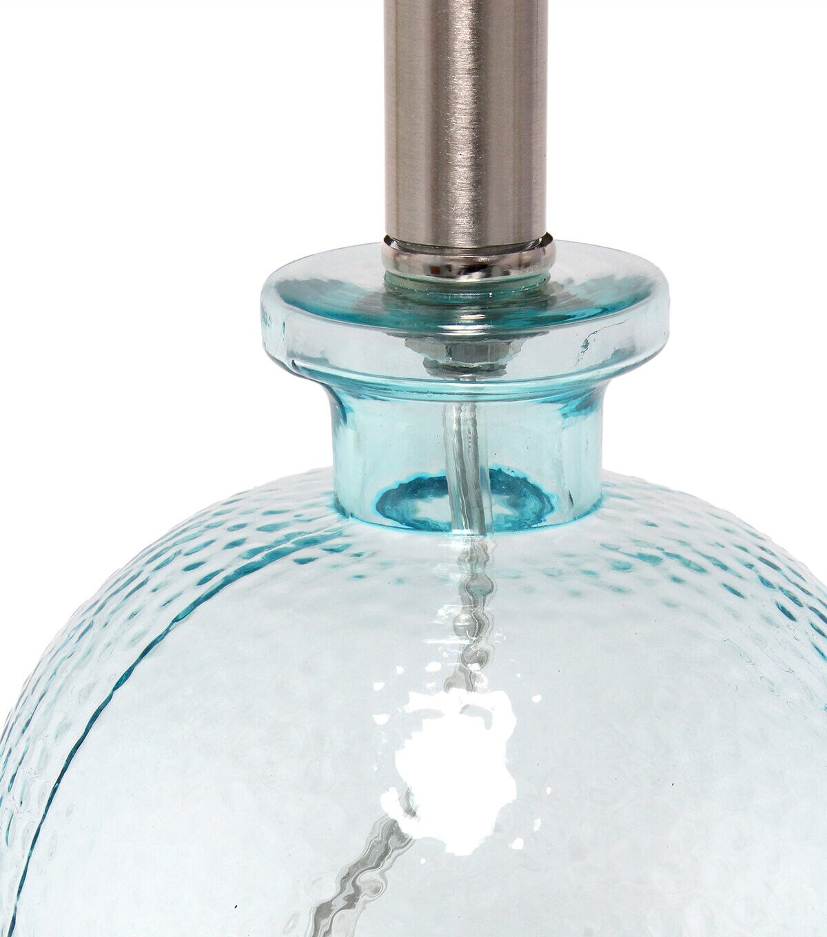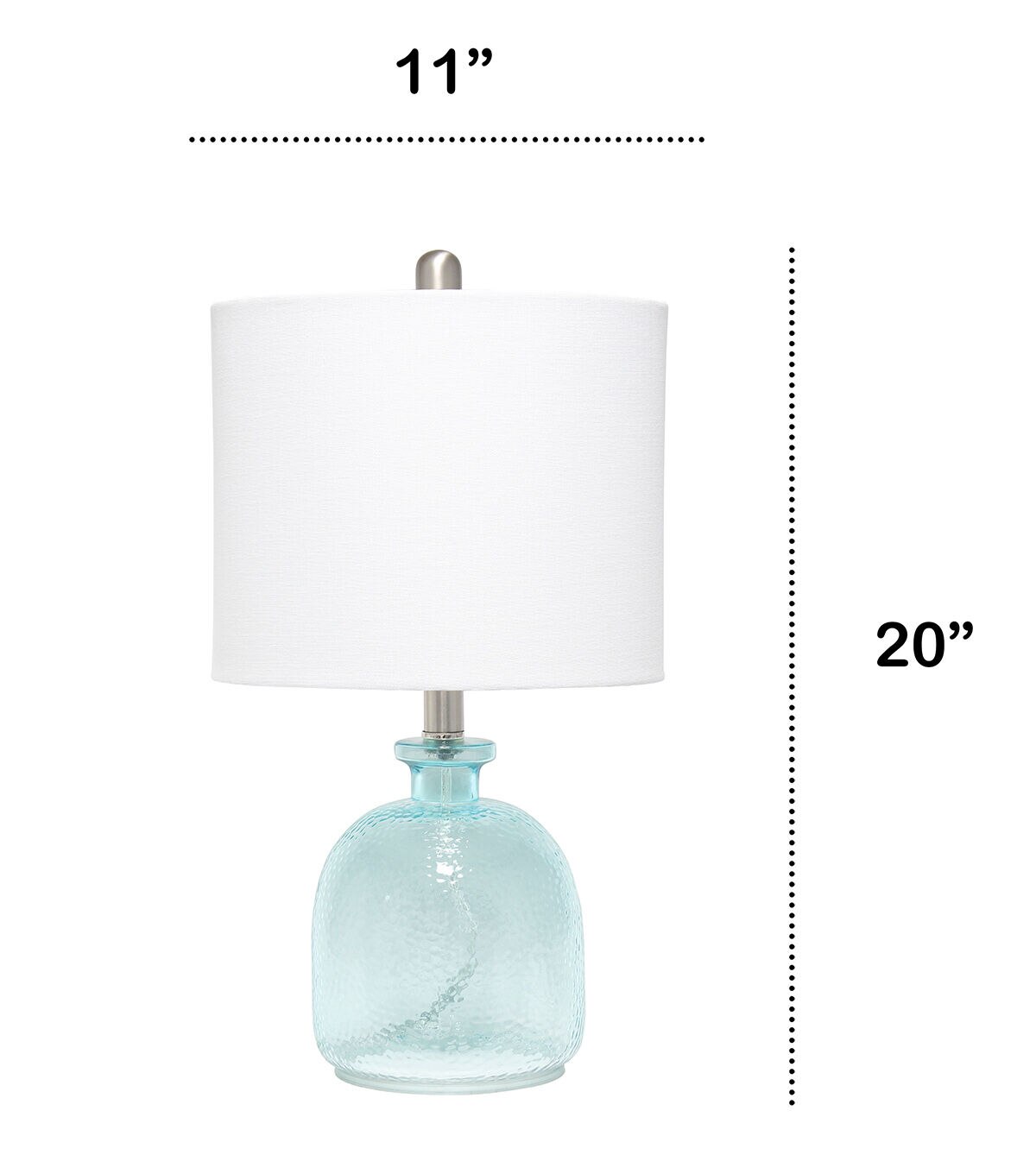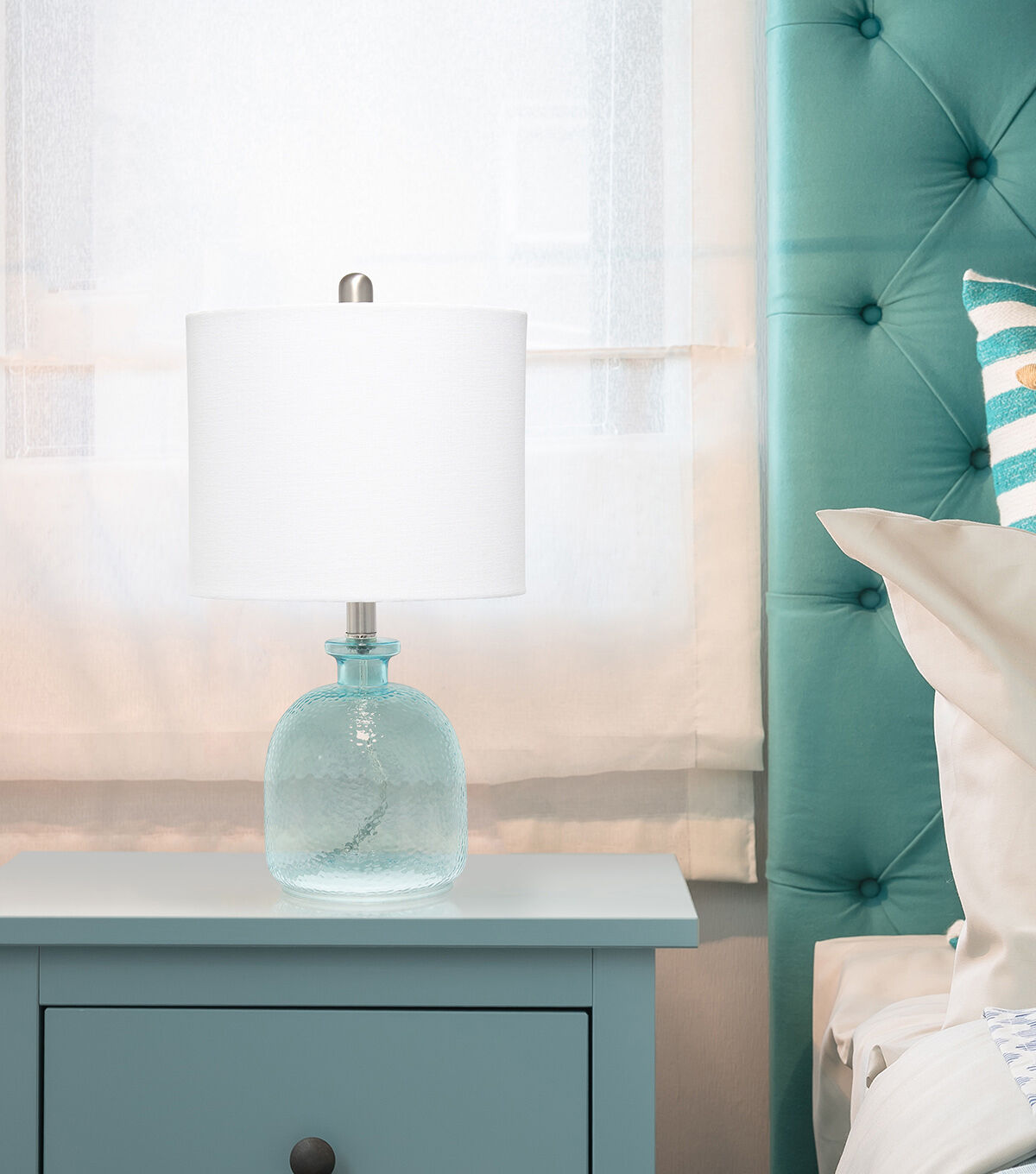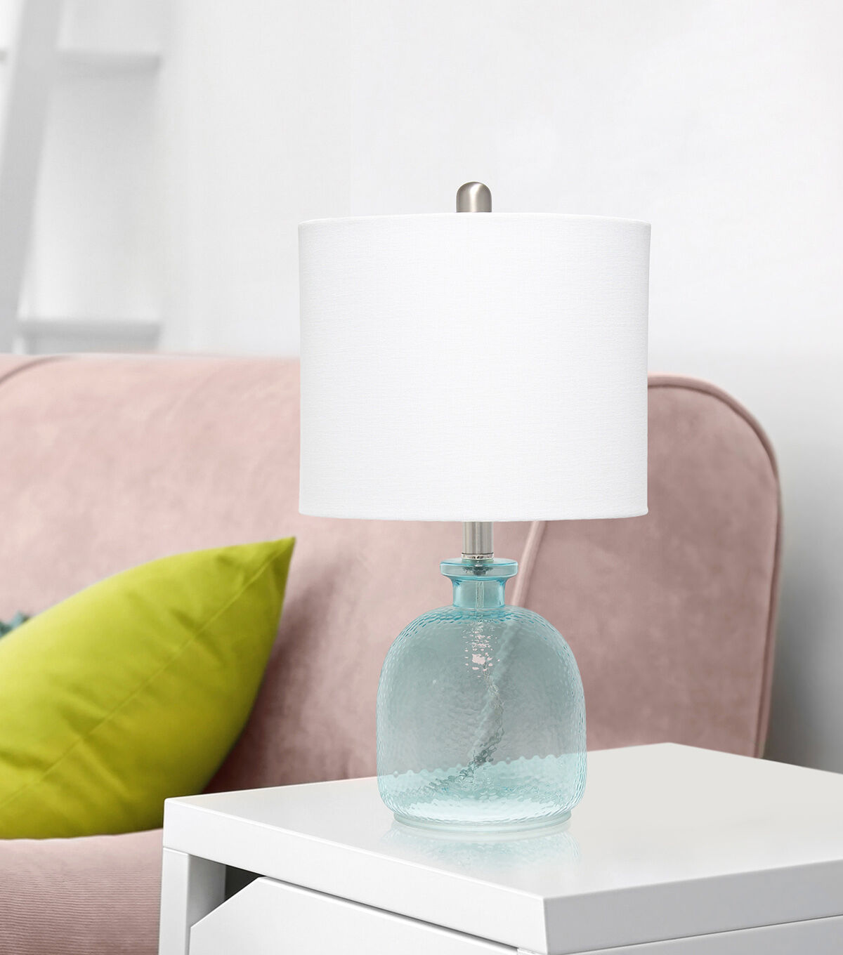 With a textured glass base and white fabric drum shade, this lamp is sure to update any room in your home with a little charm. This lovely lamp is crafted with an open bottom glass base in a clear blue color. Perfect for adding the little refresh to your living room, bedroom, foyer or office that you've been looking for!