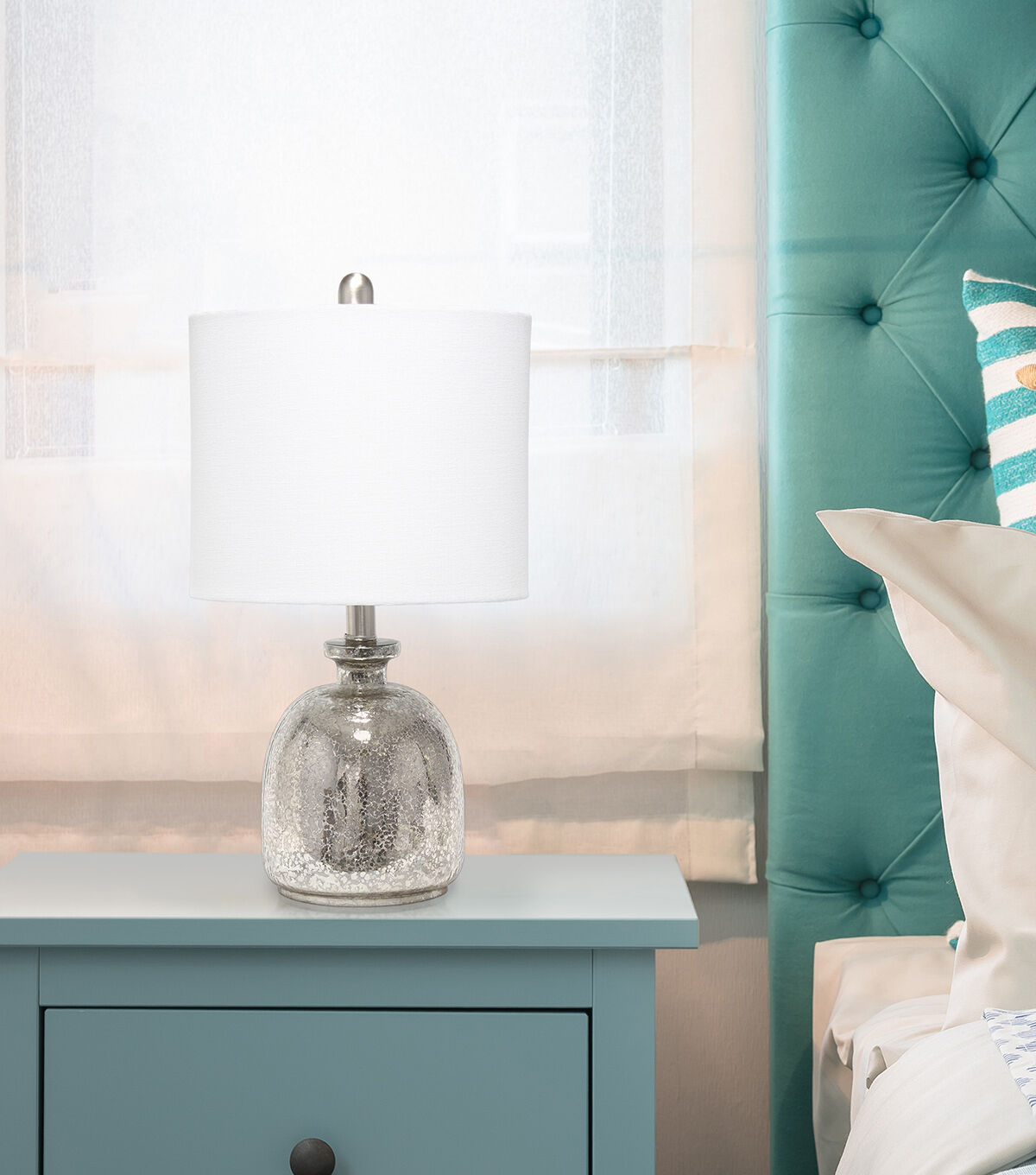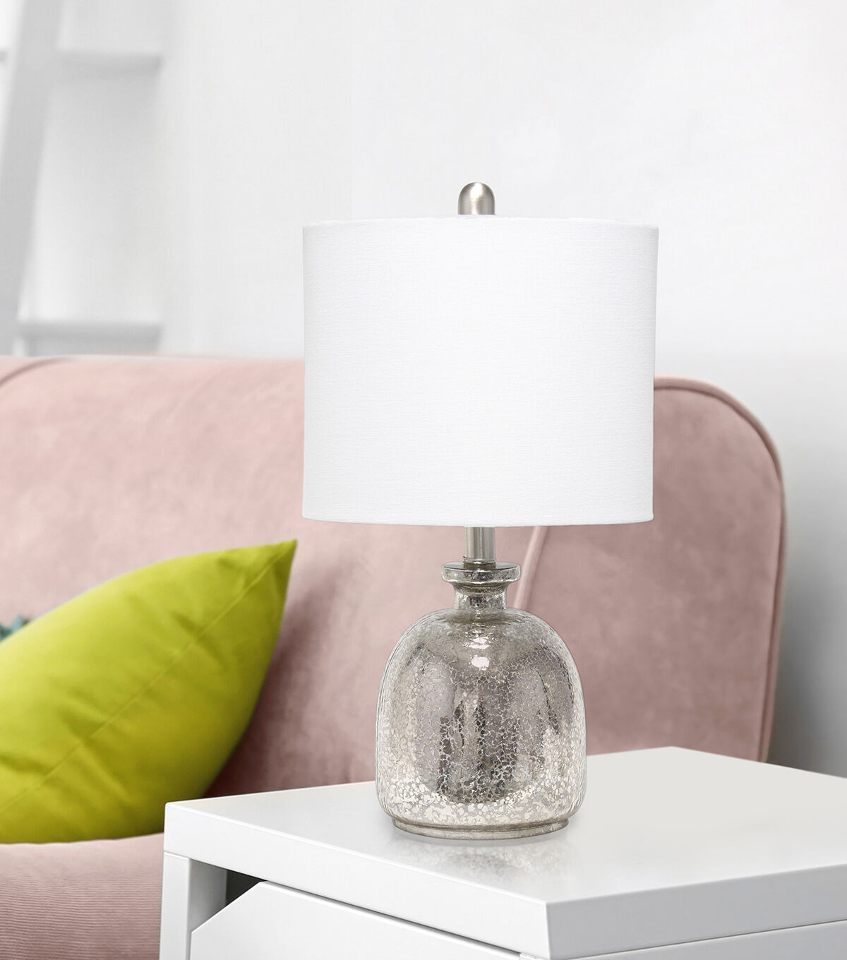 With a textured glass base and white fabric drum shade, this lamp is sure to update any room in your home with a little charm. This lovely lamp is crafted with an open bottom glass base in mercury. Perfect for adding the little refresh to your living room, bedroom, foyer or office that you've been looking for!