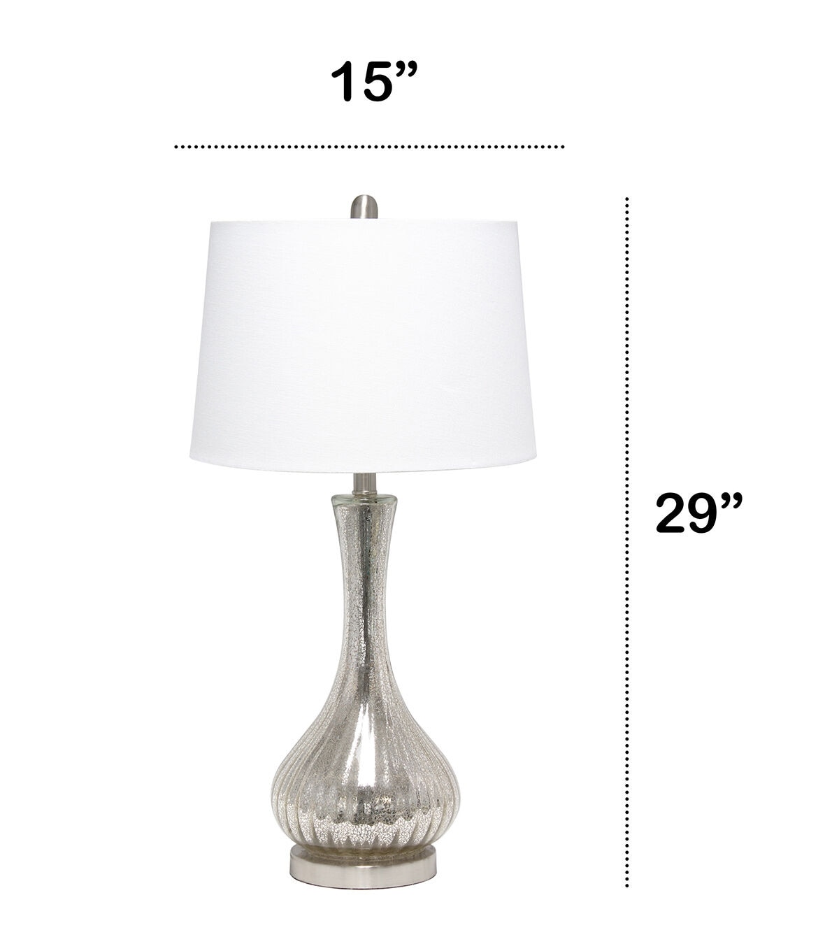 Standing at 29 inches tall, this lamp is sure to make a statement in any room. The mercury glass color of the base and soft curvy lines give this lamp its' lavish look. Perfect for large foyers, bedrooms, living rooms or offices!