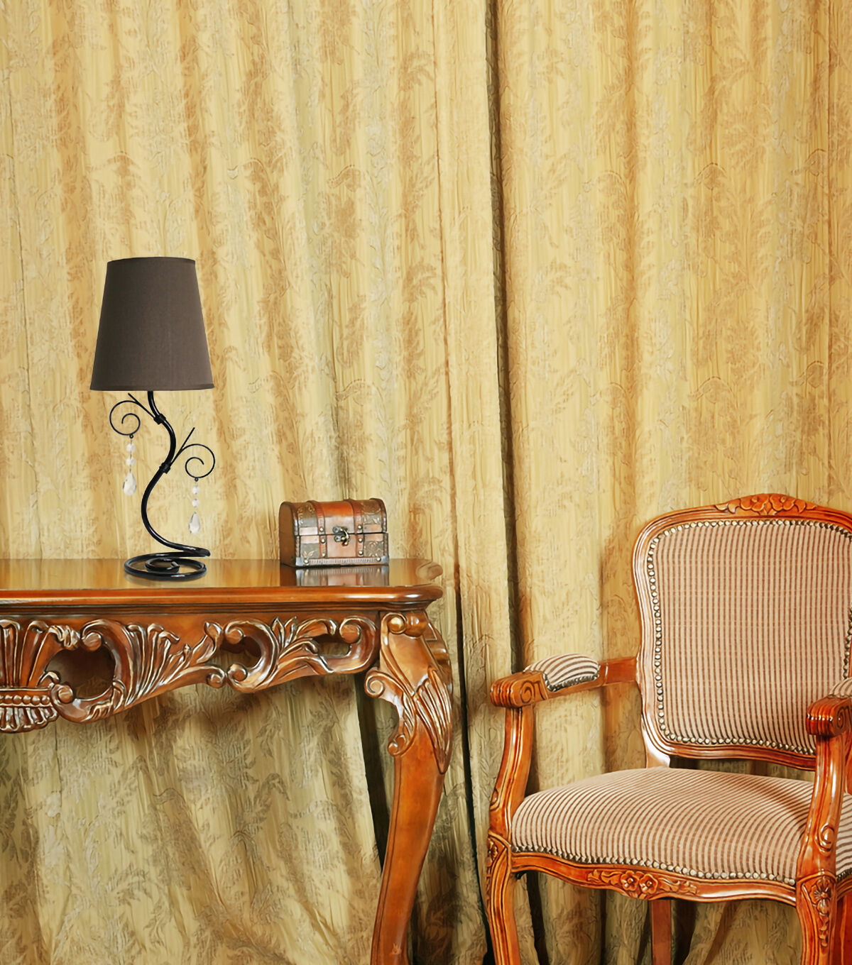 This fashionable table lamp, with its twisted vine base, fabric shade, and hanging crystals, will add style and pizzazz to any room. We believe that lighting is like jewelry for your home. Our products will help to enhance your room with elegance and sophistication.