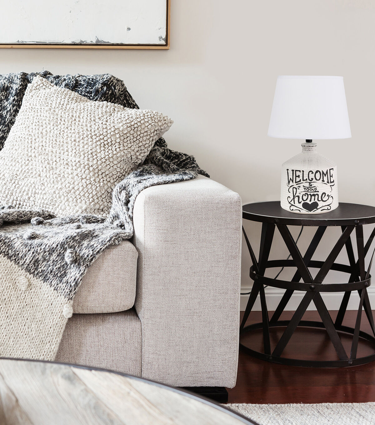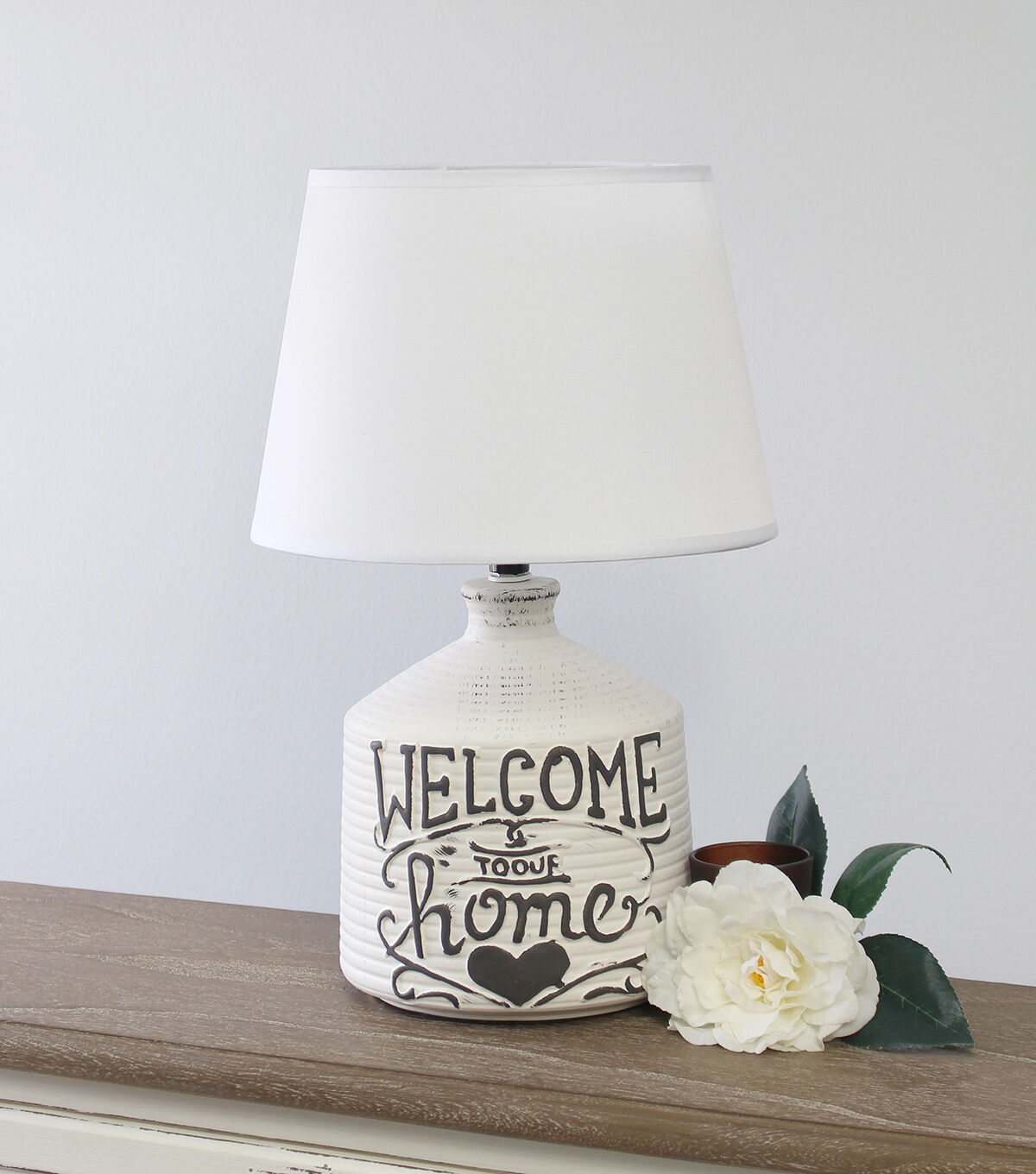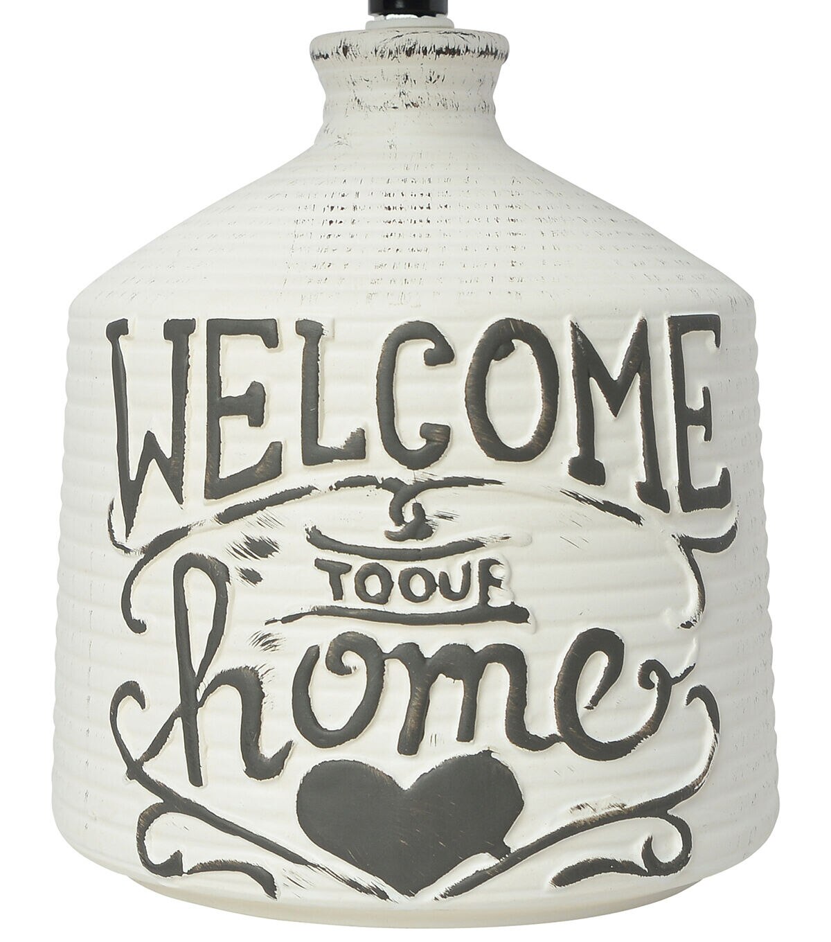 - White wash ridged ceramic base with "Welcome to our home" design