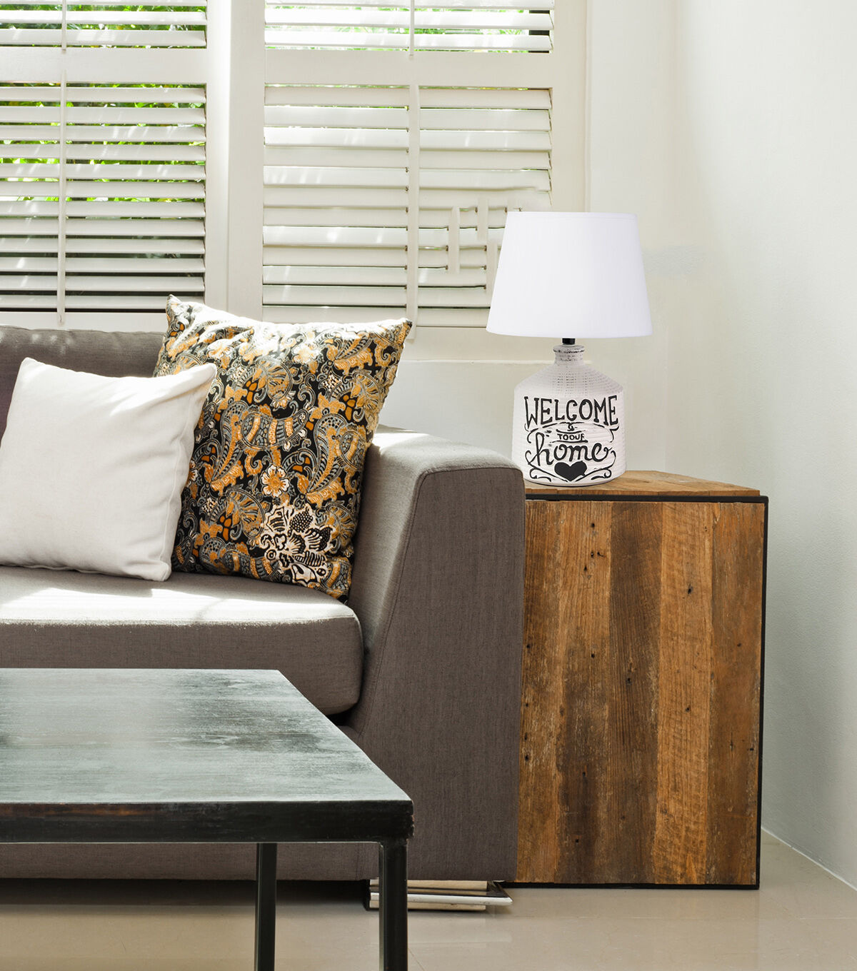 Check out this fine-looking jugular shaped table lamp spruced with a bit of a rustic appeal. A washed out and slightly unfinished ceramic base is decorated with a black written script and paired with a white linen fabric shade. In today's world of interior design, this lamp is the farmhouse or countryside lover's ideal lamp find.