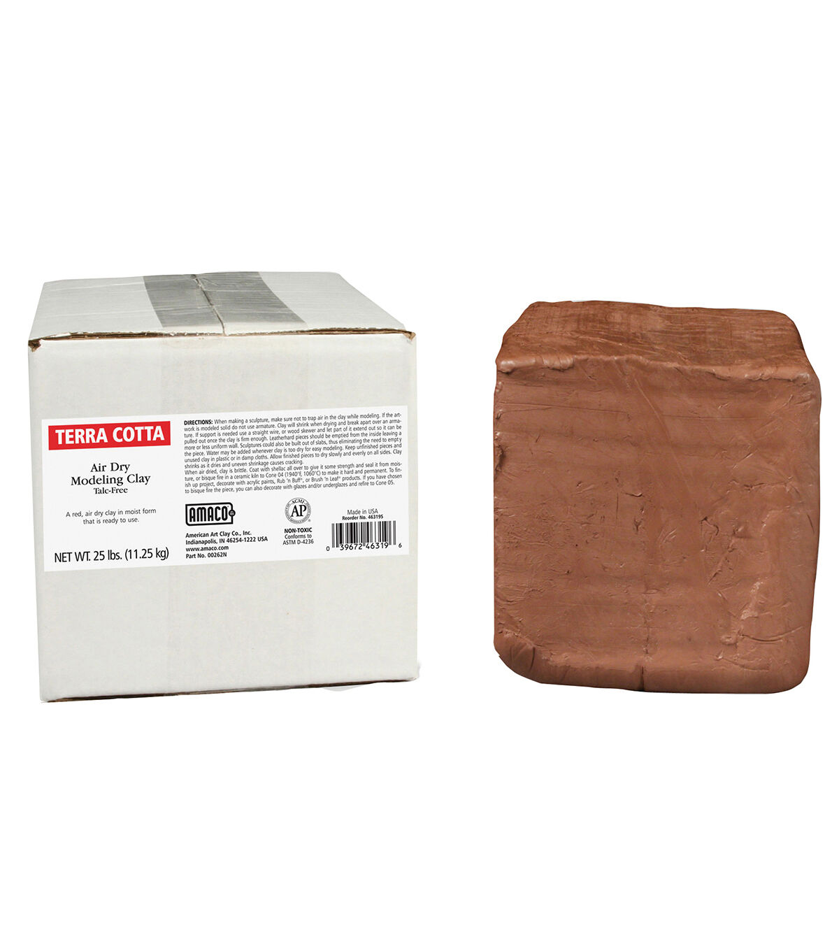 Our inexpensive air dry clay is perfect for sculpting, hand modeling or throwing on a potter's wheel. Air Dry your finished pieces slowly and evenly on all sides. Pieces can be decorated with paint. Seal with shellac for strength and to waterproof. Finished pieces can be bisque fired to Cone 04 (1971°F, 1077°C) for hardness/permanency and to glaze. 25lb box of Terra Cotta.