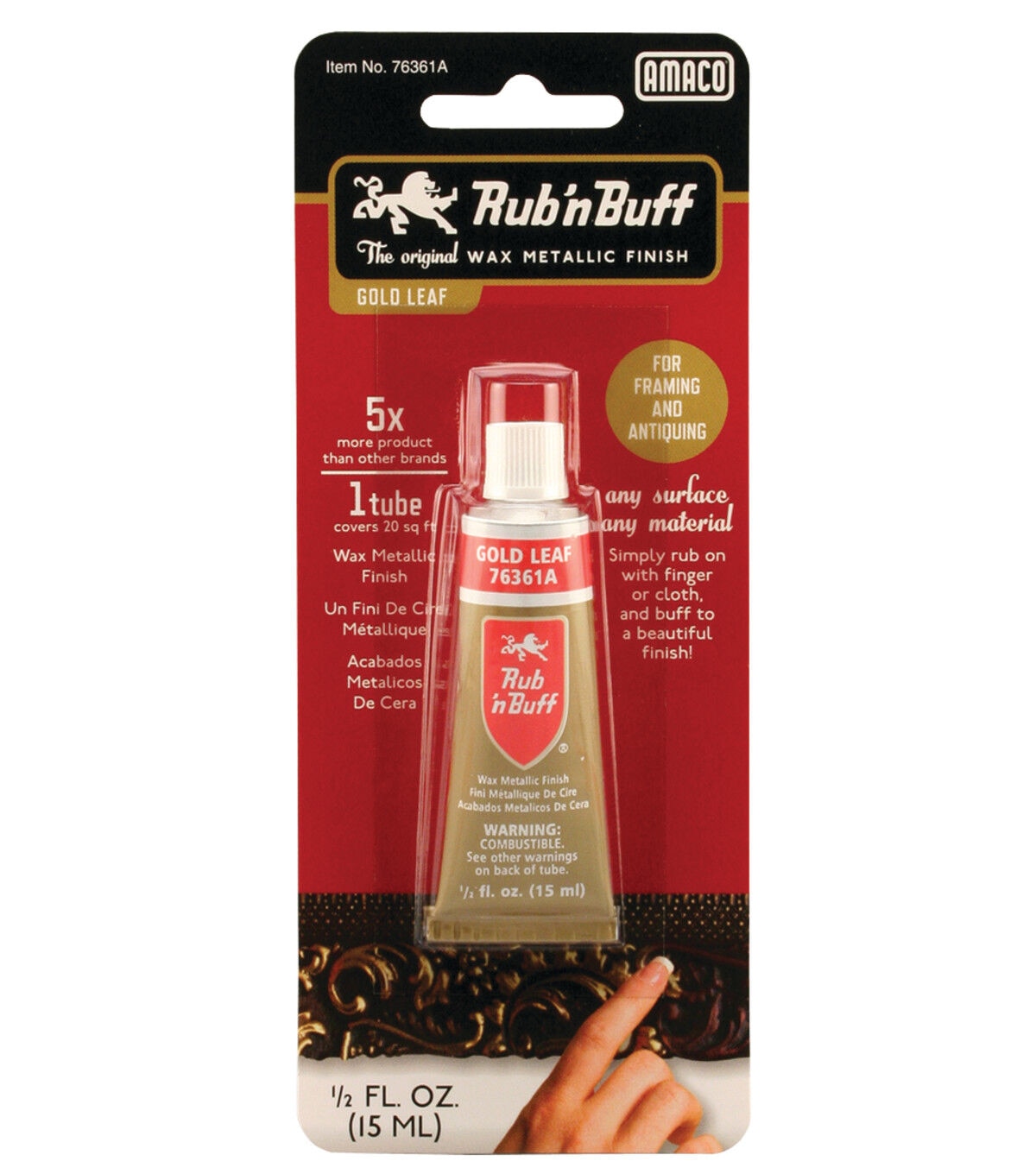 Lend the look and luster of antique gold to your craft and decor projects with the Amaco Rub 'n Buff Metallic Wax Finish-Gold Leaf. Easy to use, this lustrous wax base can be used on a fine finished wood, metal, glass, ceramics, paper, plaster or plastic. You can also mix it with other colors, and then gently buff it with a finger or soft cloth to bring it to a lovely luster.