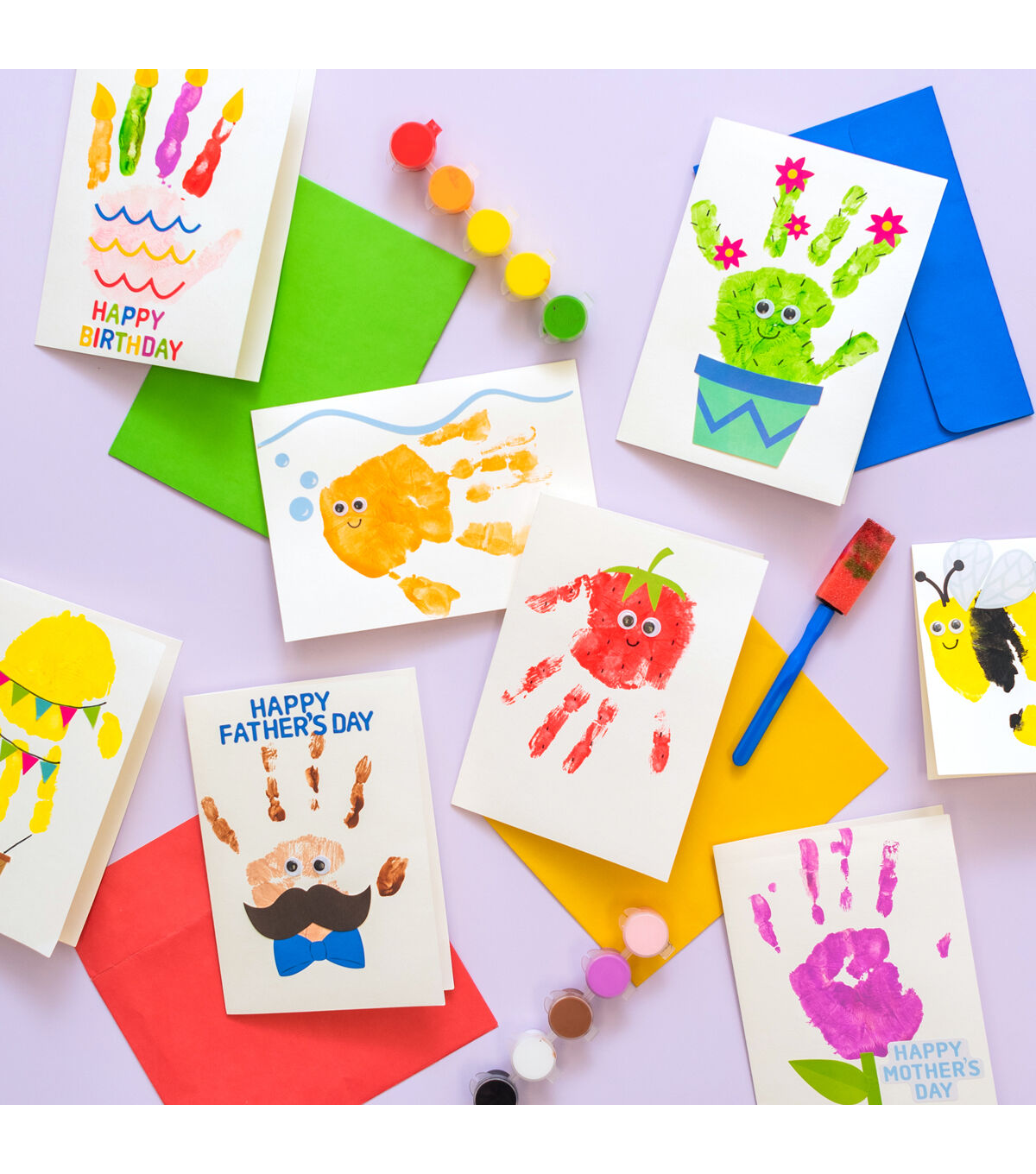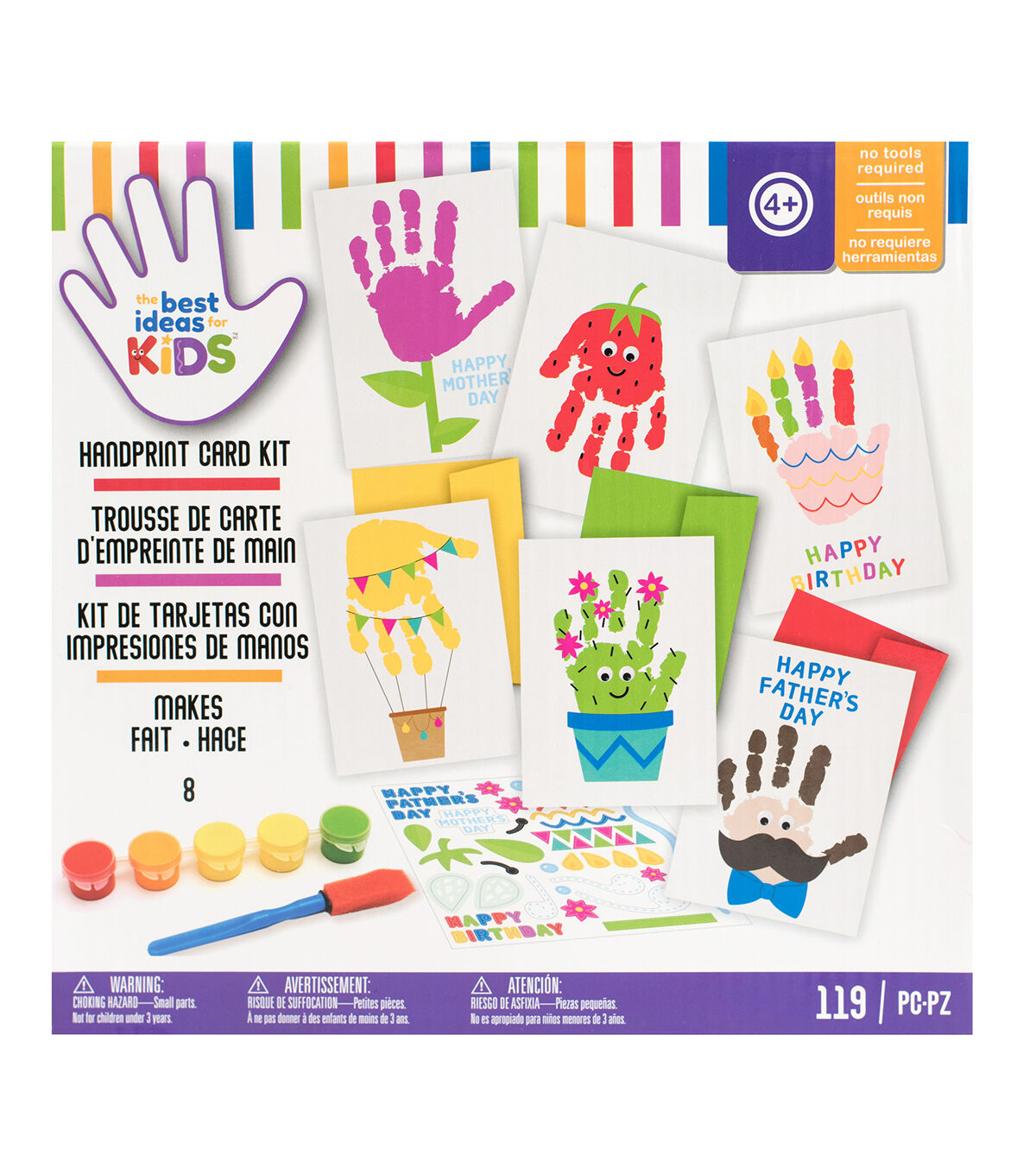 Now is the perfect time to get crafty, and Best Ideas for Kids is the best place to start. Handprint cards are awesome for any holiday or occasion, and are easily customized. This kit includes: 10 acrylic paints, 1 foam brush, 10 google eyes, 1 black marker, 8 glue dots, 1 sheet of stickers, 3 diecut cardstock shapes, 10 white cards, 8 printed envelopes, and 1 set of instructions.