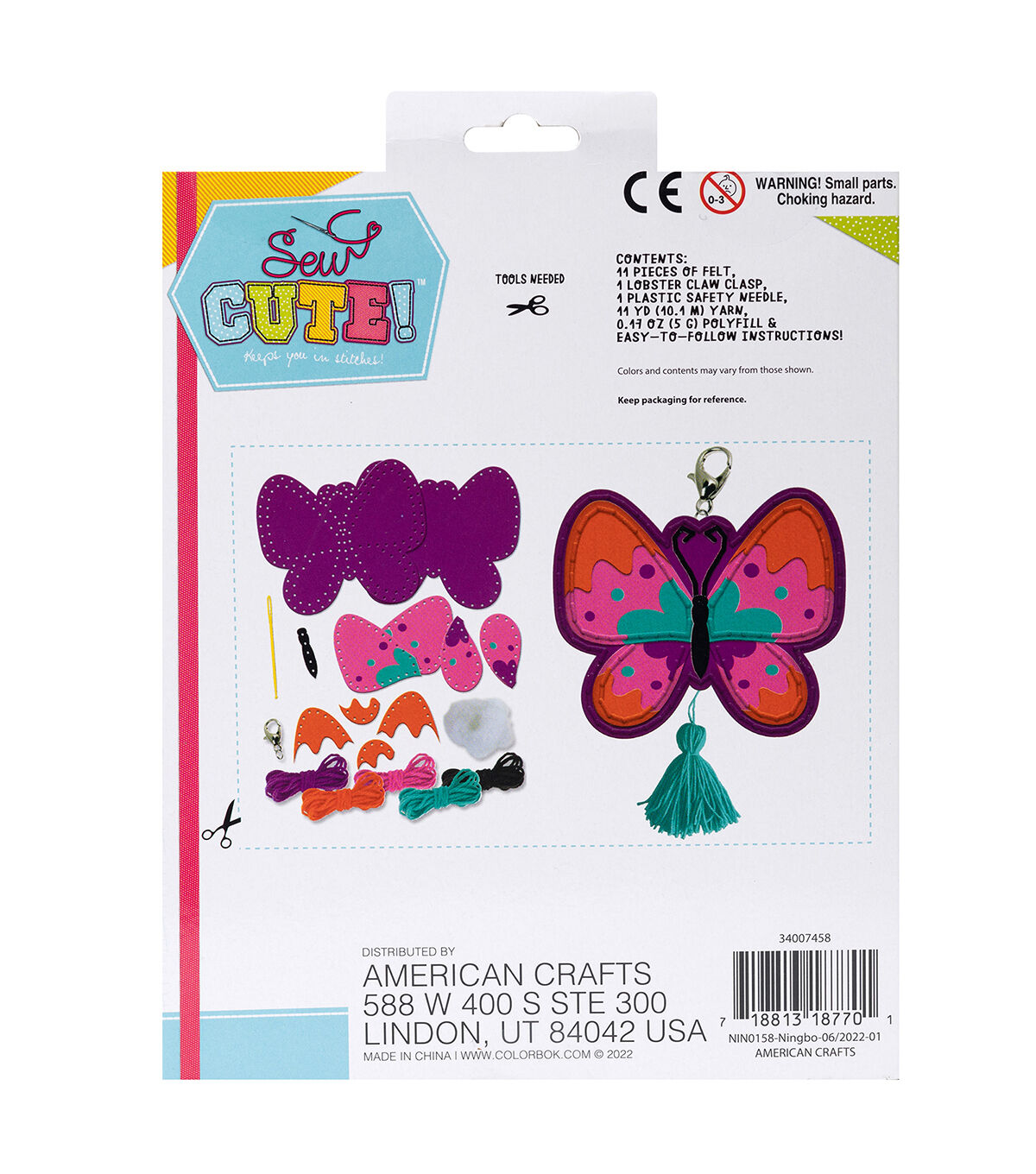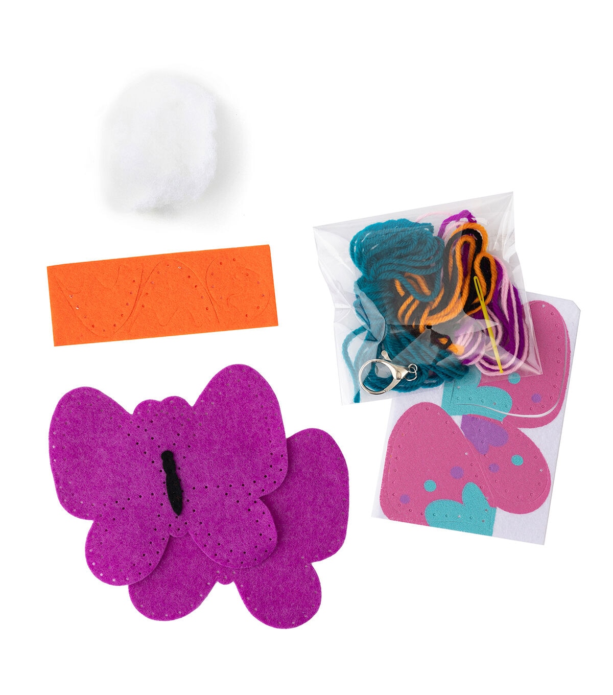 - INCLUDES: 11 pieces of felt, 1 lobster claw clasp, 1 plastic safety needle, 11 yards yarn, polyfill, and instructions