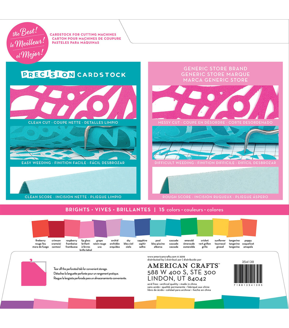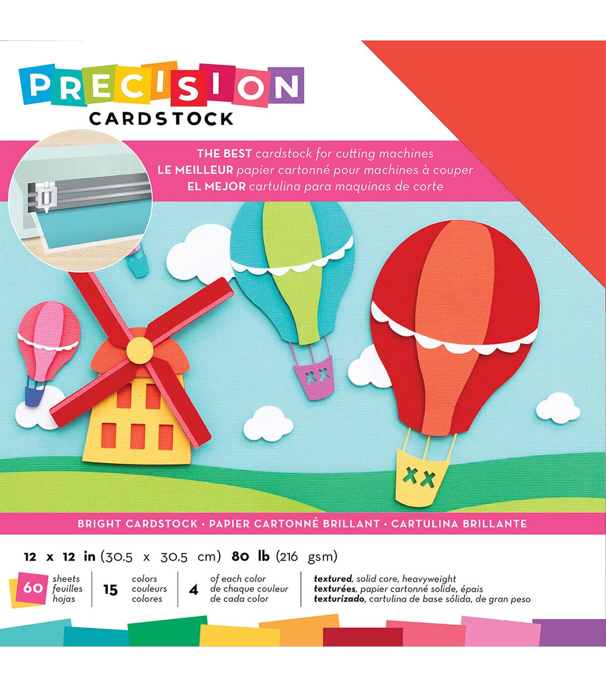 This cardstock is textured, solid core and 80lb (216gsm). Perfect for all cutting machines (sold separately). This package contains 60 12x12 inch sheets of cardstock in 15 colors (four of each color). Acid free. Archival quality. Imported.