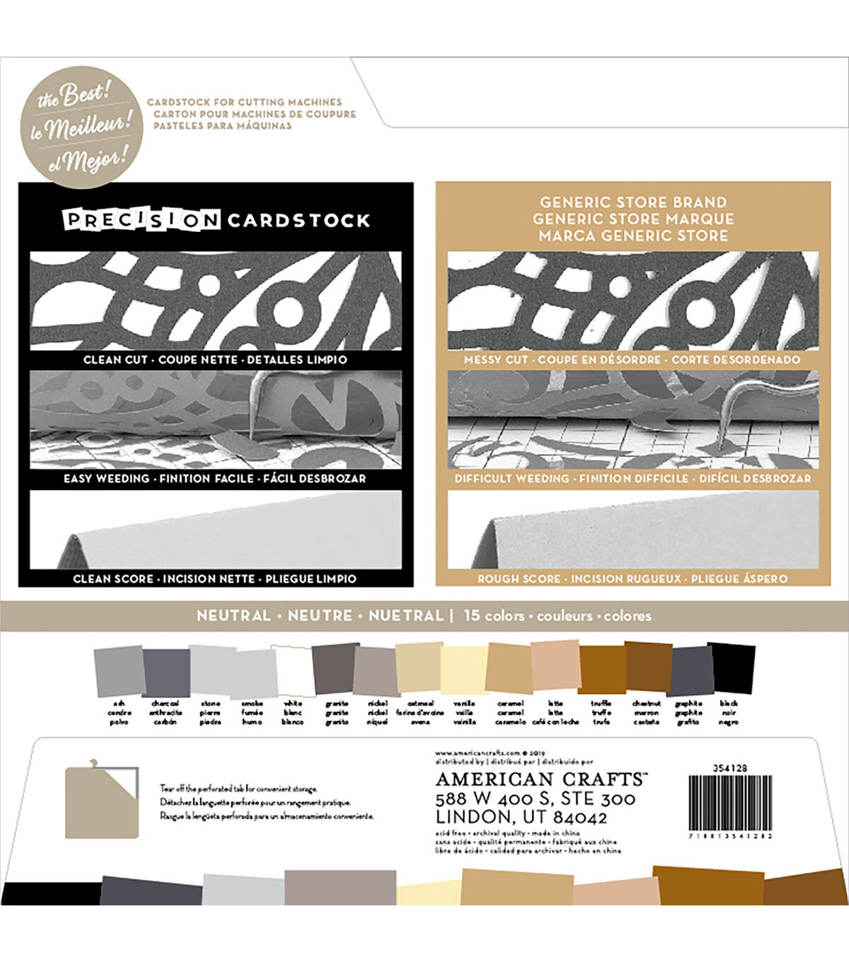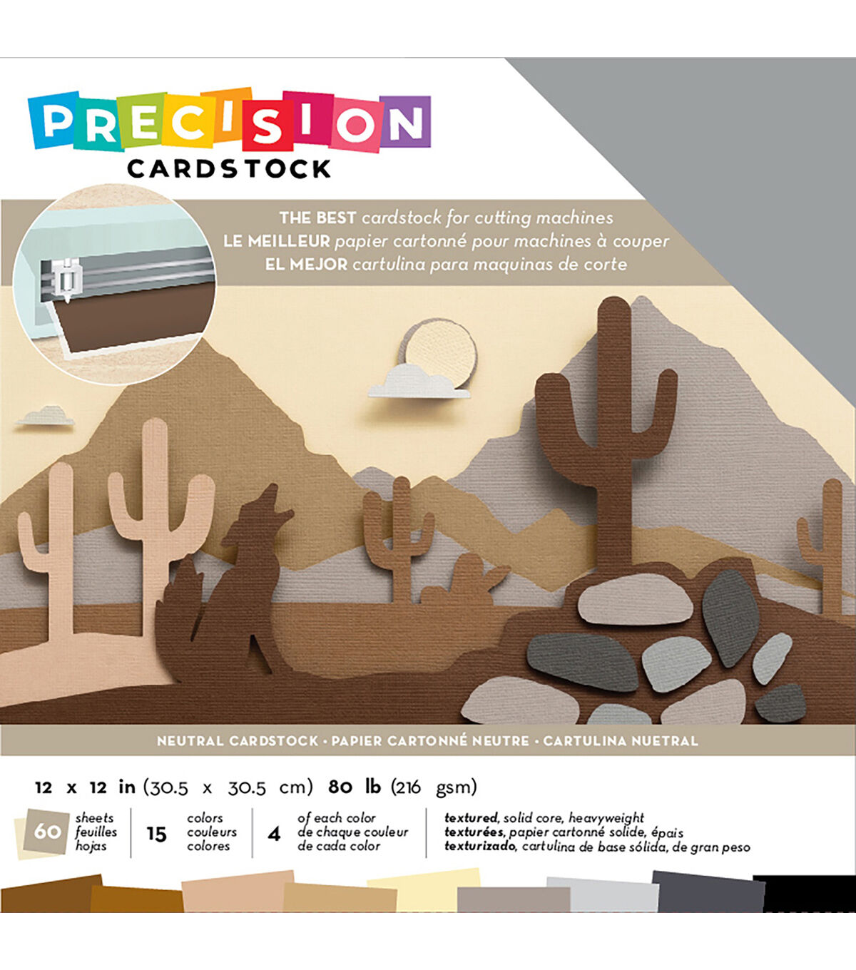 This cardstock is textured, solid core and 80lb (216gsm). Perfect for all cutting machines (sold separately). This package contains 60 12x12 inch sheets of cardstock in 15 colors (four of each color). Acid free. Archival quality. Imported.