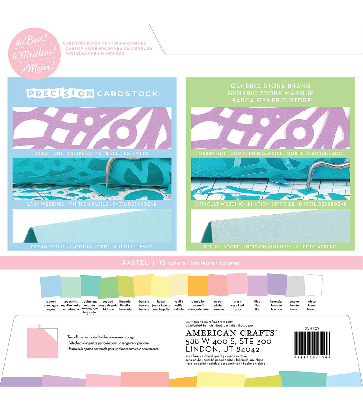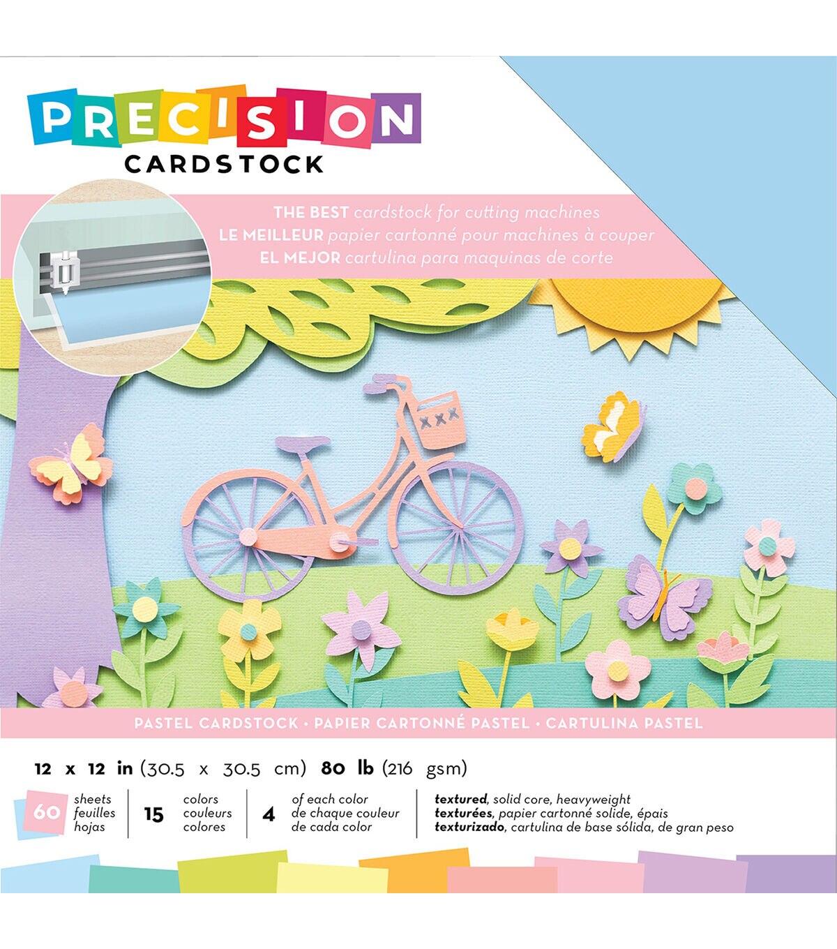 This cardstock is textured, solid core and 80lb (216gsm). Perfect for all cutting machines (sold separately). This package contains 60 12x12 inch sheets of cardstock in 15 colors (four of each color). Acid free. Archival quality. Imported.